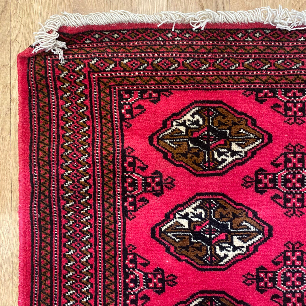 This vintage rug is in very good condition. The design features an all-over pattern set in a red field with white and brown highlights. There is light wear throughout.