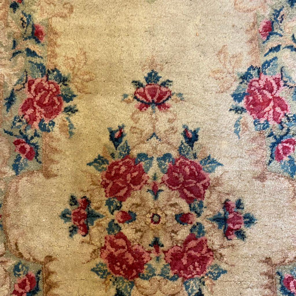 This vintage rug is in good condition. The design features a floral pattern set in a cream field with pink and blue highlights. There is wear throughout and some minor blemishes as seen in the photos.