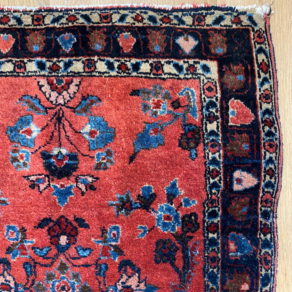 This vintage rug is in good condition. The design features a floral pattern set in a pink field with blue and cream highlights. There is even wear throughout and some areas of moderate wear on the edges as seen in the photos.