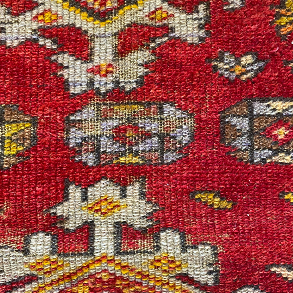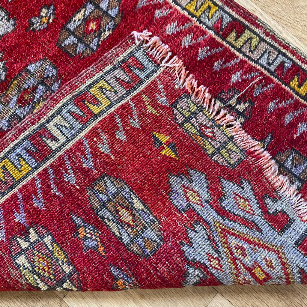 This vintage rug is in good condition. The design features a tribal pattern set in a red field with brown and cream highlights. There is wear on the edges, fringe ends and throughout.