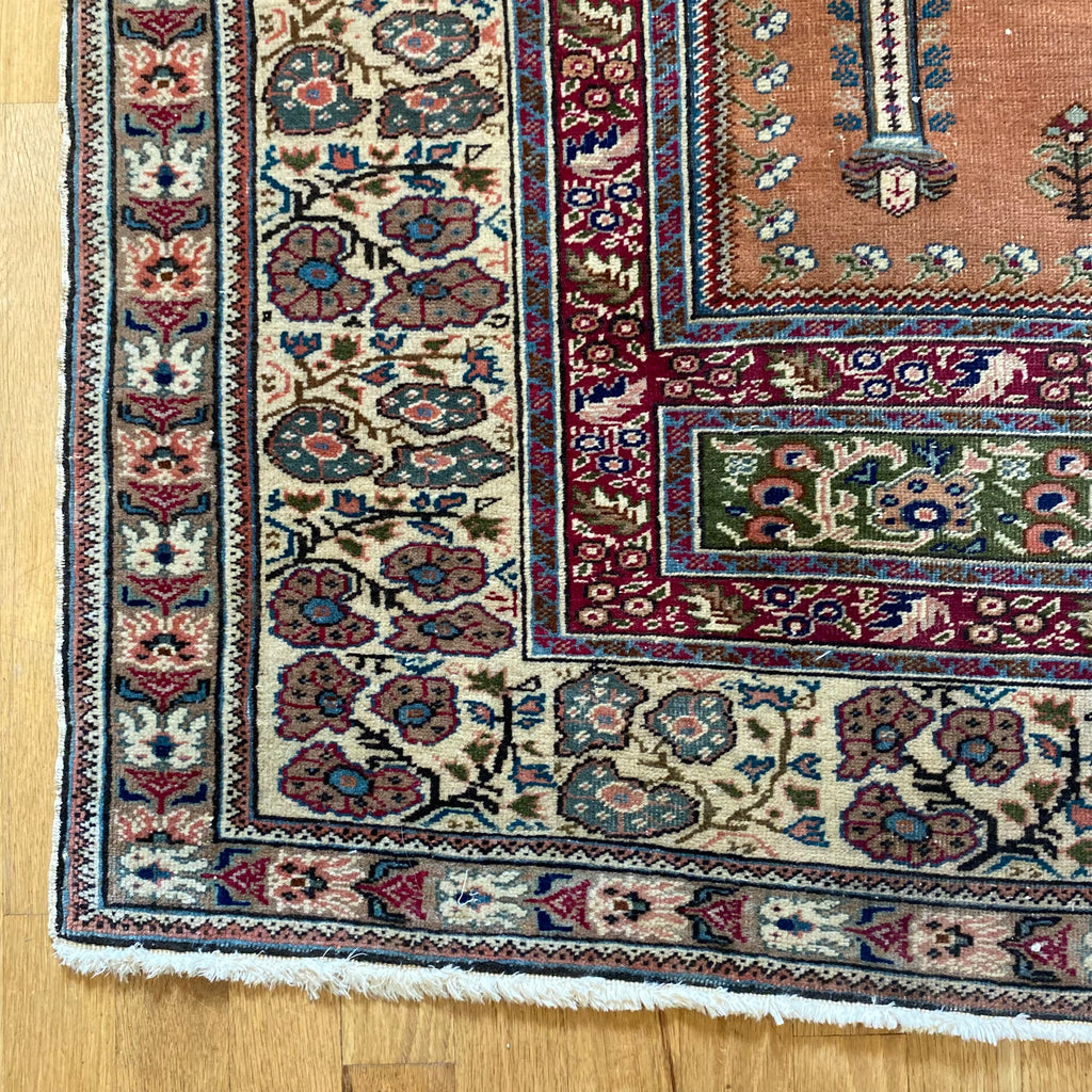 This vintage rug is in very good condition. The field is a soft orange-brown with white, green and blue highlights and a prayer design. There is light wear throughout.
