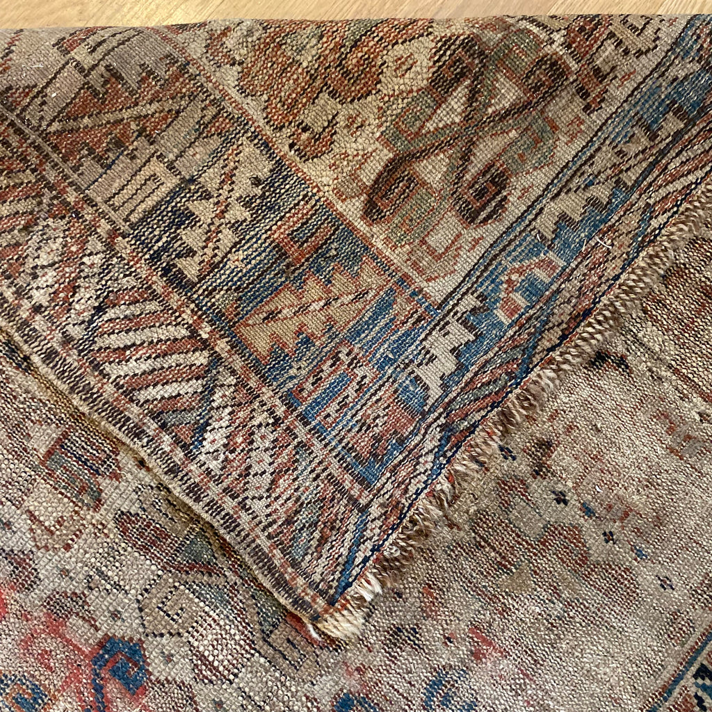 This antique rug is in poor condition. The design features a tribal pattern set in a beige field with blue and brown highlights. There is heavy wear and some repairs throughout as seen in the photos.
