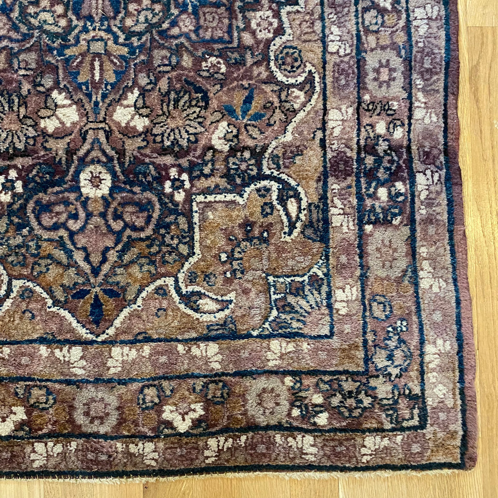 This vintage rug is in good condition. The design features a central medallion set in a light purple-grey field with blue and white highlights. There is wear on the edges, fringe ends and throughout as seen the photos.