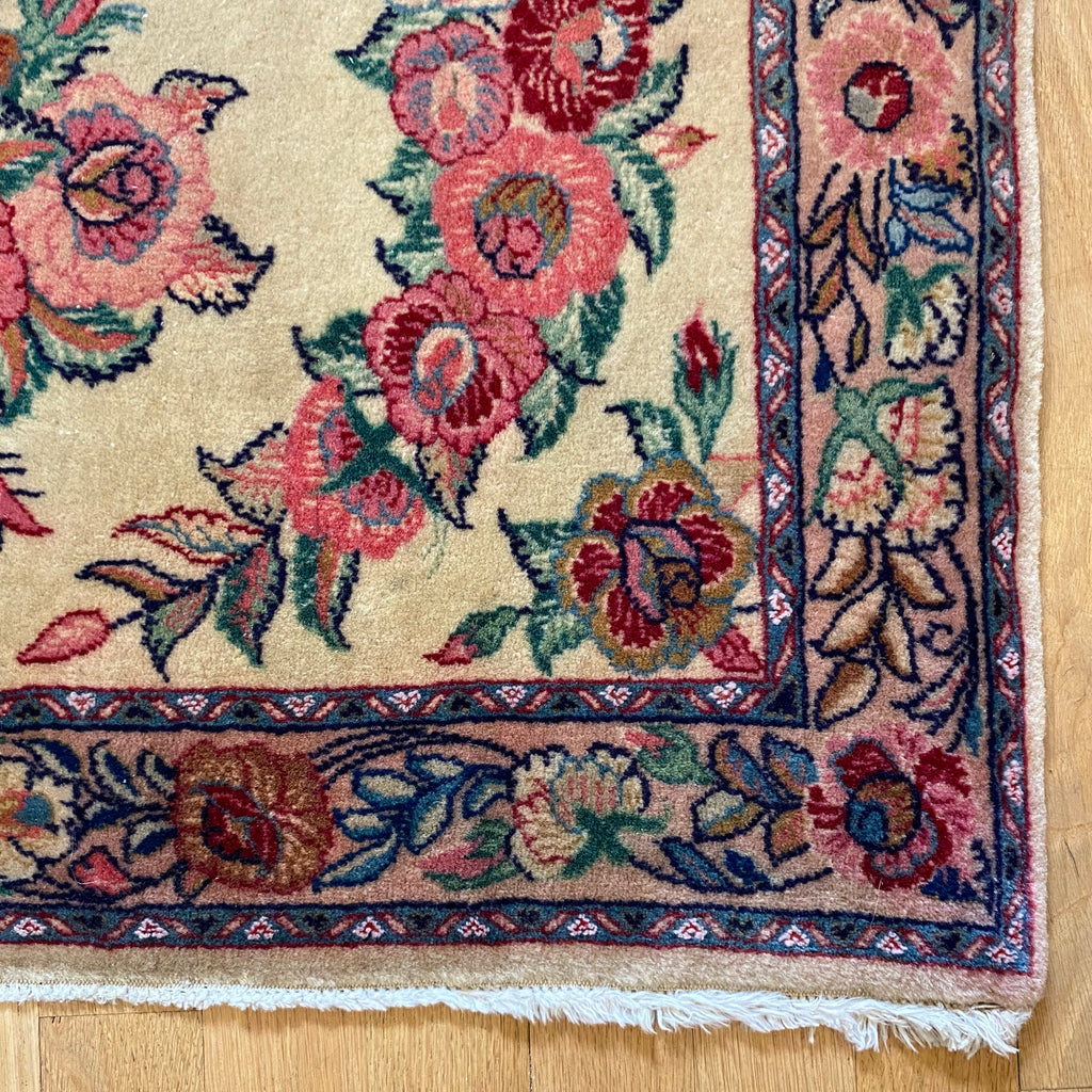 This vintage rug is in very good condition. The design features a floral pattern set in a cream field with blue and pink highlights. There is light wear throughout.