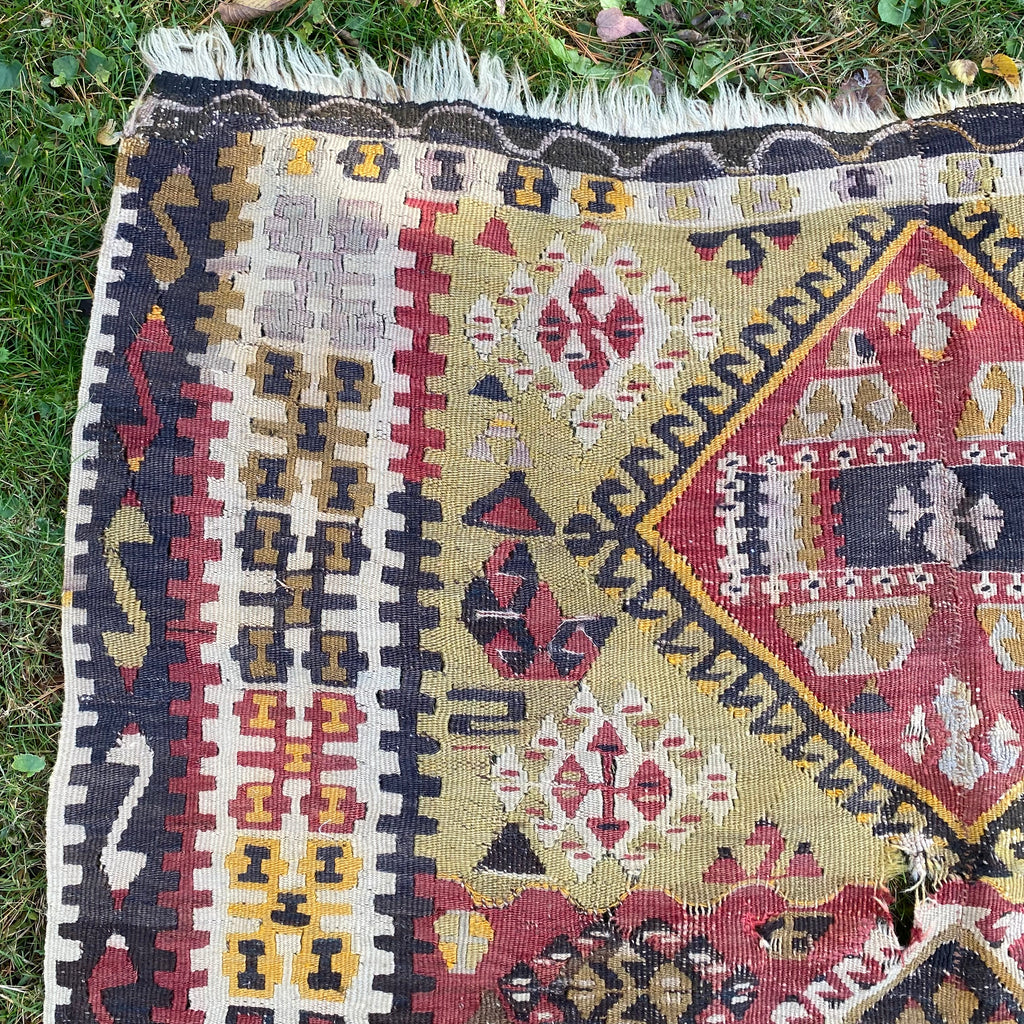 This vintage rug is in poor condition. The design features a tribal pattern with a red, brown and yellow color scheme. There are several weak areas that need to be re-sewn as seen in the photos.