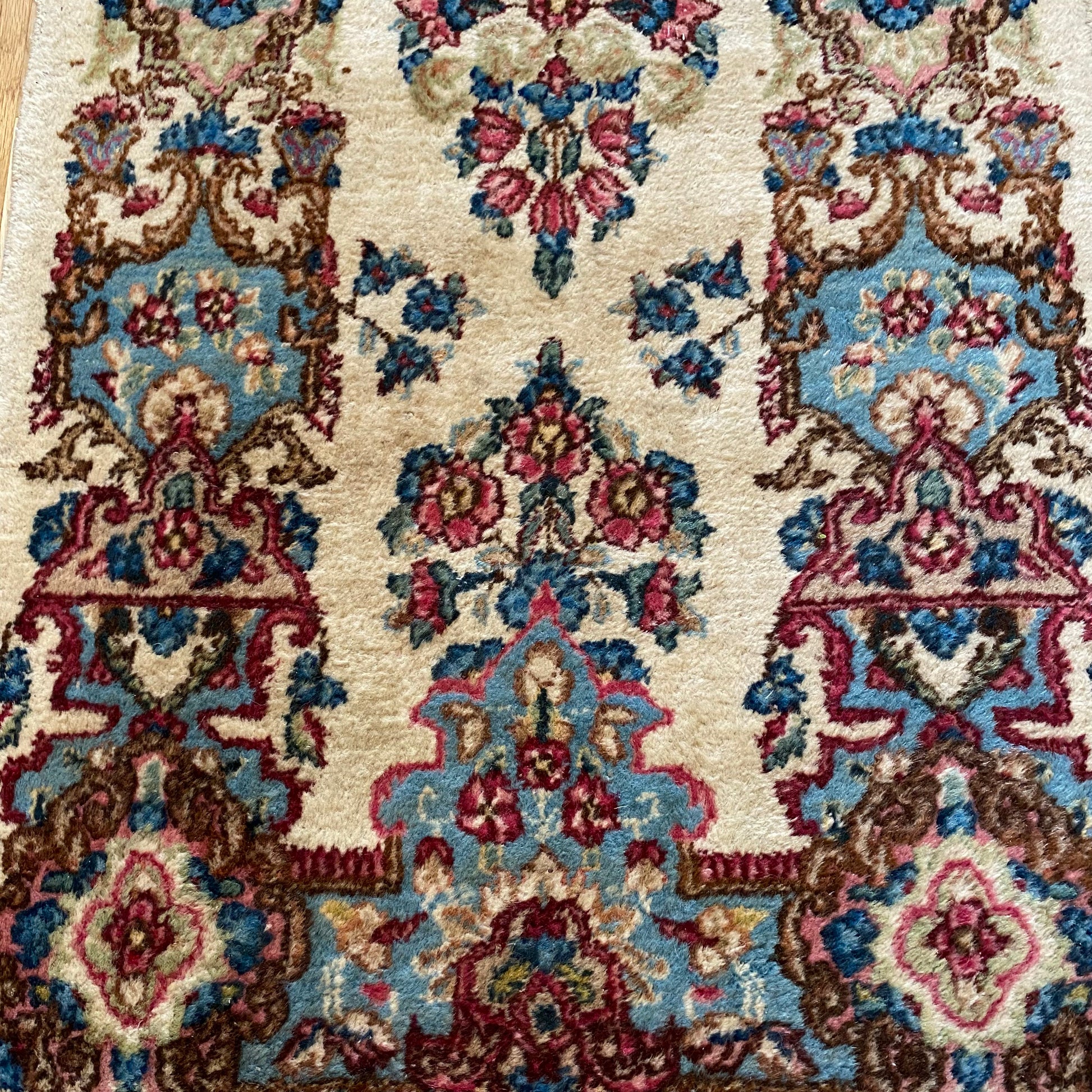 This vintage rug is in good condition. The design features an all-over floral pattern set in a white field with pink and blue highlights. There is wear on the edges, fringe ends and throughout as seen in the photos. There is some discoloration due to wear on the fringe ends.