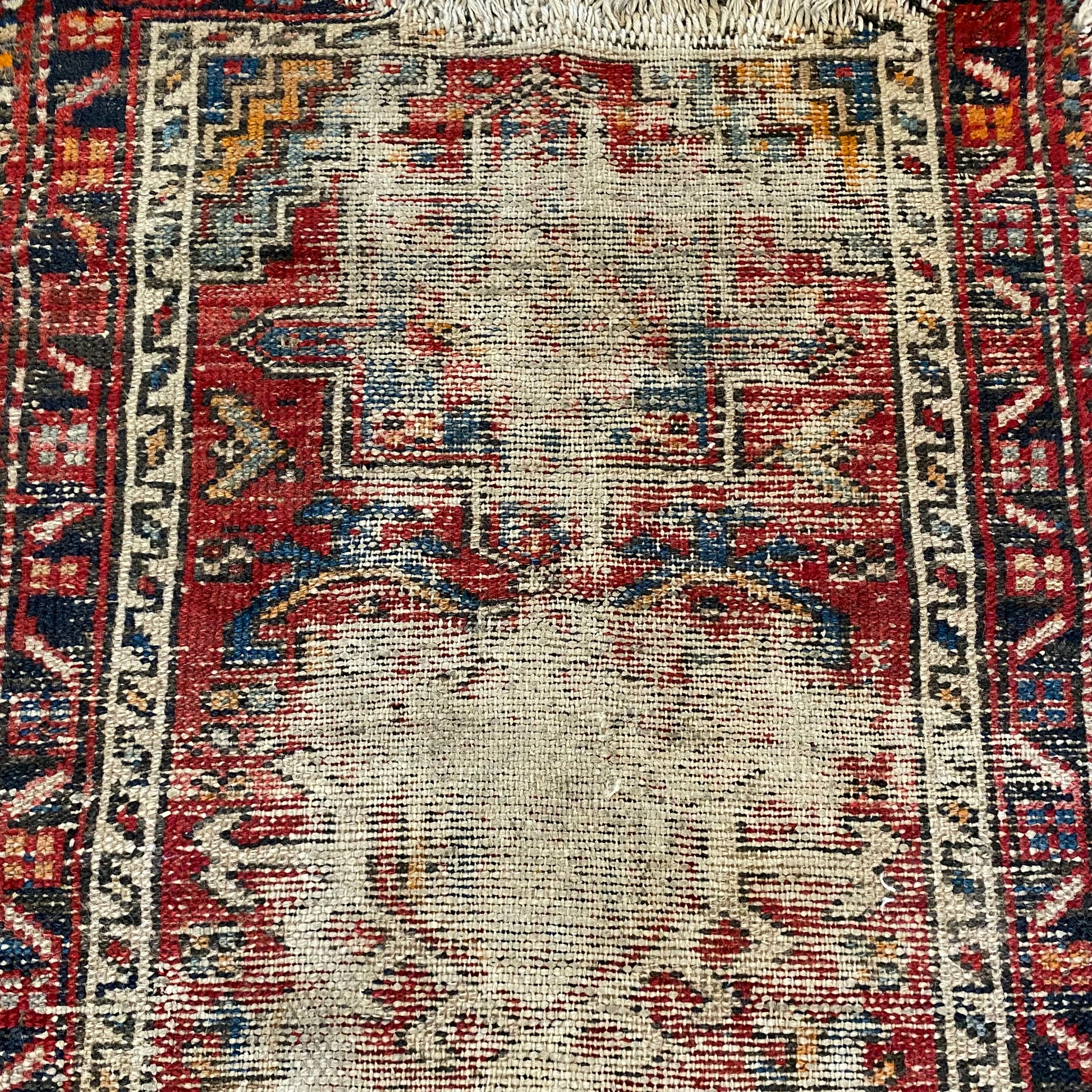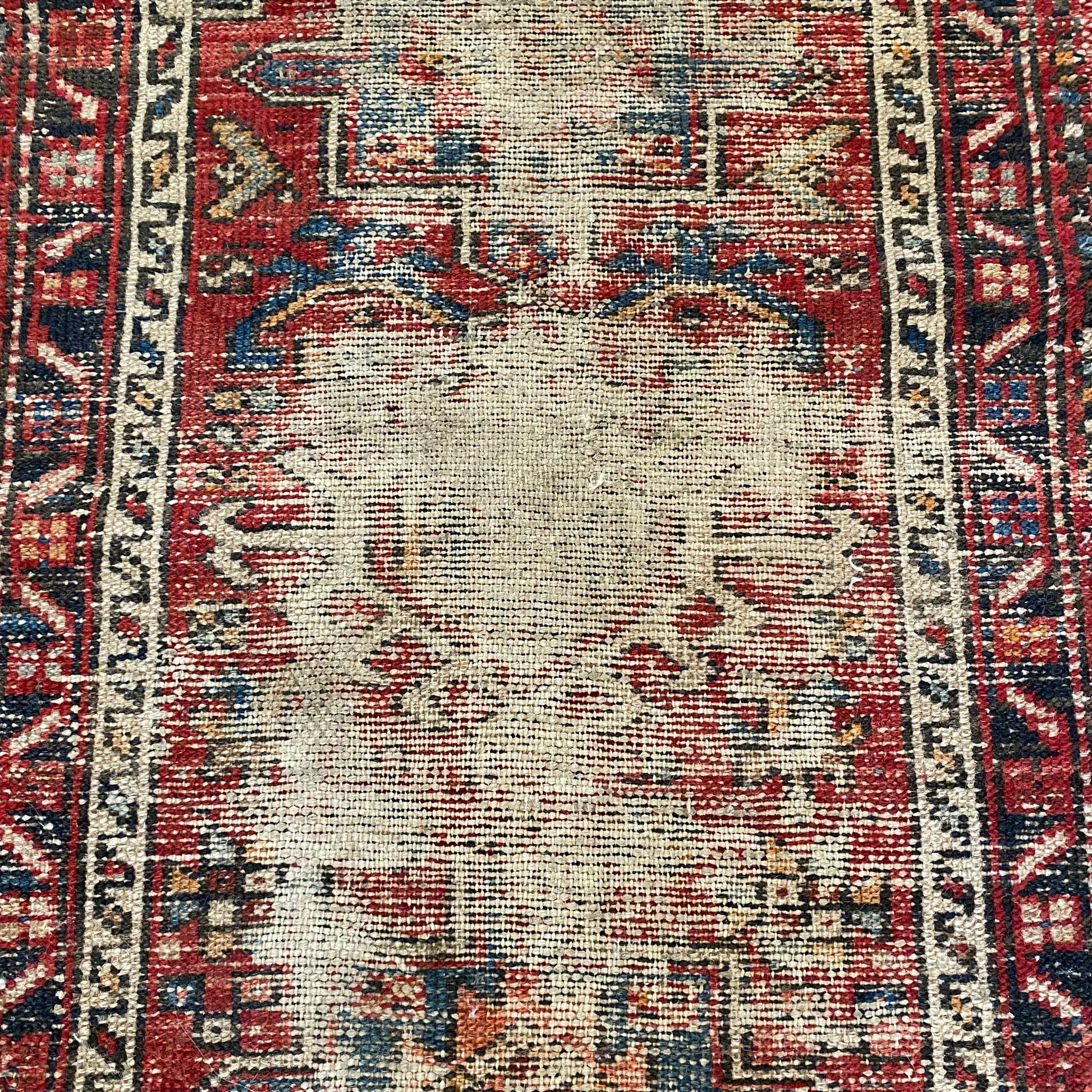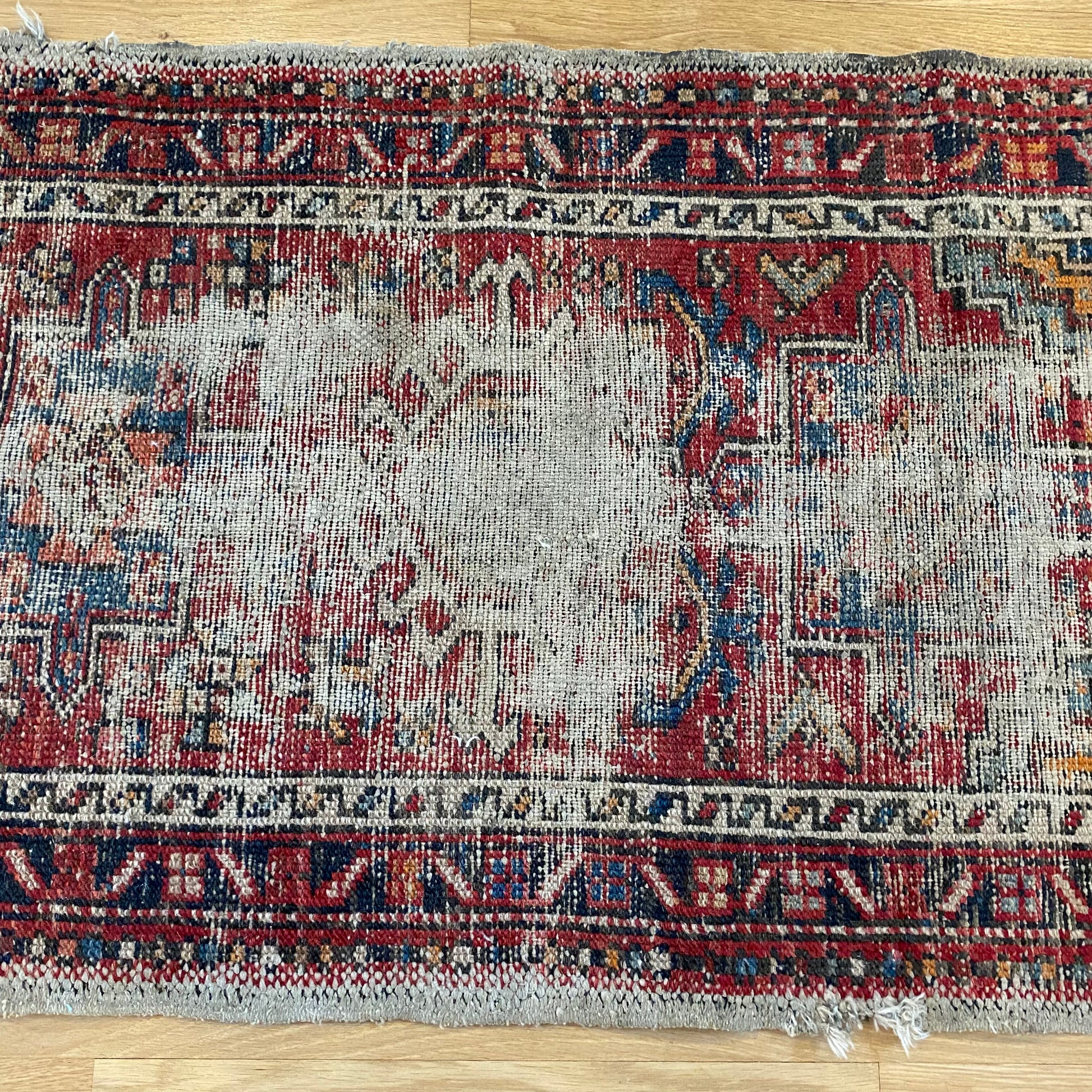 This vintage rug is in poor condition. The design features tribal medallions set in a red field with blue and brown highlights. There is heavy wear throughout and black staining on the edge as seen in the photos.