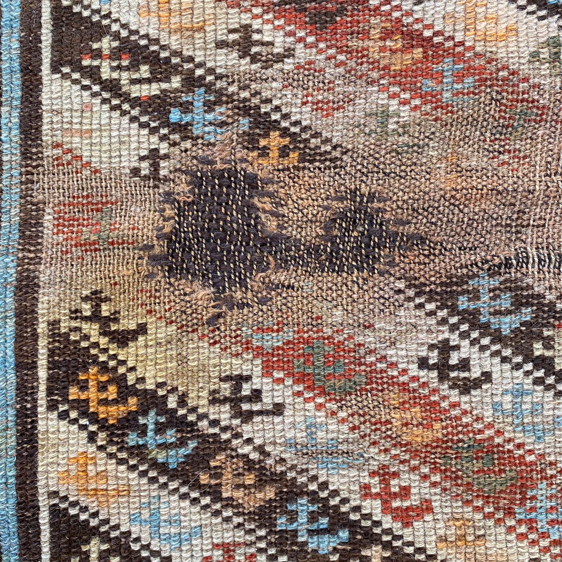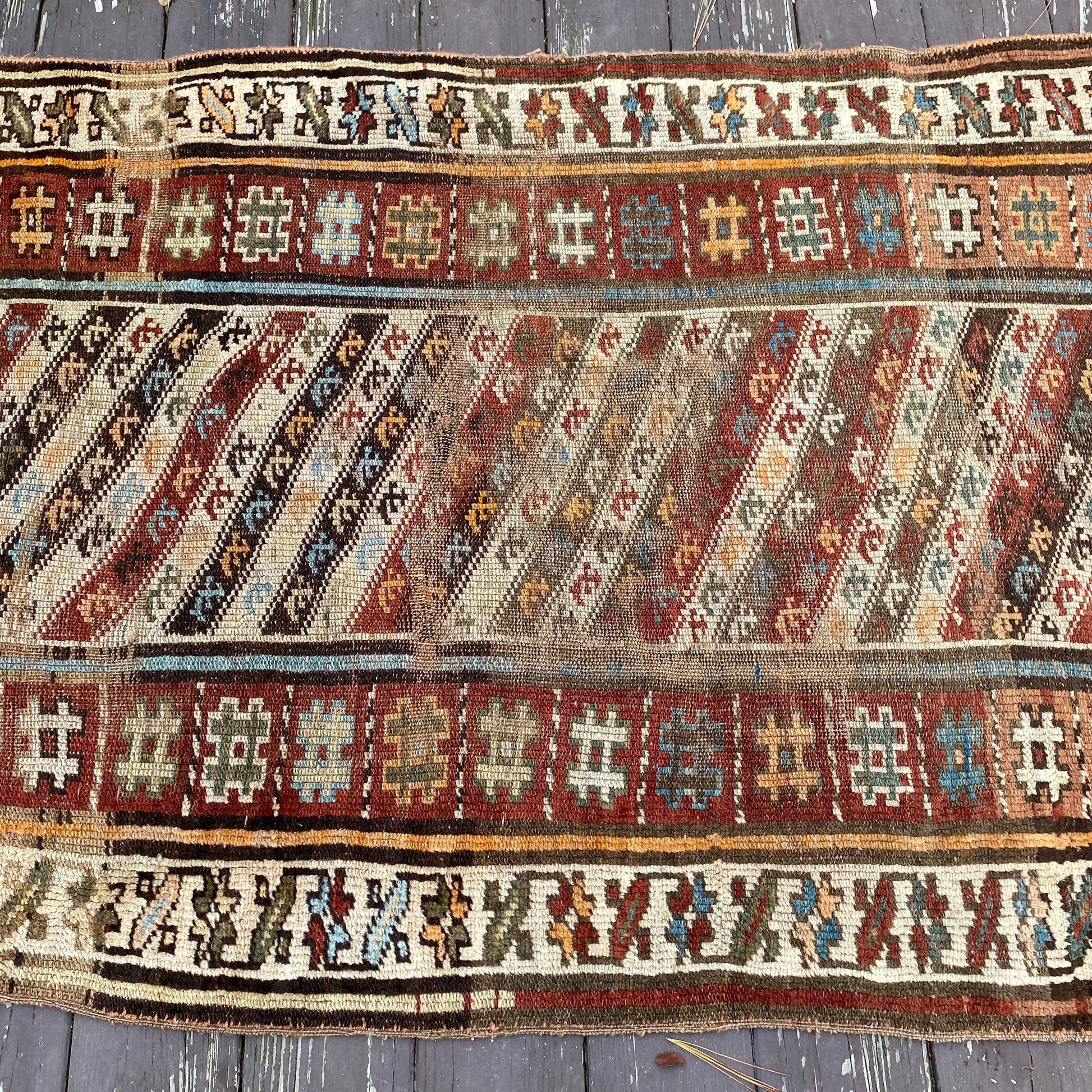 This antique rug runner is in fair condition. The design features a brown, white, blue and red-brown color scheme with alternating stripes. There is heavy wear throughout and a crude repair in the field as seen in the photos.