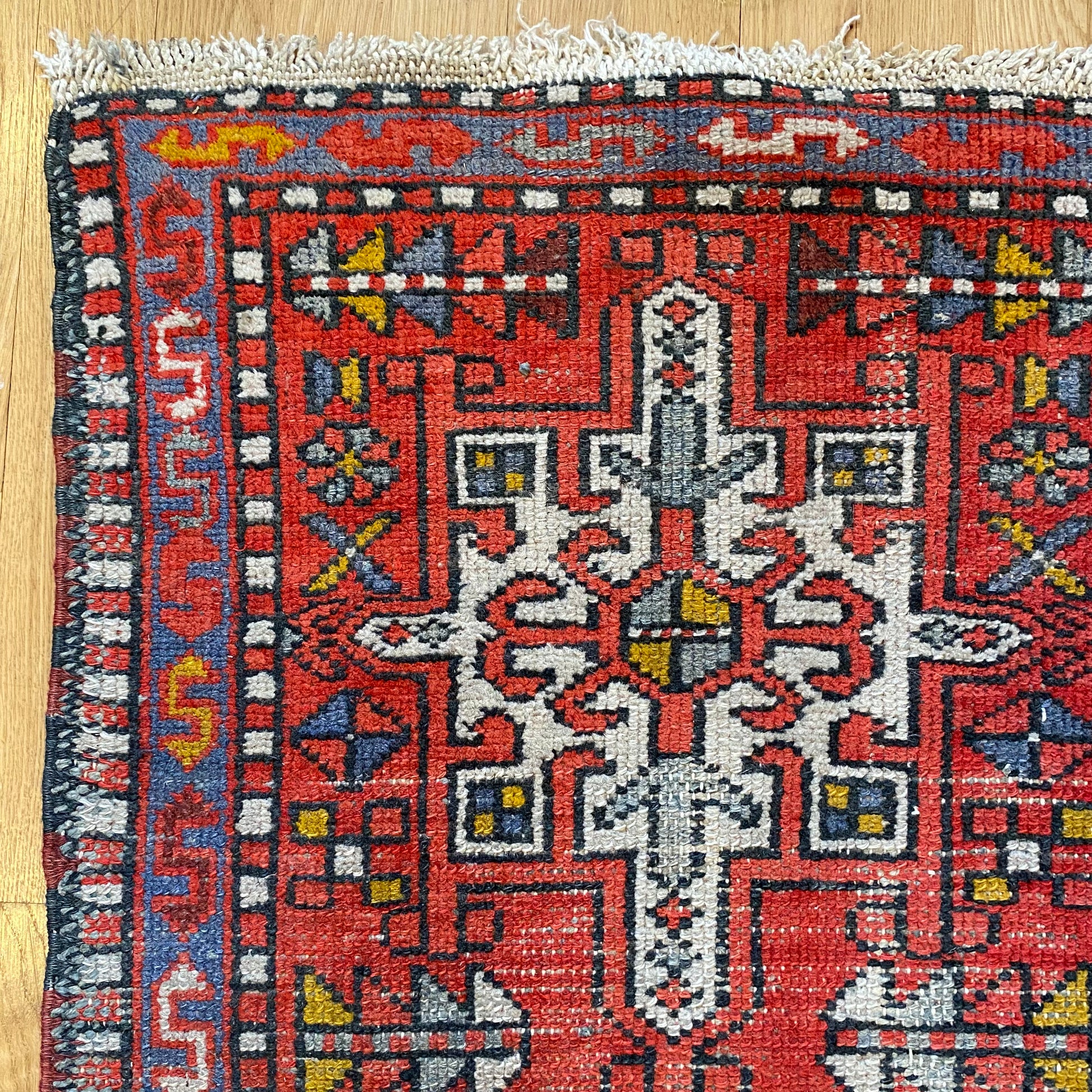 This vintage rug is in fair condition. The design features tribal medallions set in a soft red field with blue and white highlights. There is wear on the edges and fringe ends.