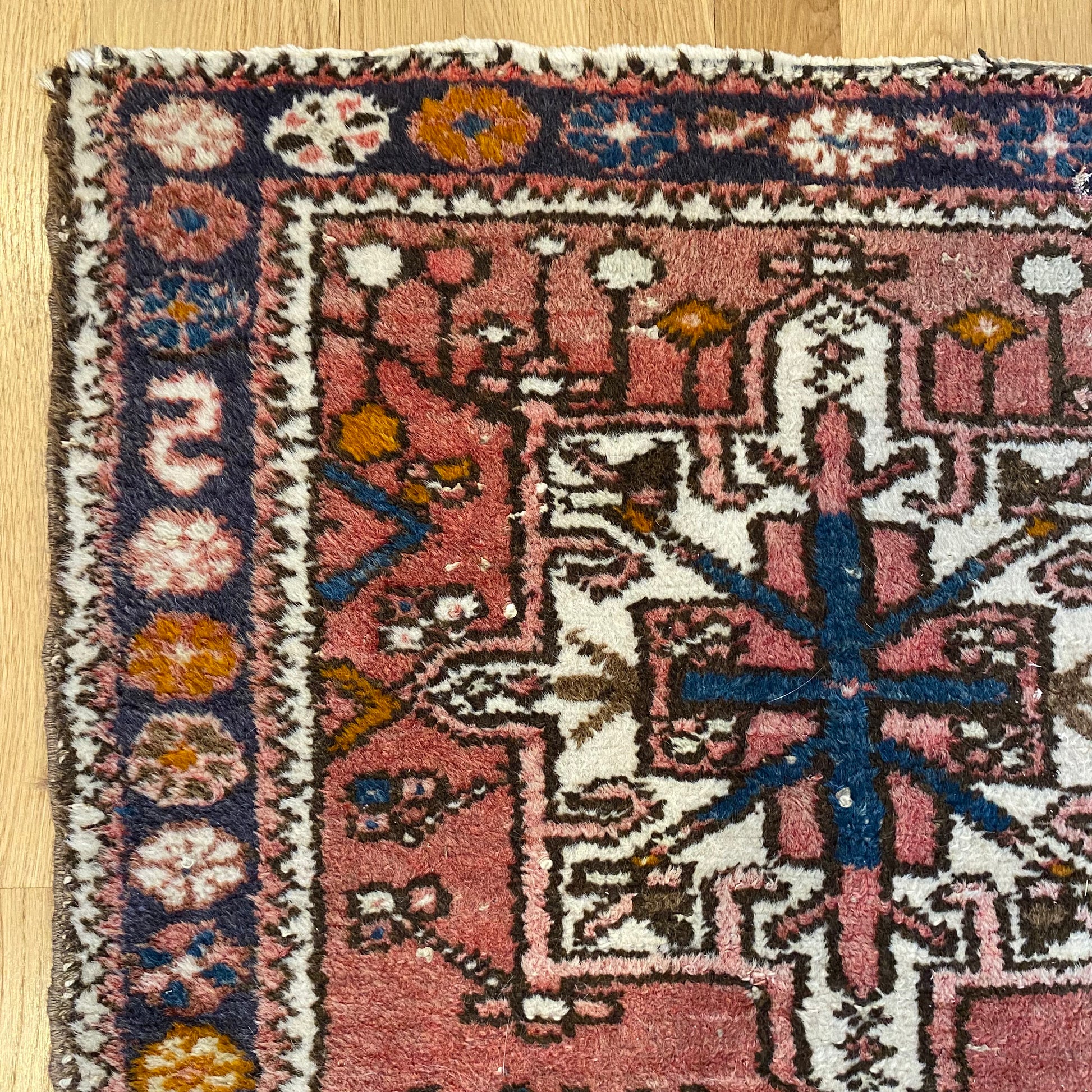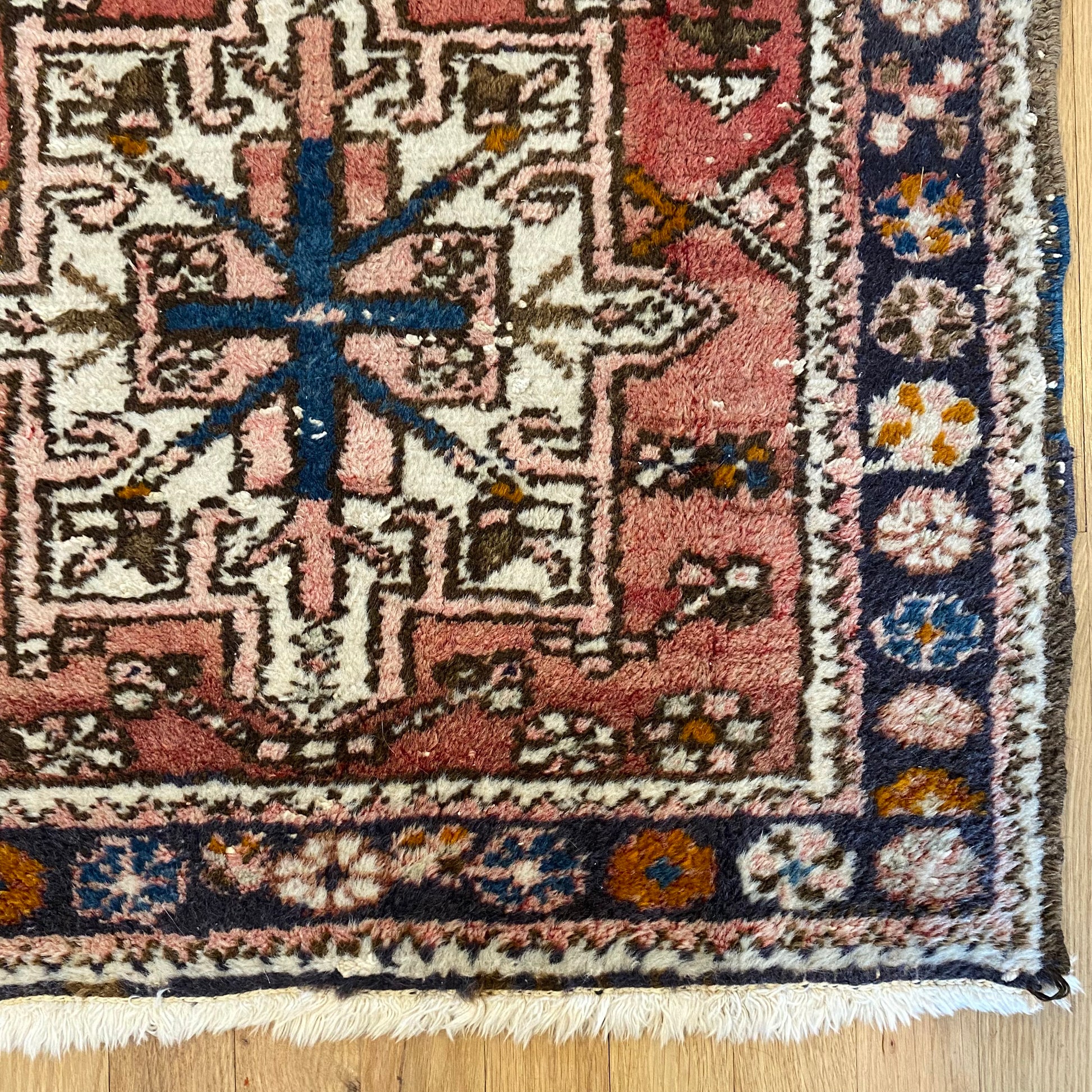This vintage rug is in very good condition. The design features tribal medallions set in a soft red field with white and blue highlights. There is even fading throughout. There is even wear throughout.