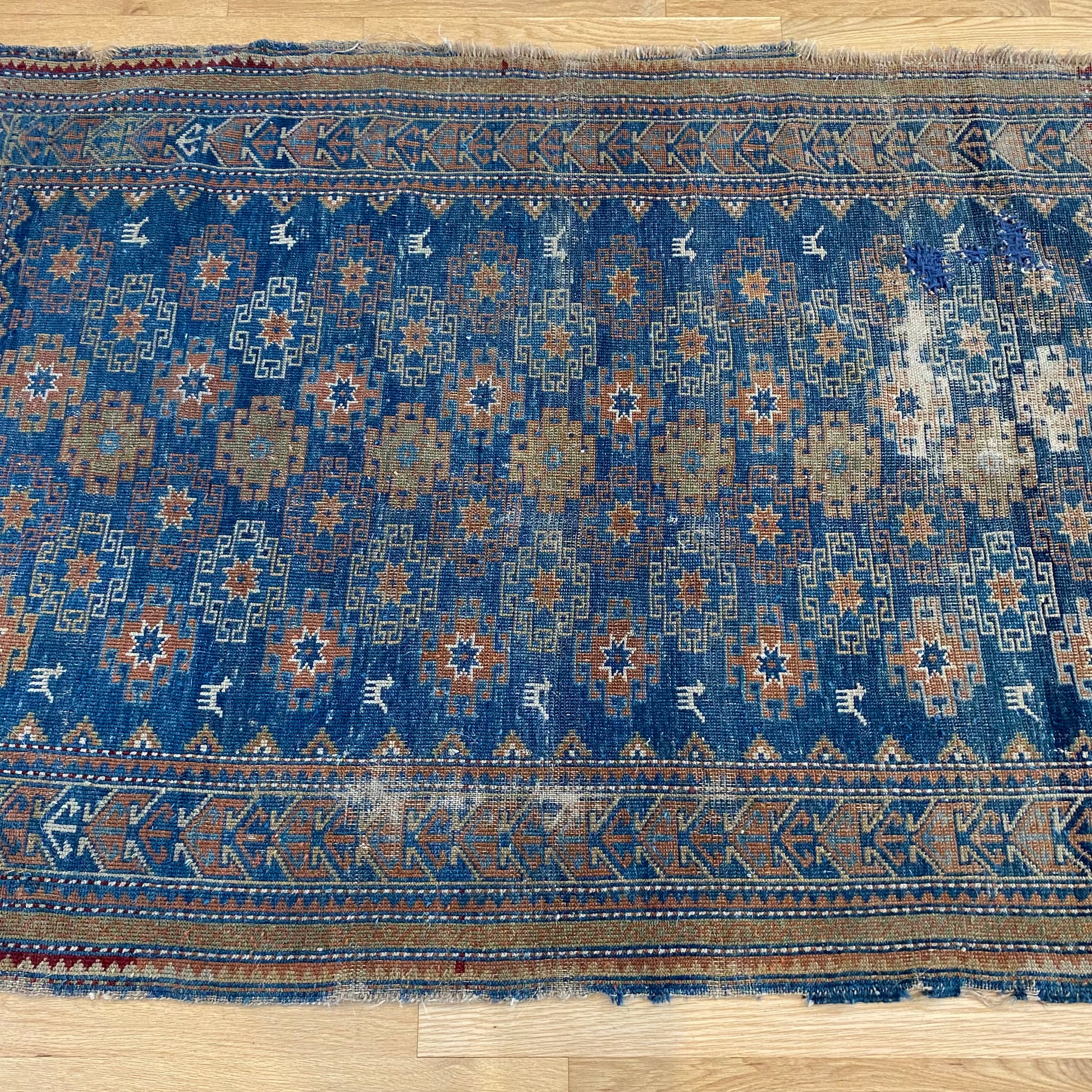 This antique rug is in poor condition. The design features an all-over tribal pattern set in a blue field with white and dark gold highlights. There is wear throughout and several crude repairs as seen in the photos.