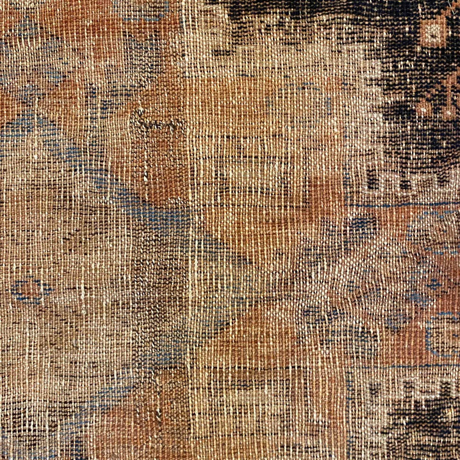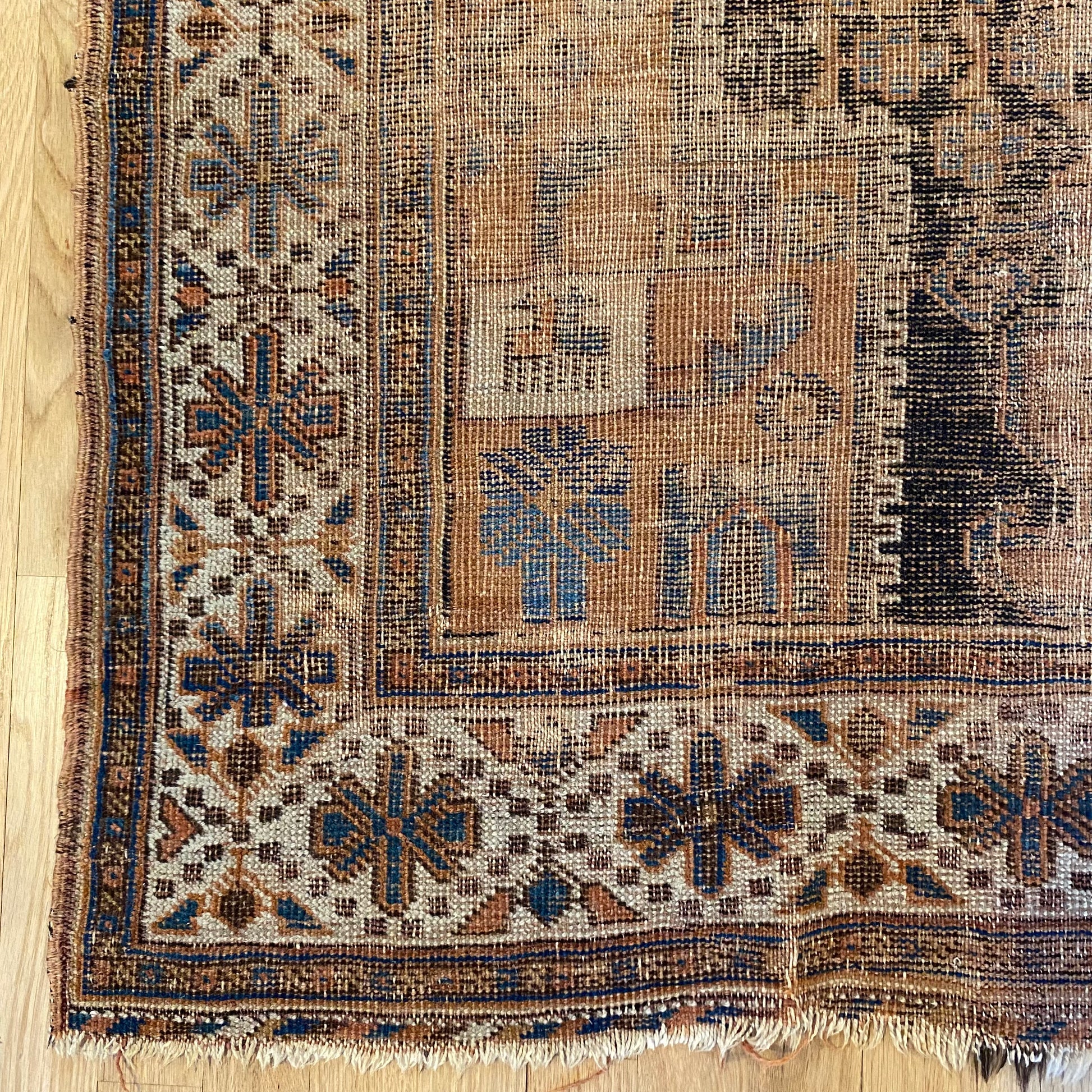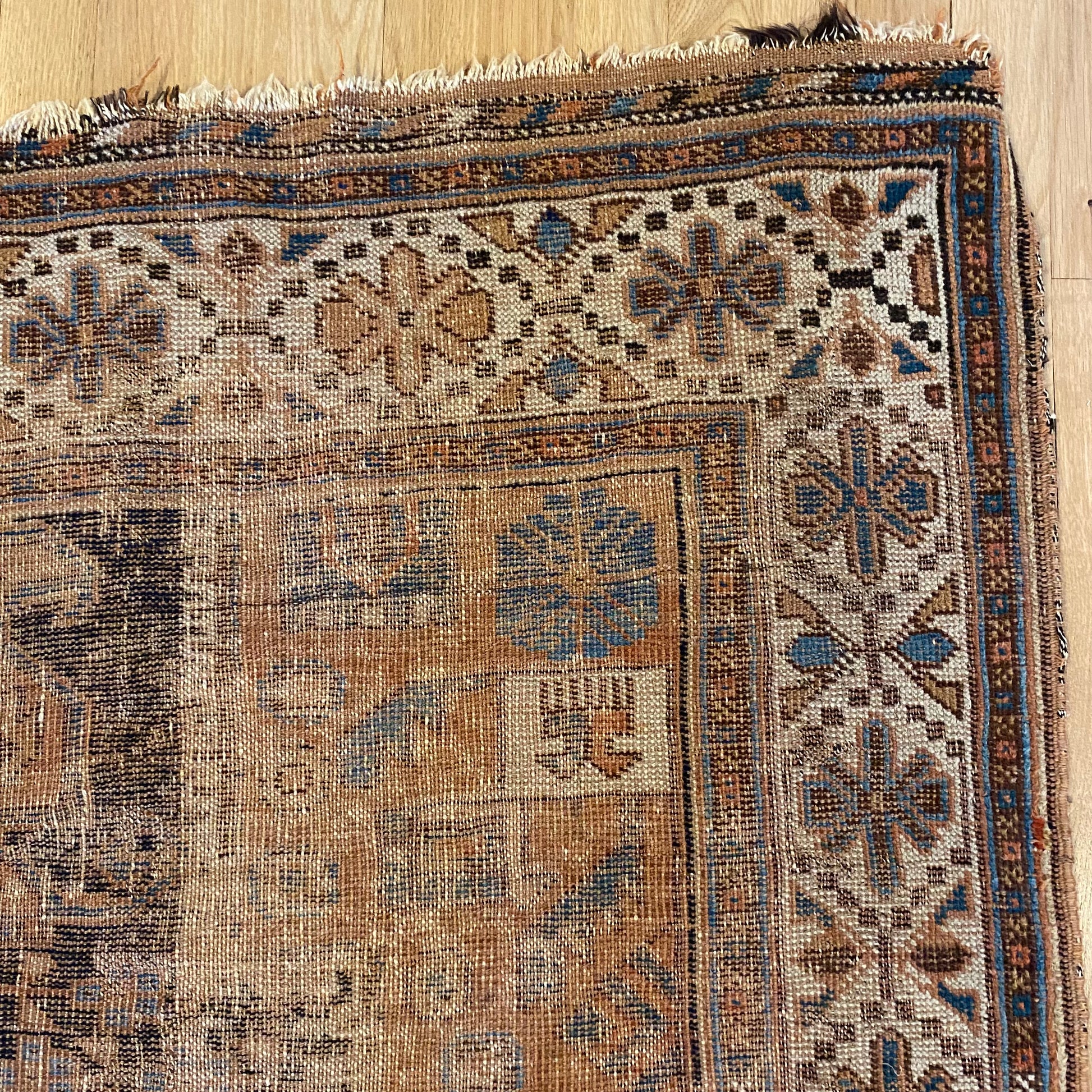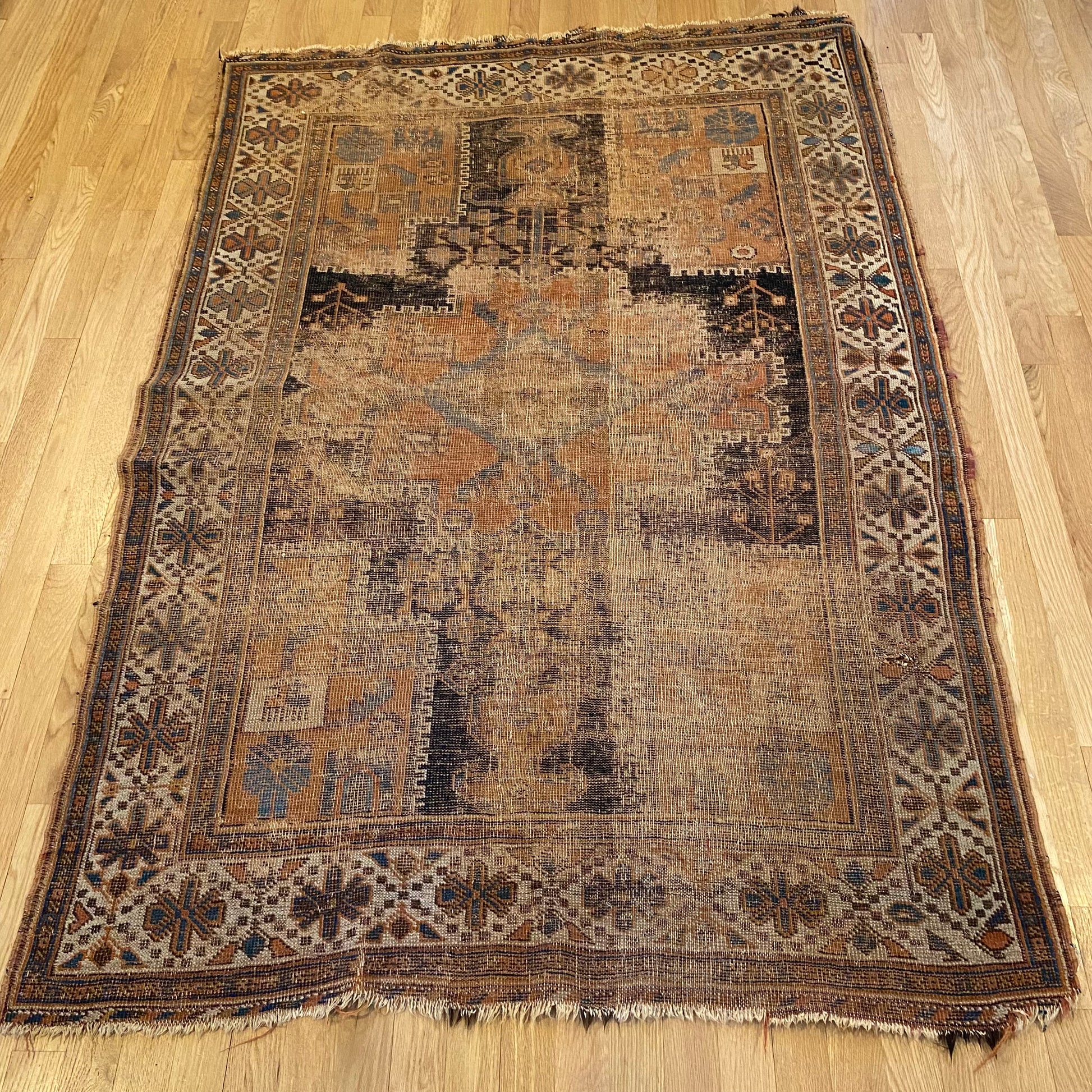 This antique rug is in fair condition. The design features a tribal medallion set in a navy field with red orange and white highlights. There is heavy wear throughout and a small repair. This rug is hand knotted and is not a perfect rectangle.