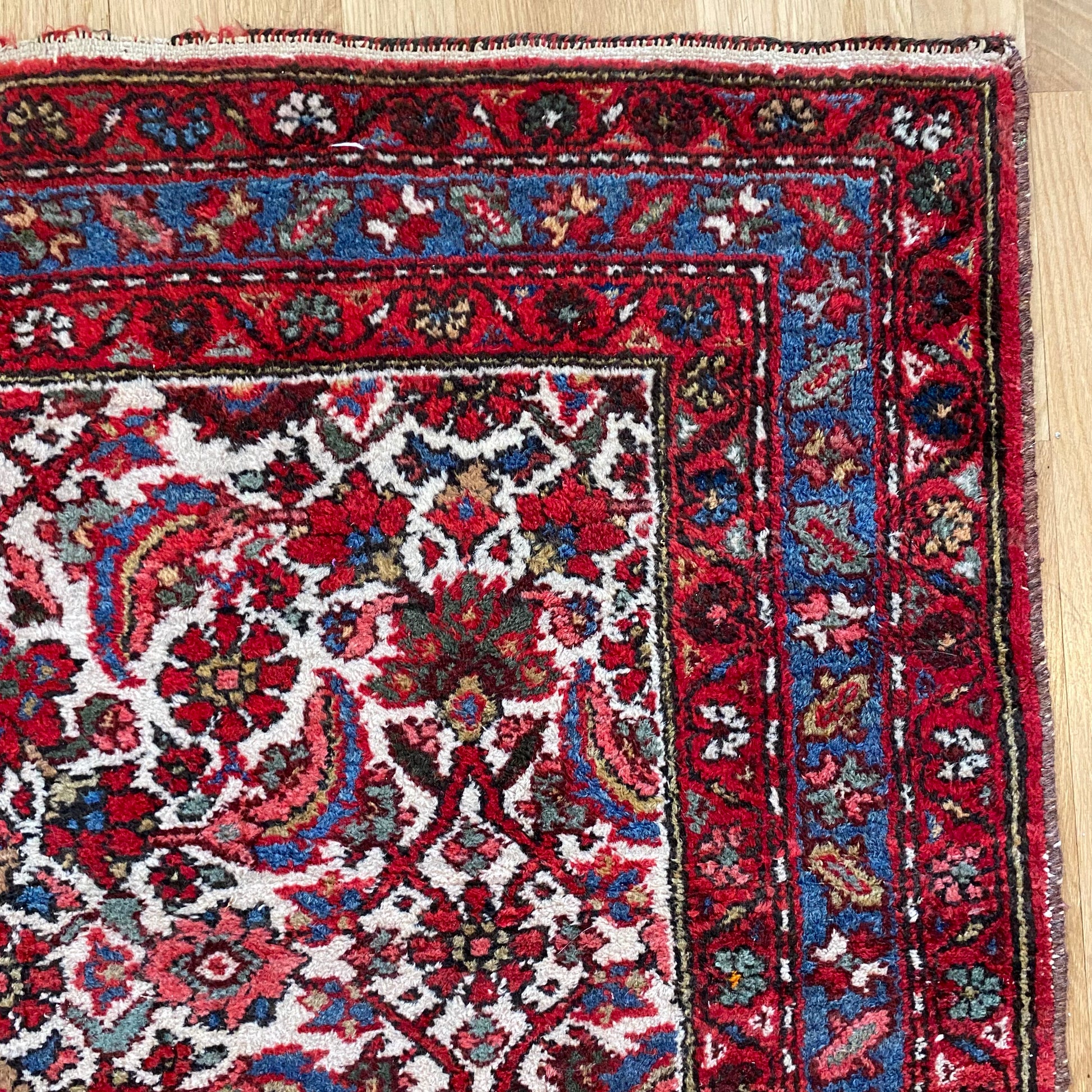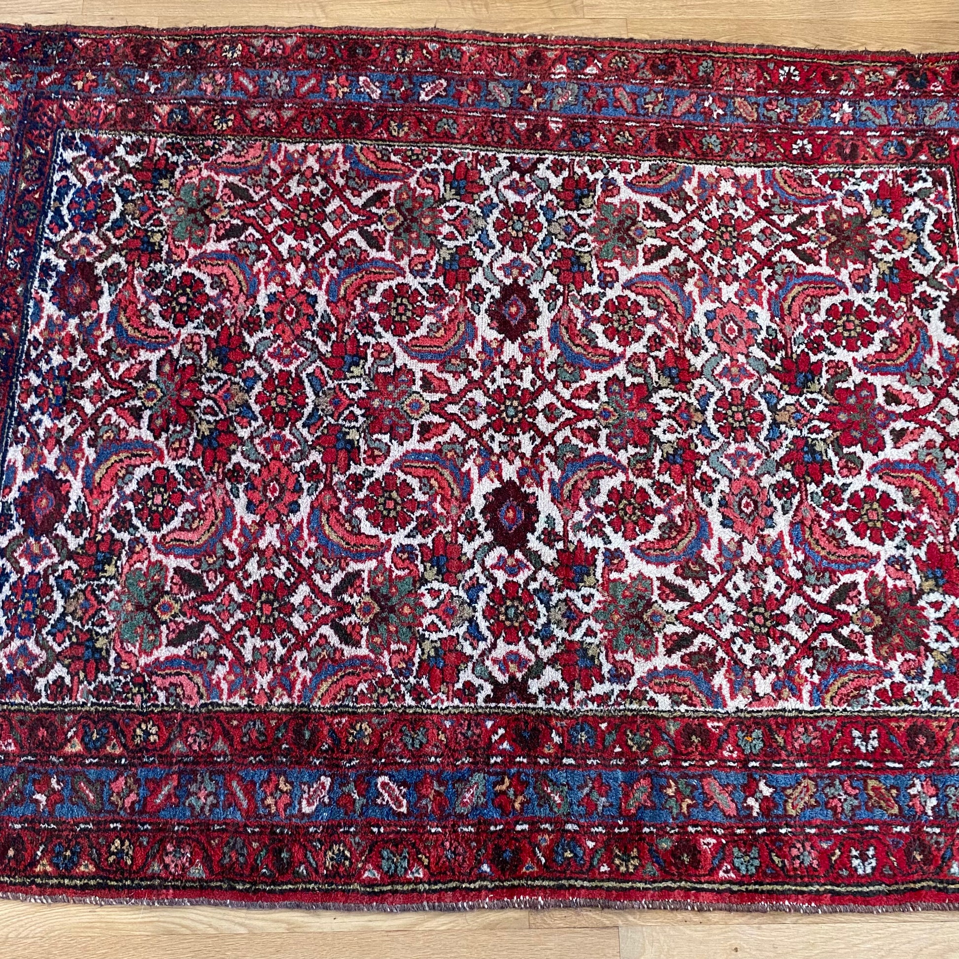 This vintage rug is in good condition. The design features an all-over pattern set in a white field with red and blue highlights. There is even wear throughout as seen in the photos.