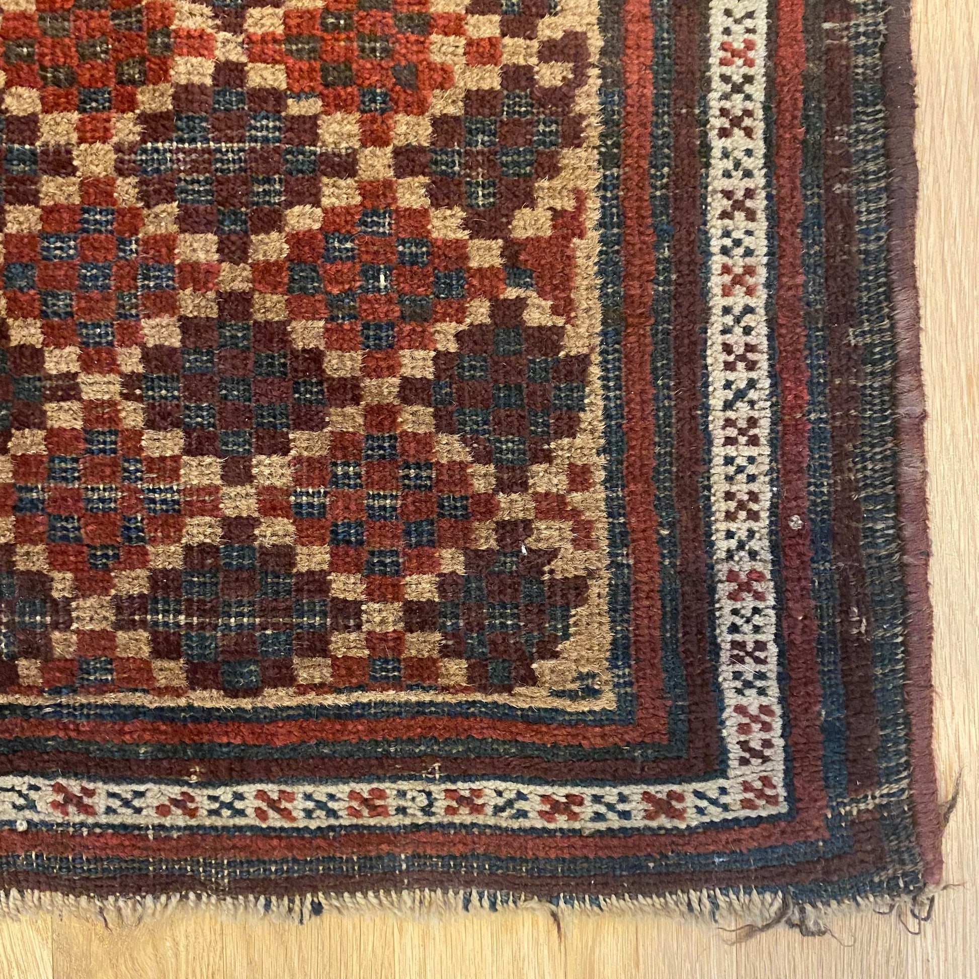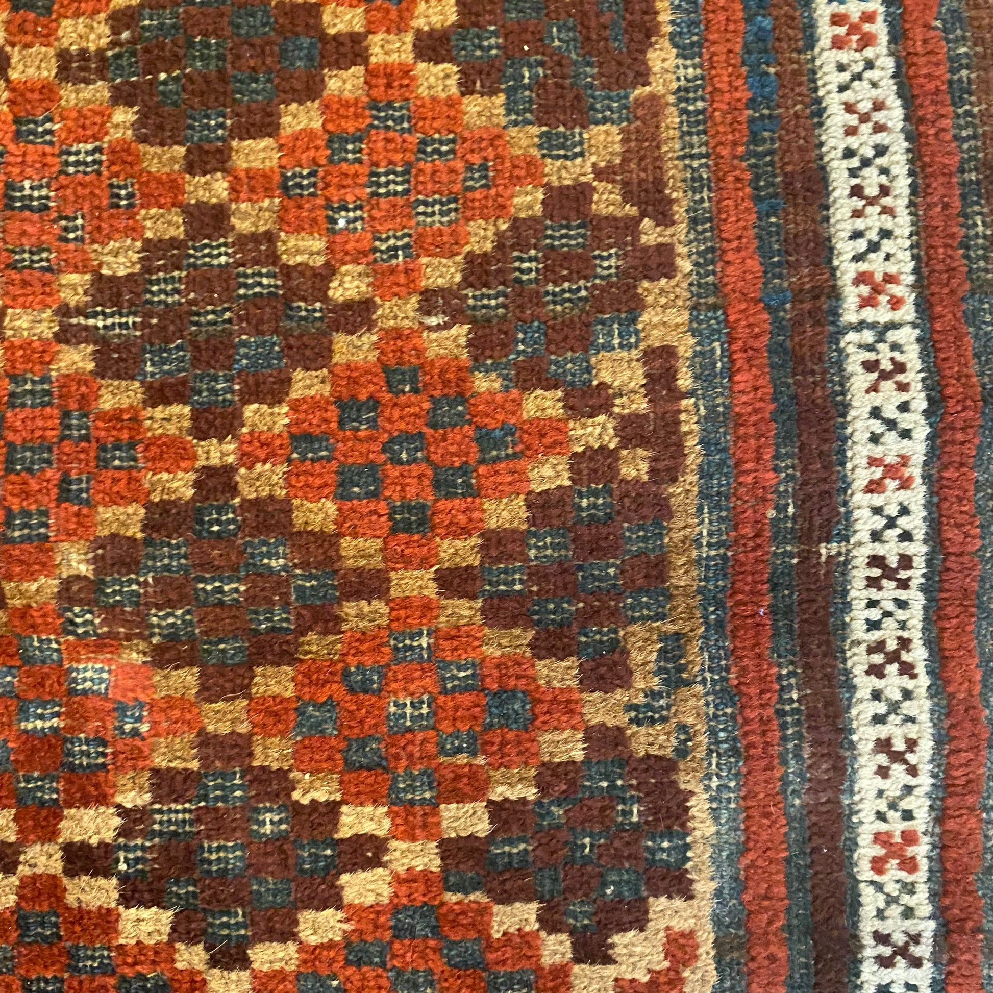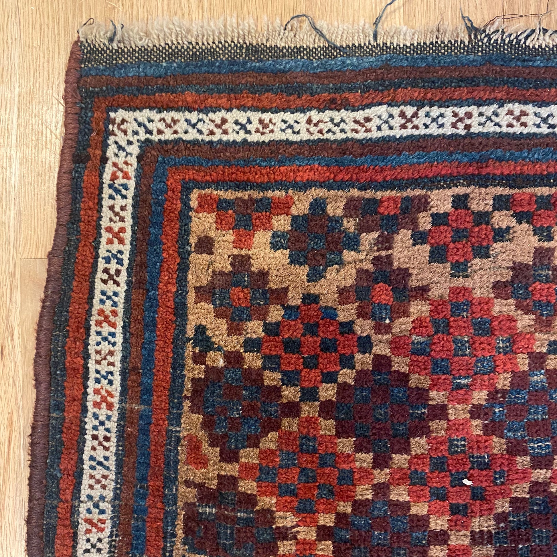This vintage rug is in fair condition. The design features a tribal pattern set in a tan field with white, blue, brown and red highlights. There is wear on the edges, fringe ends and throughout.