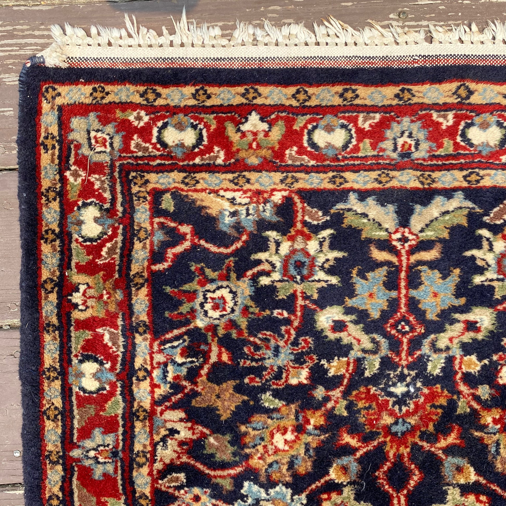 This vintage rug is in good condition. The design features an all-over pattern set in a blue field with red and white highlights. There is wear on the edges, fringe ends and throughout.