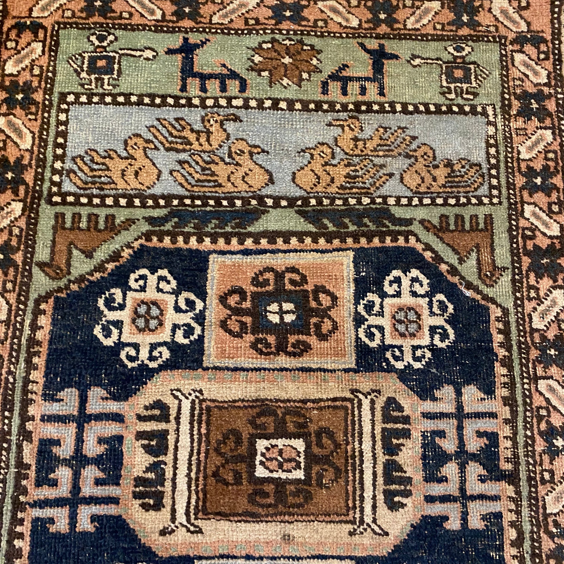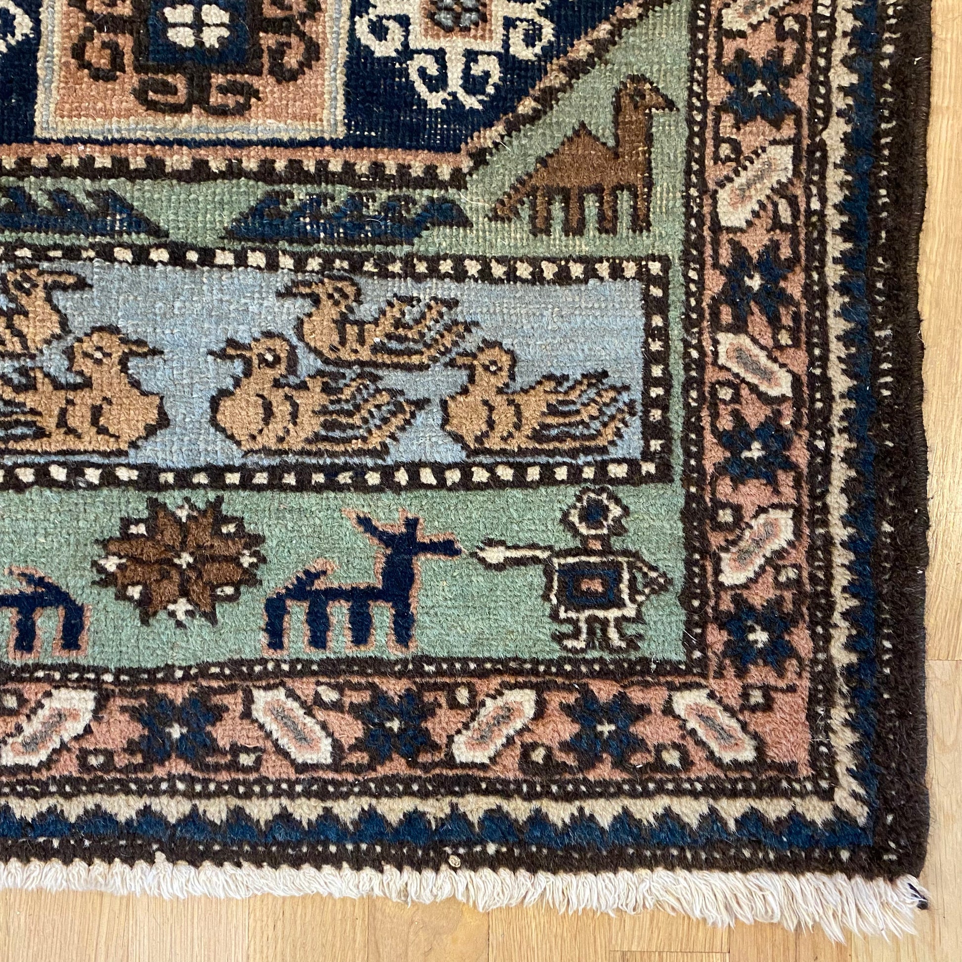This vintage rug is in good condition. The design features a central medallion with animal motifs set in a soft green field with blue, salmon and white highlights. There is wear on the edges, fringe ends and throughout. There are some blemishes in the field.