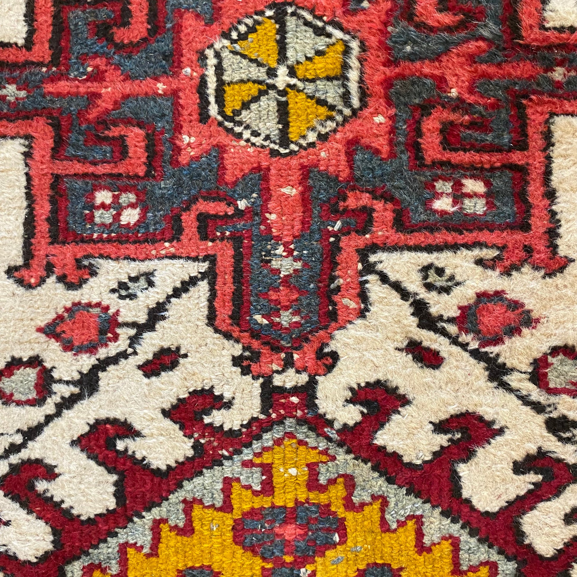 This vintage rug is in fair condition. The design features tribal medallions set in a white field with red and blue highlights. There is wear on the edges, fringe ends and throughout.