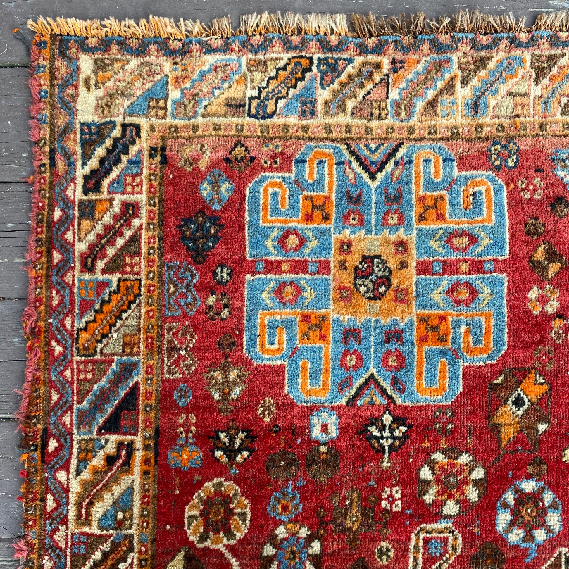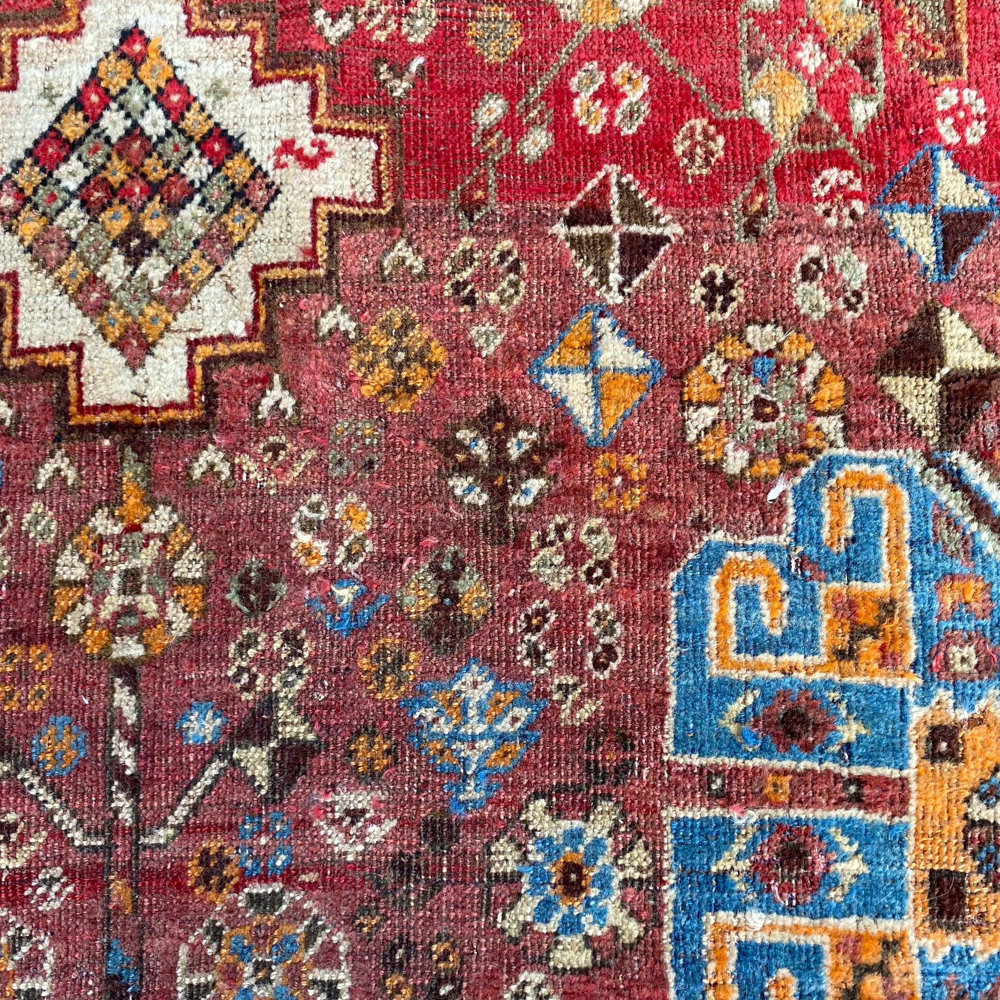 This vintage rug is in good condition. The design features a tribal pattern set in a red field with blue, orange and white highlights. There is wear on the edges, fringe ends and throughout. There is some uneven fading in the field as seen in the photos.