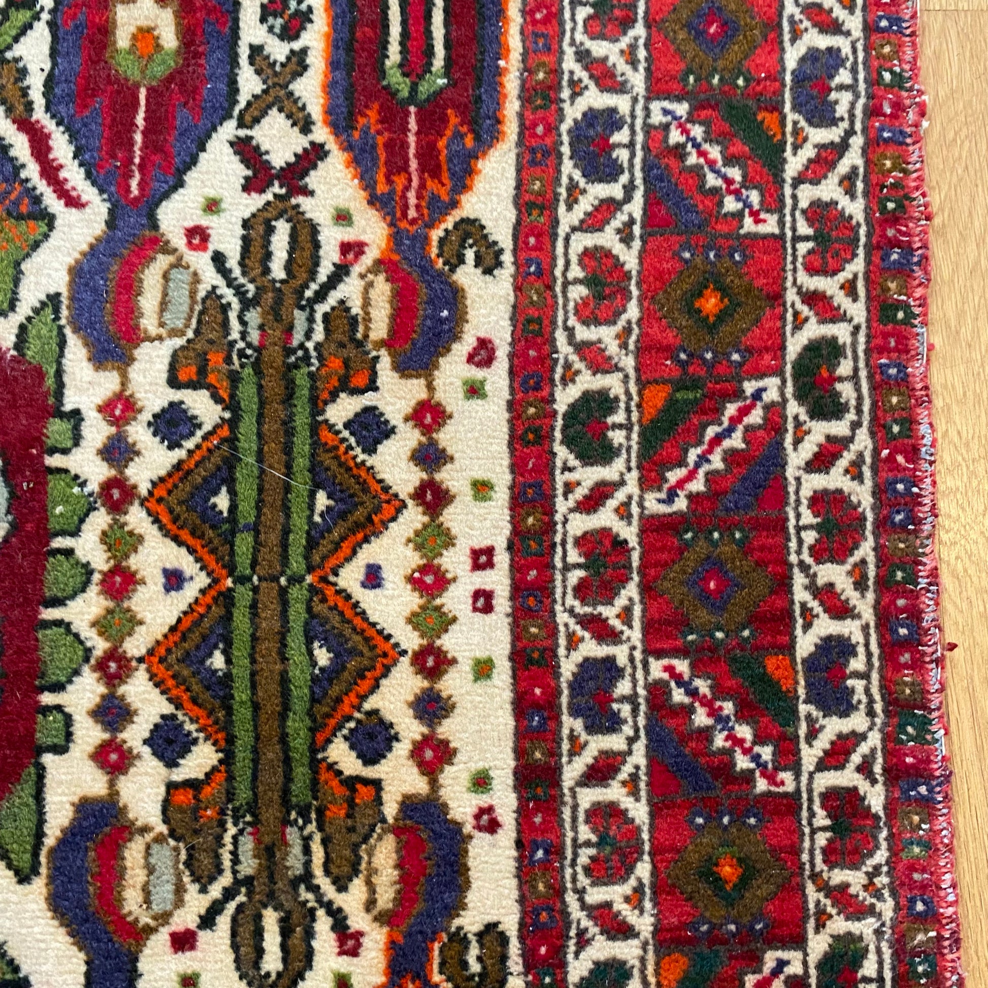 This vintage rug is in very good condition. The design features a central medallion set in a white field with red and yellow highlights. There is even wear throughout.