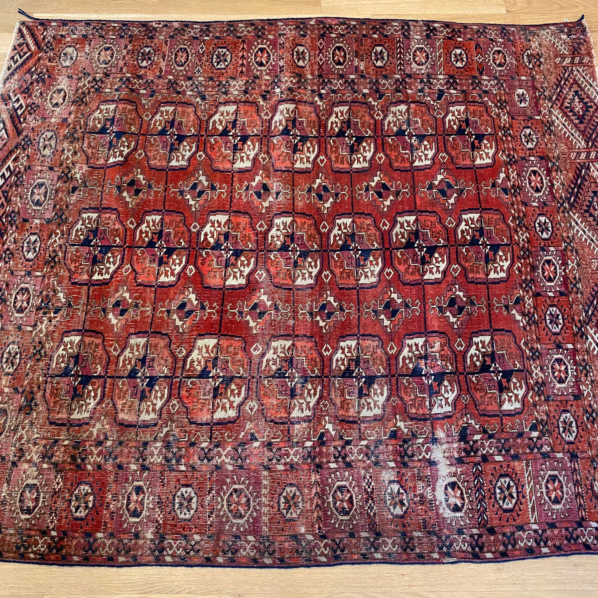 This vintage rug is in fair condition. The design features traditional medallions set in a red-orange field with blue and white highlights. There is heavy wear throughout as seen in the photos.