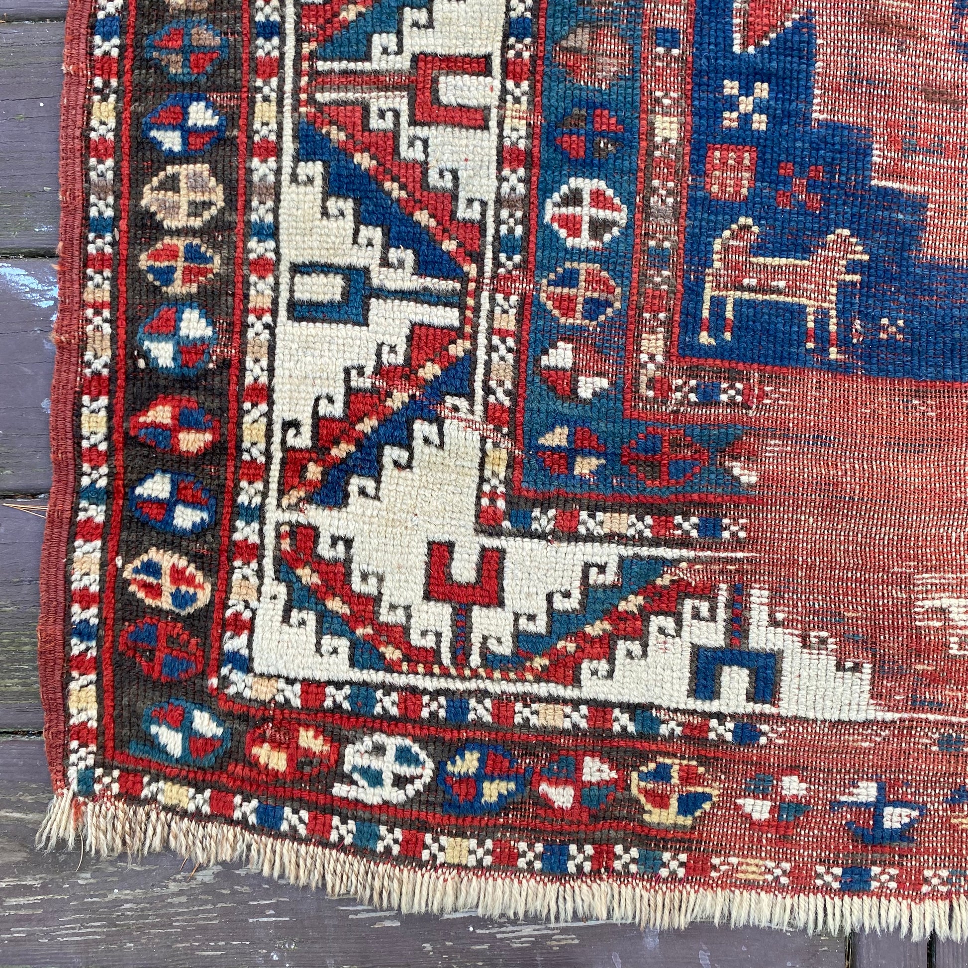 This antique rug is in poor condition. The design features a tribal pattern set in a blue field with red-brown and white highlights. There is heavy wear on the edges, fringe ends and throughout.