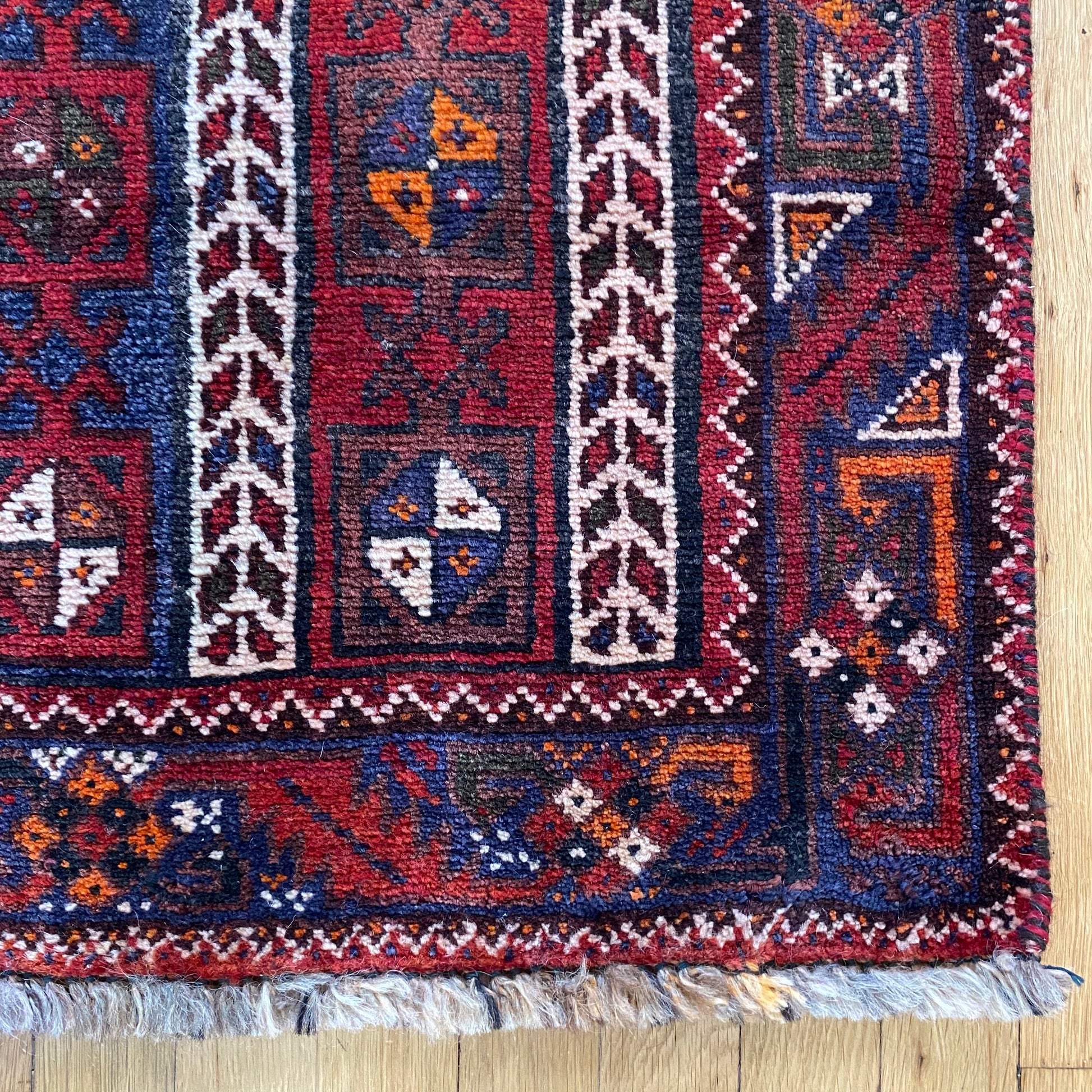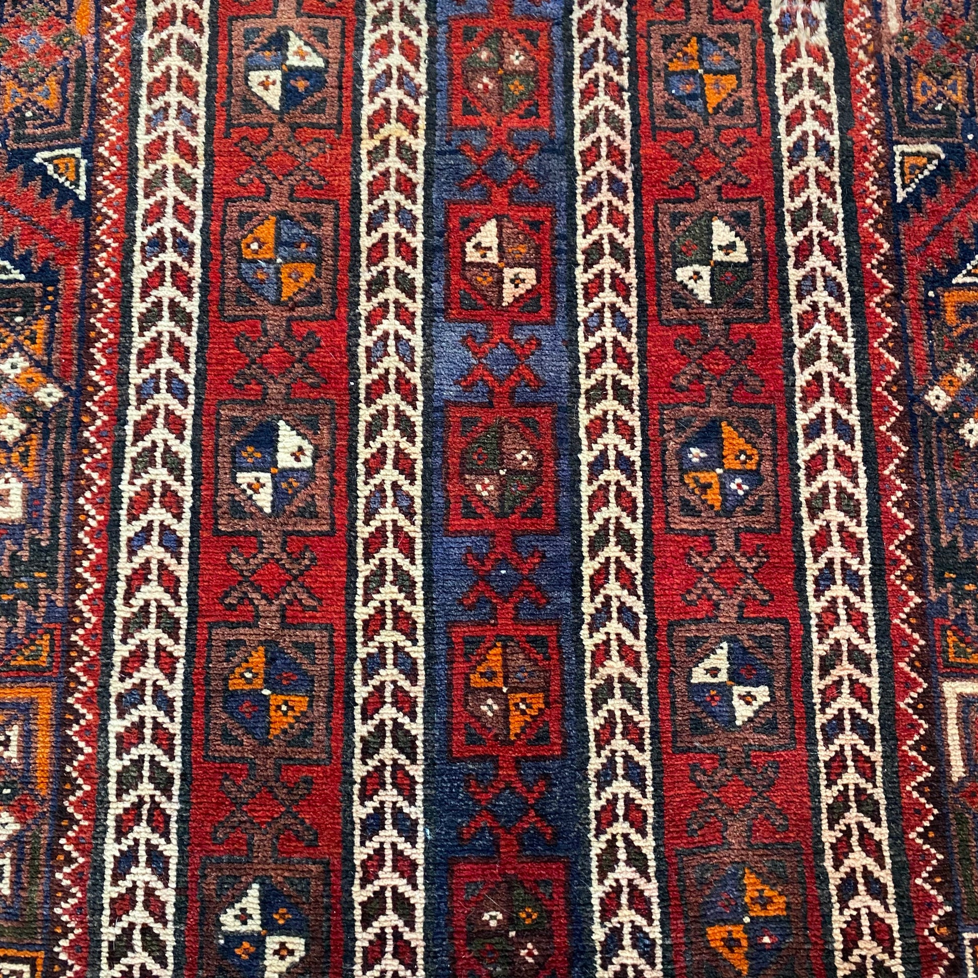 This vintage rug is in very good condition. The design features a striped tribal pattern with a red and blue color scheme. There is light wear throughout and a border missing at one end as seen in the photos.