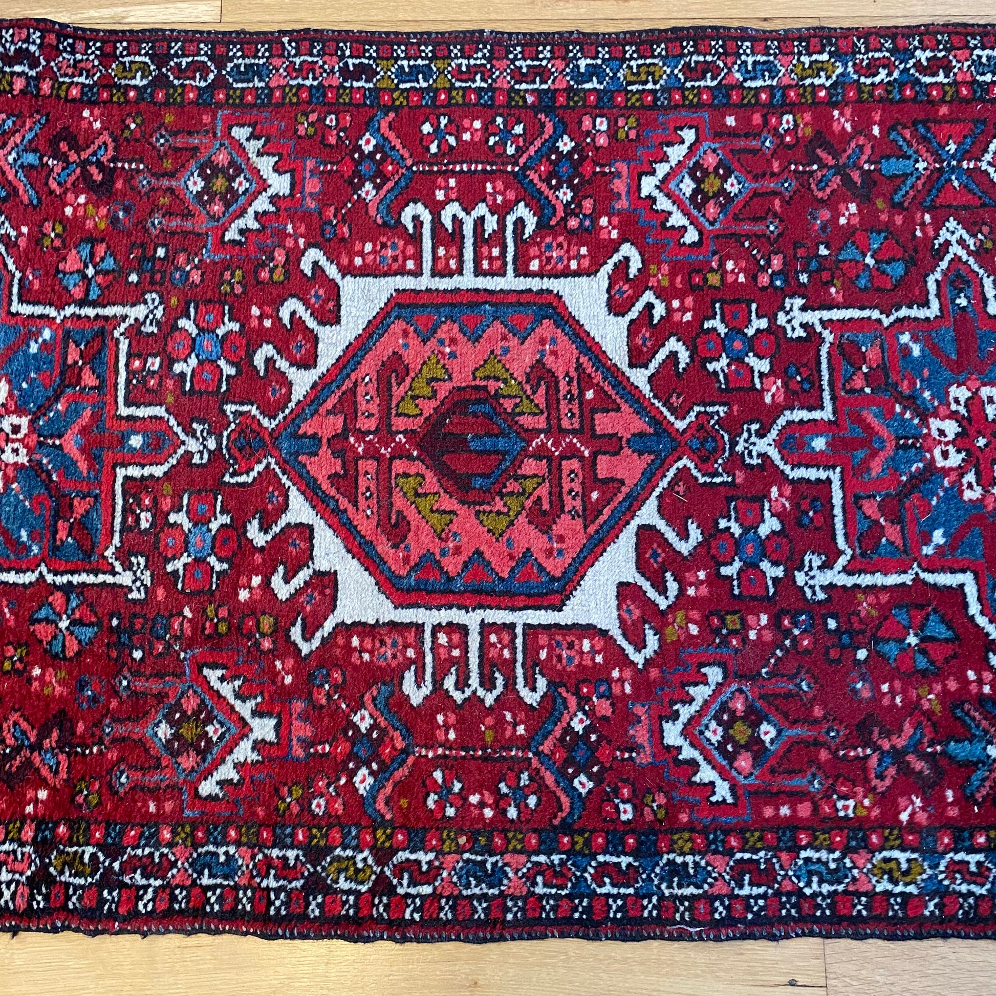 This vintage rug is in very good condition. The design features tribal medallions set in a red field with blue and white highlights. There is light wear throughout.