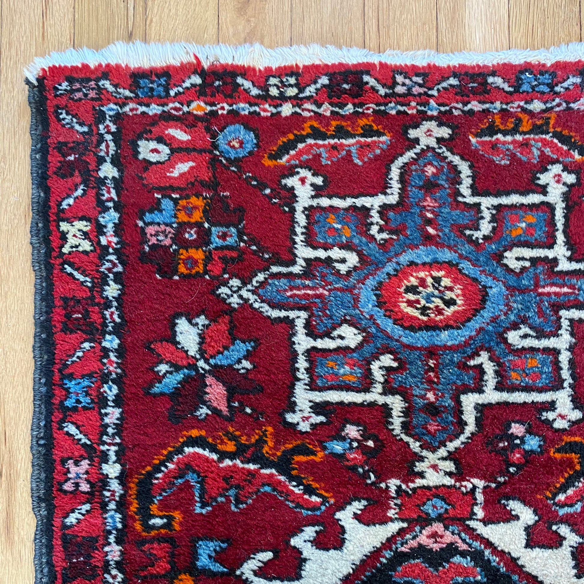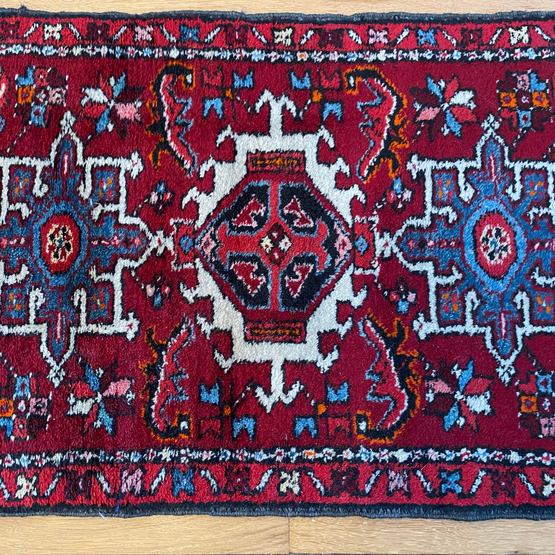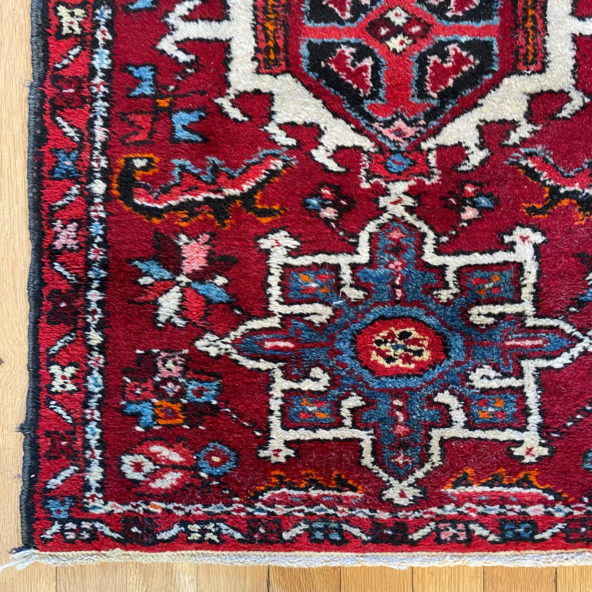 This vintage rug is in very good condition. The design features tribal medallions set in a red field with blue, brown and white highlights. There is light wear throughout.