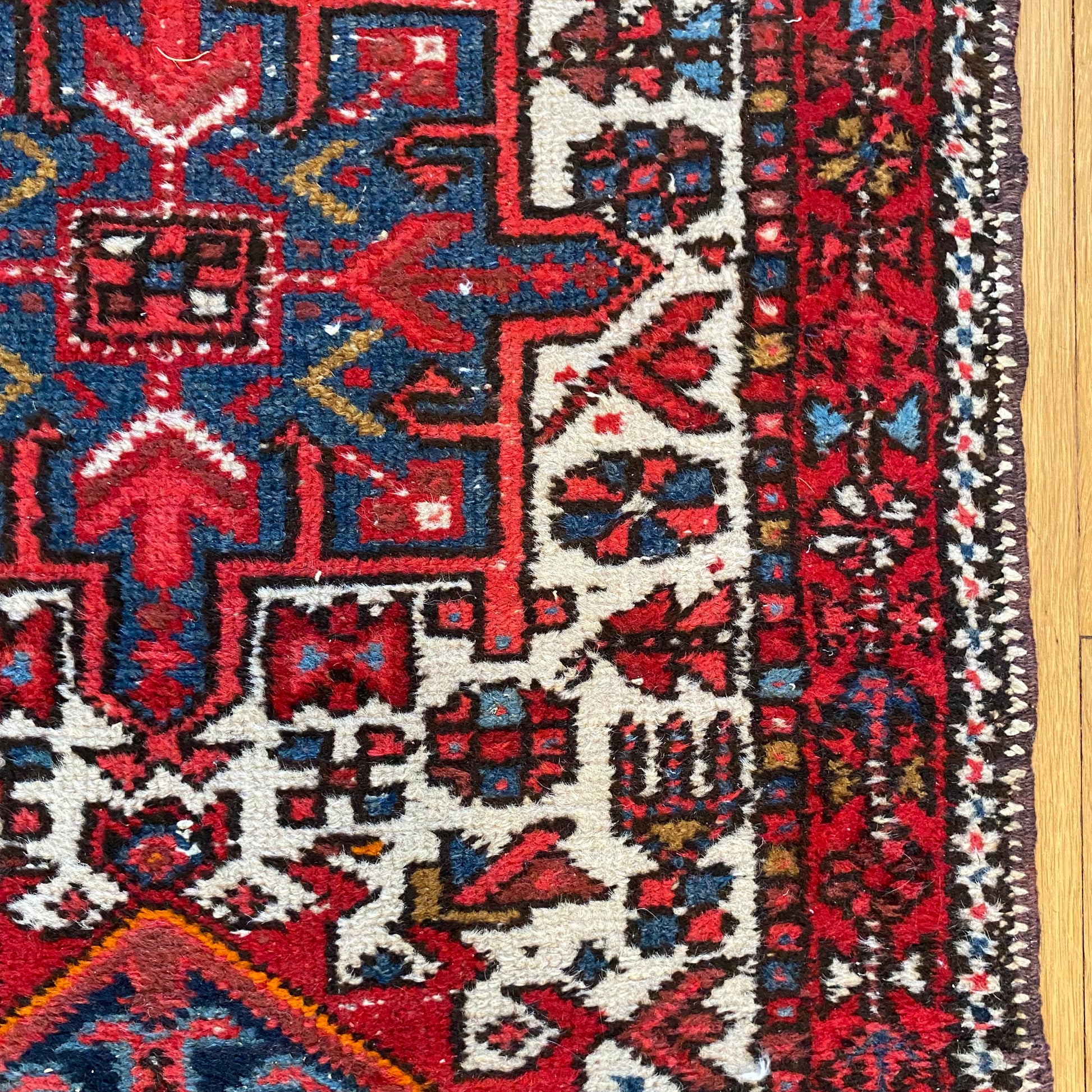 This vintage rug is in very good condition. The design features tribal medallion set in a white field with red and blue highlights. There is wear on the edges, fringe ends and throughout.