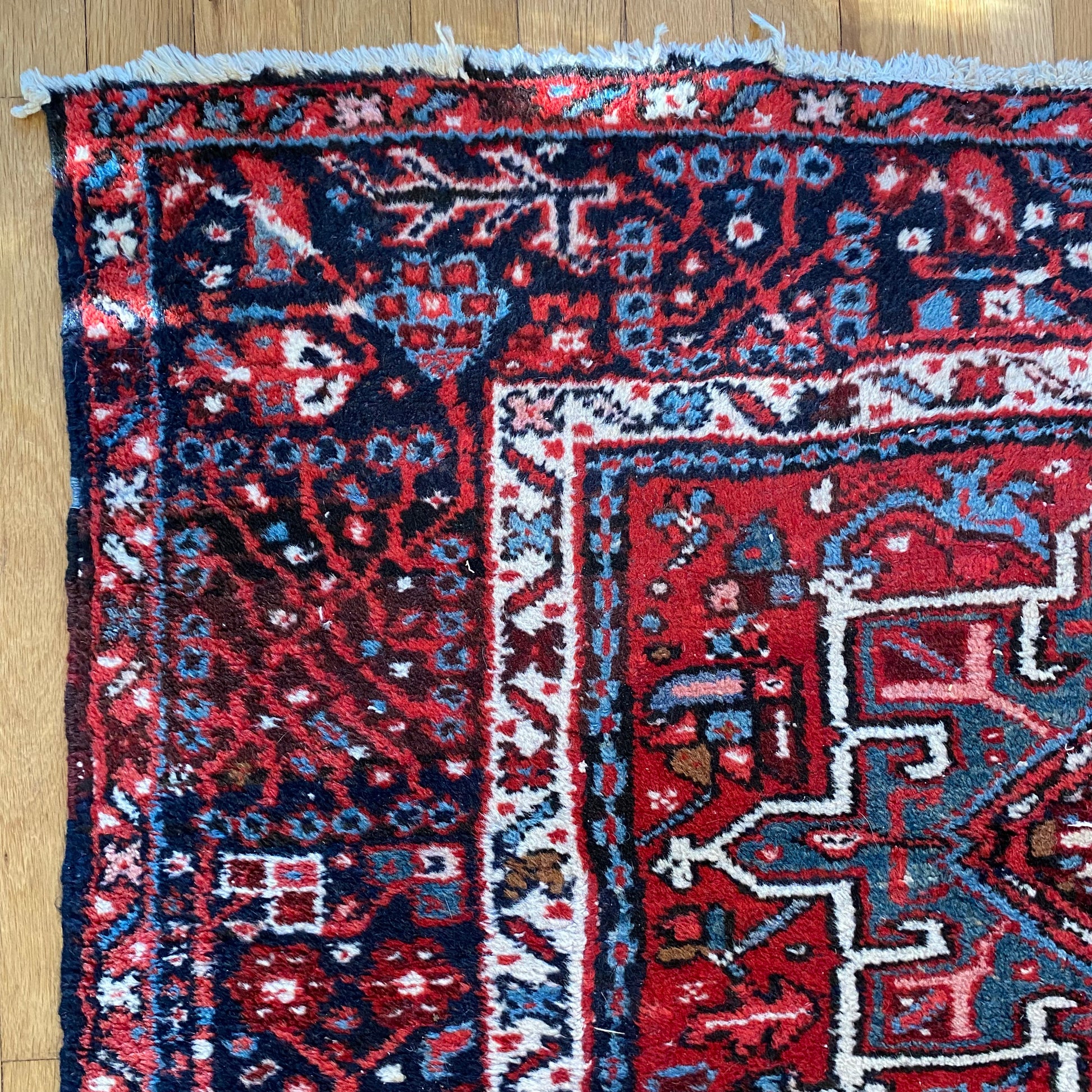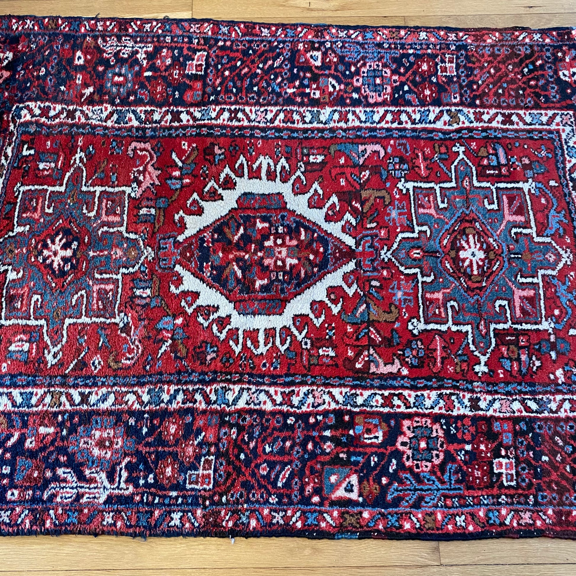 This vintage rug is in very good condition. The design features tribal medallions set in a red field with blue and white highlights. This rug is hand knotted and is not a perfect rectangle. There is even wear throughout.