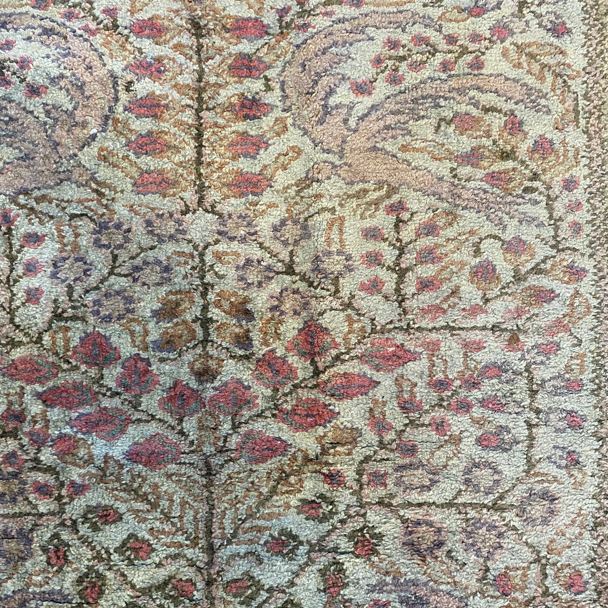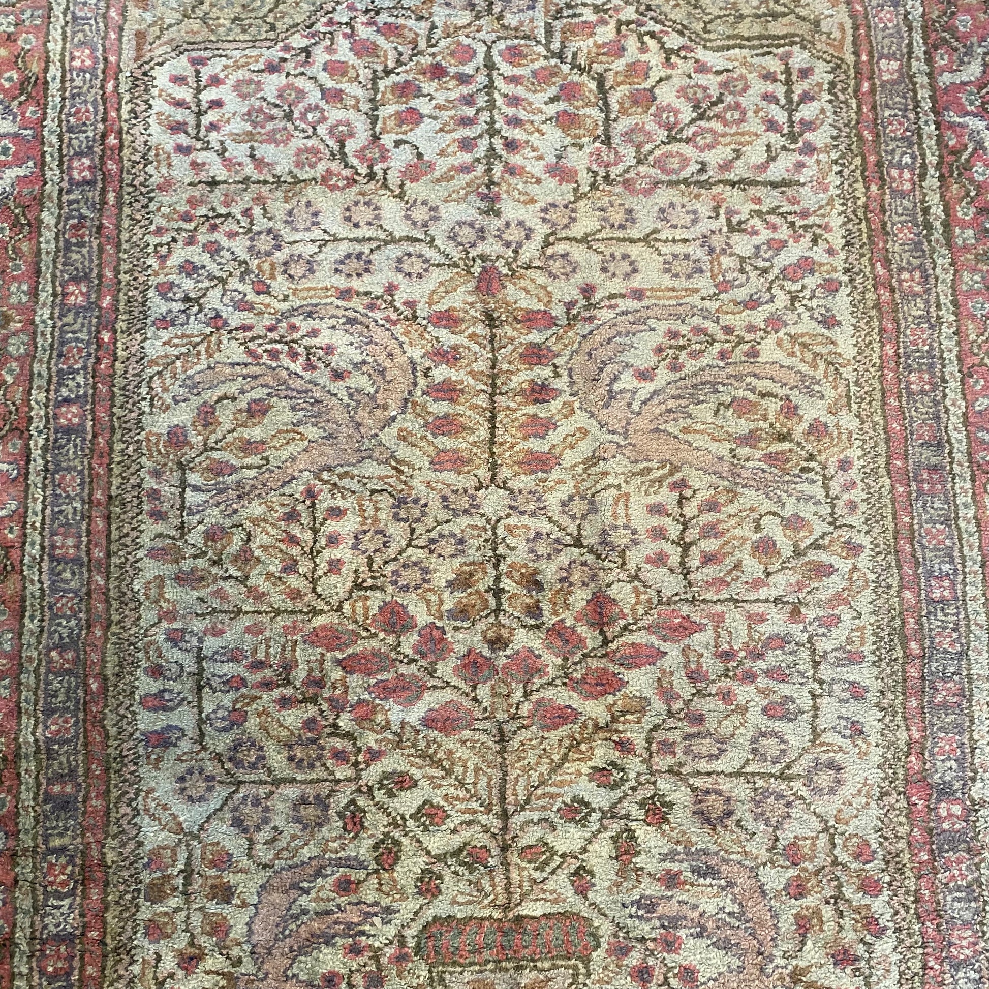 This vintage rug is in good condition. The field is cream with pink and purple-grey highlights with a prayer design. There is wear on the edges, fringe ends and throughout. The measurement includes the fringe.