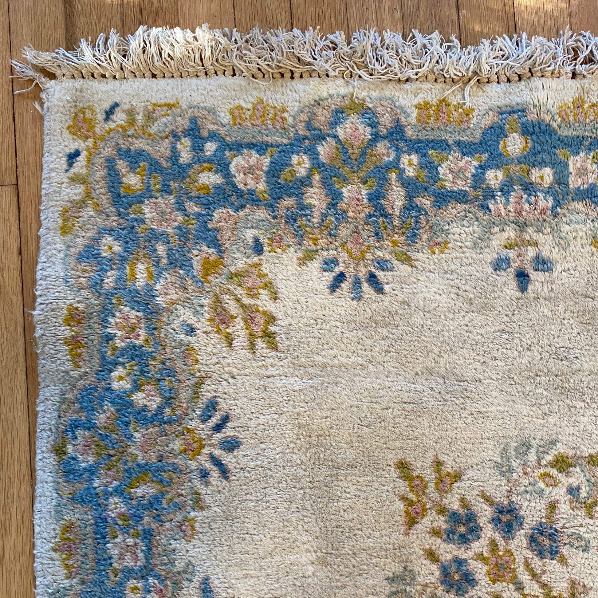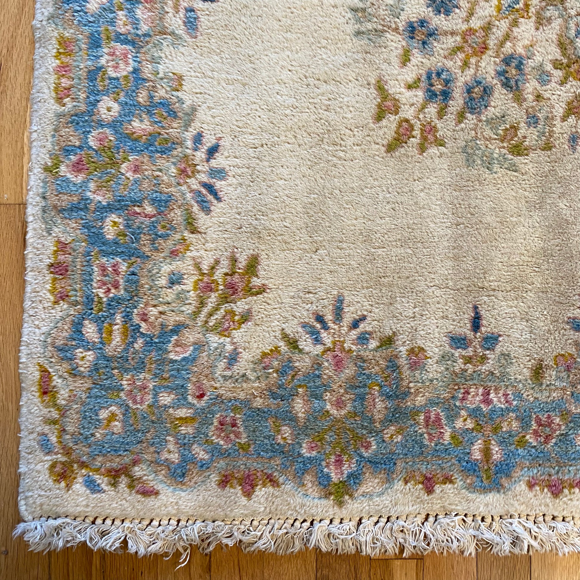 This vintage rug is in fair condition. The design features a floral medallion set in a cream field with blue and pink highlights. There is wear throughout and some discoloration as seen in the photos.