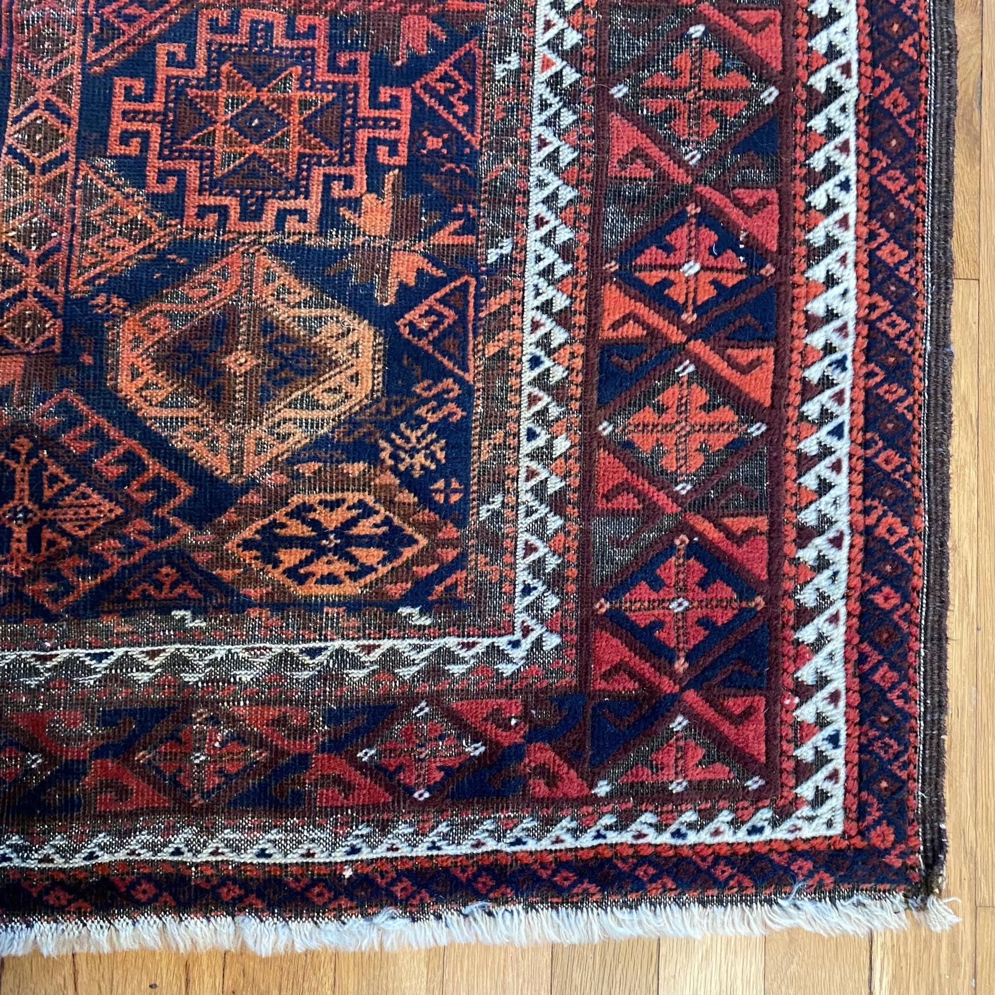 This antique rug is in fair condition. The design features a tribal pattern set in a blue field with white and red-brown highlights. There is wear on the edges, fringe ends and throughout as seen in the photos.