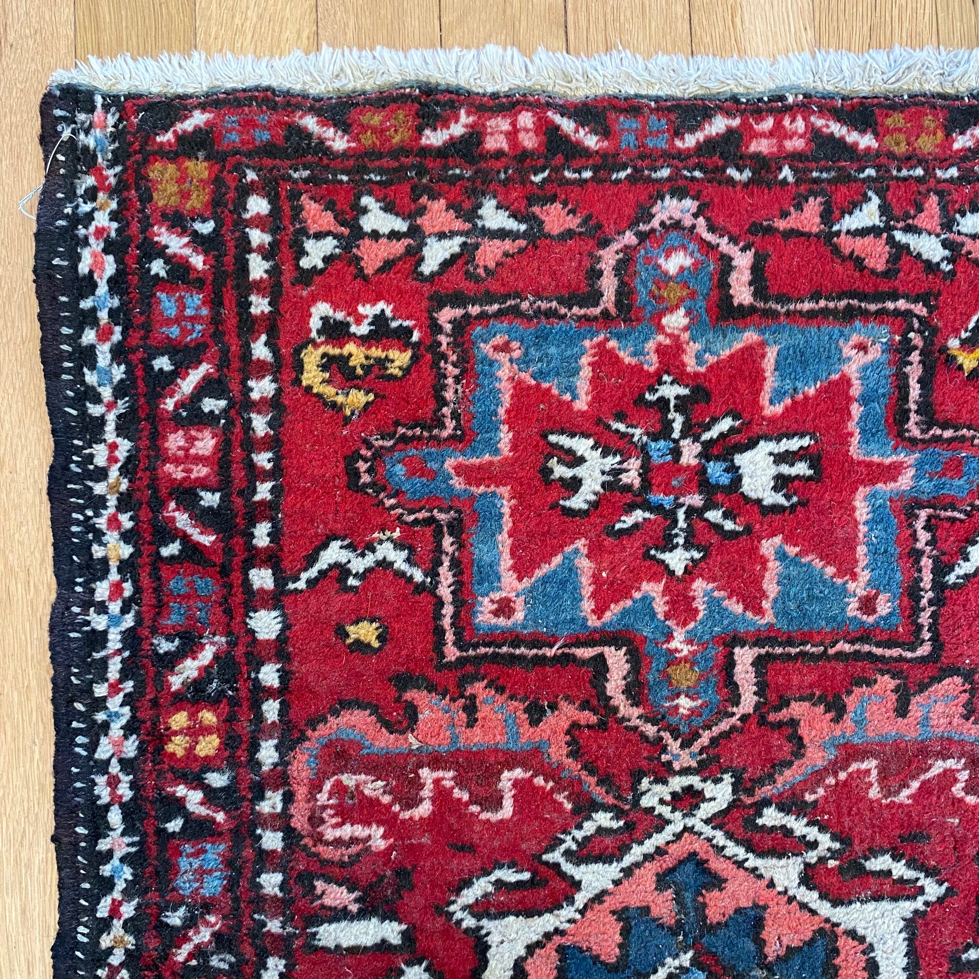 This vintage rug is in very good condition. The design features tribal medallions set in a red field with blue and white highlights. There is light wear throughout.
