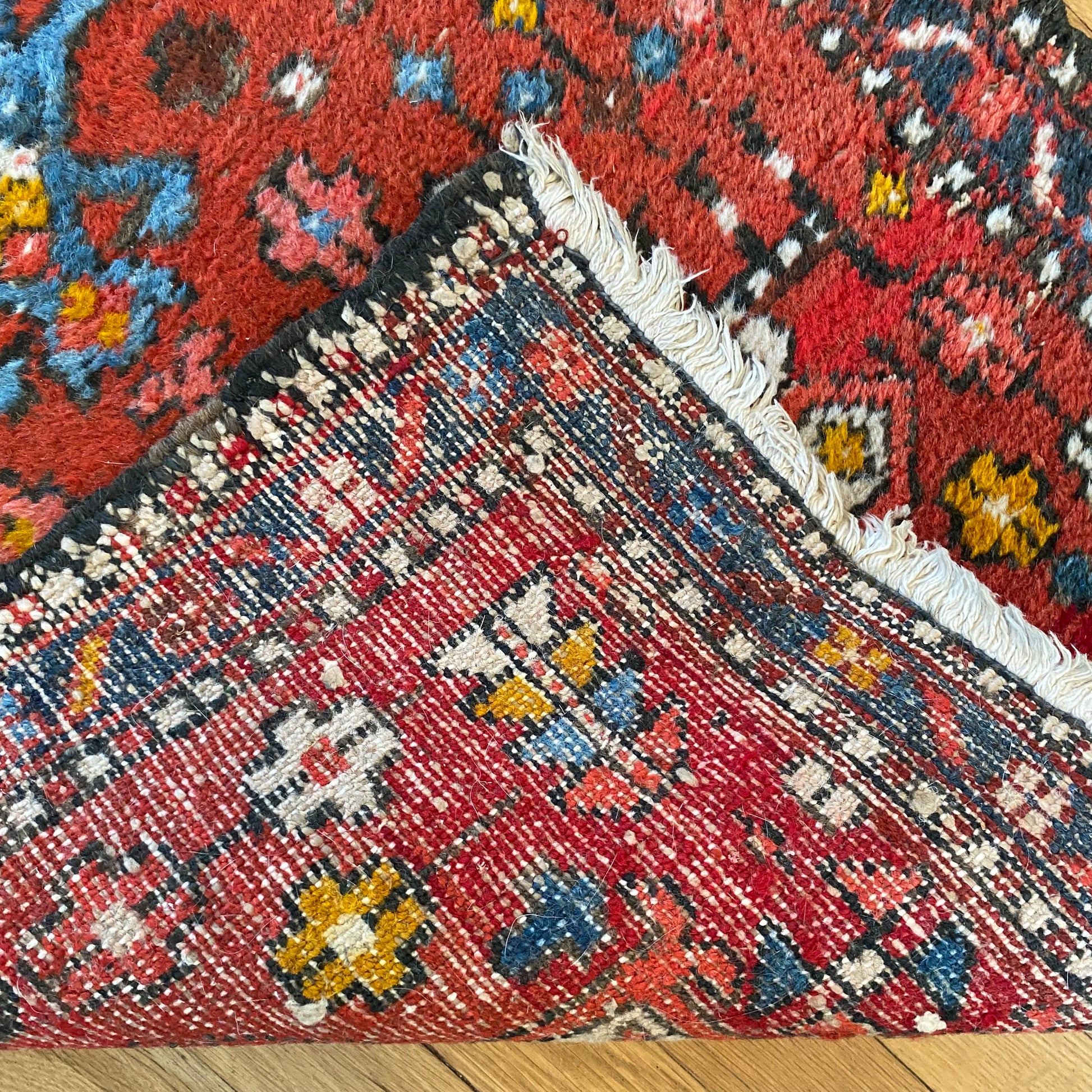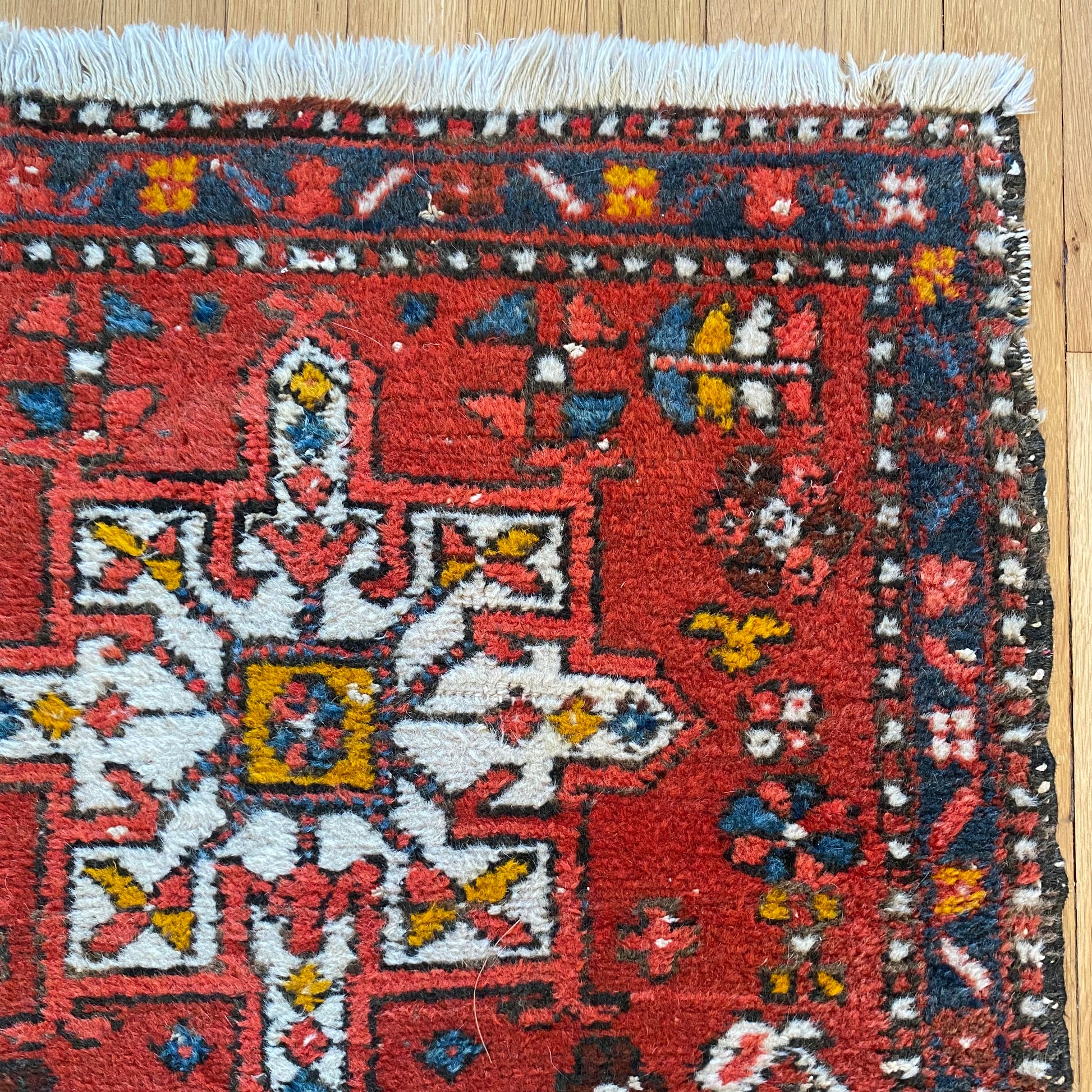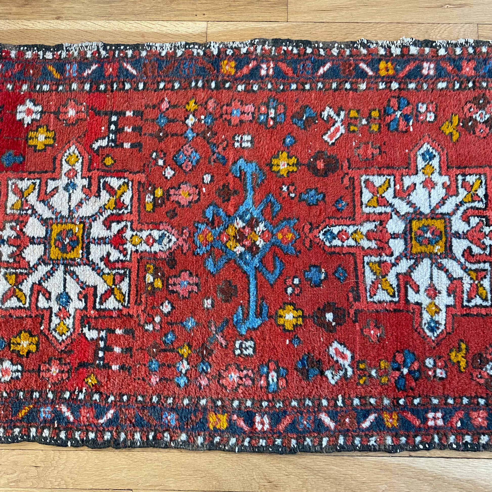 This vintage rug is in very good condition. The design features tribal medallions set in a red field with blue and white highlights. There is even wear throughout.