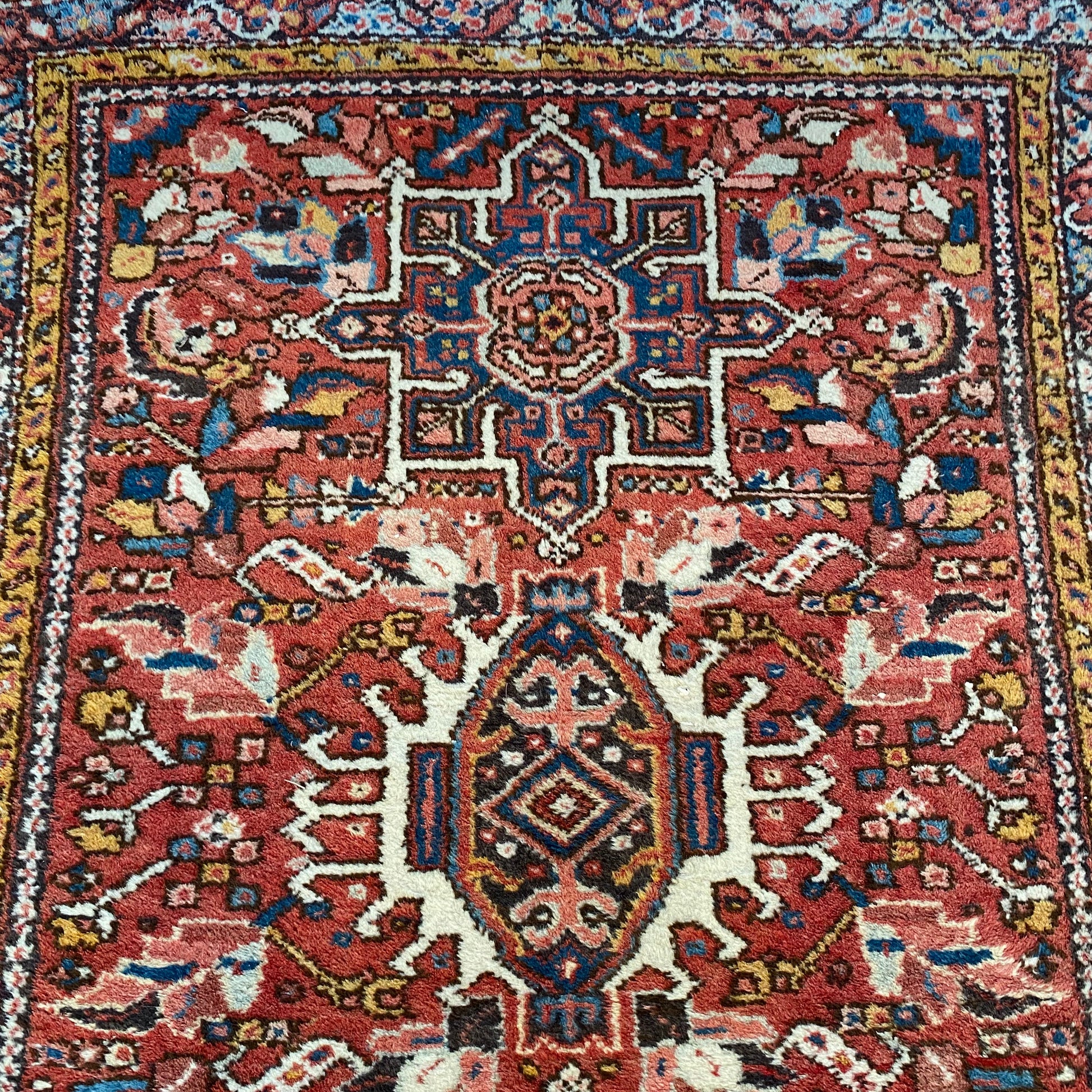 This vintage rug is in very good condition. The design features tribal medallions set in a red field with blue and white highlights. There is even wear throughout.
