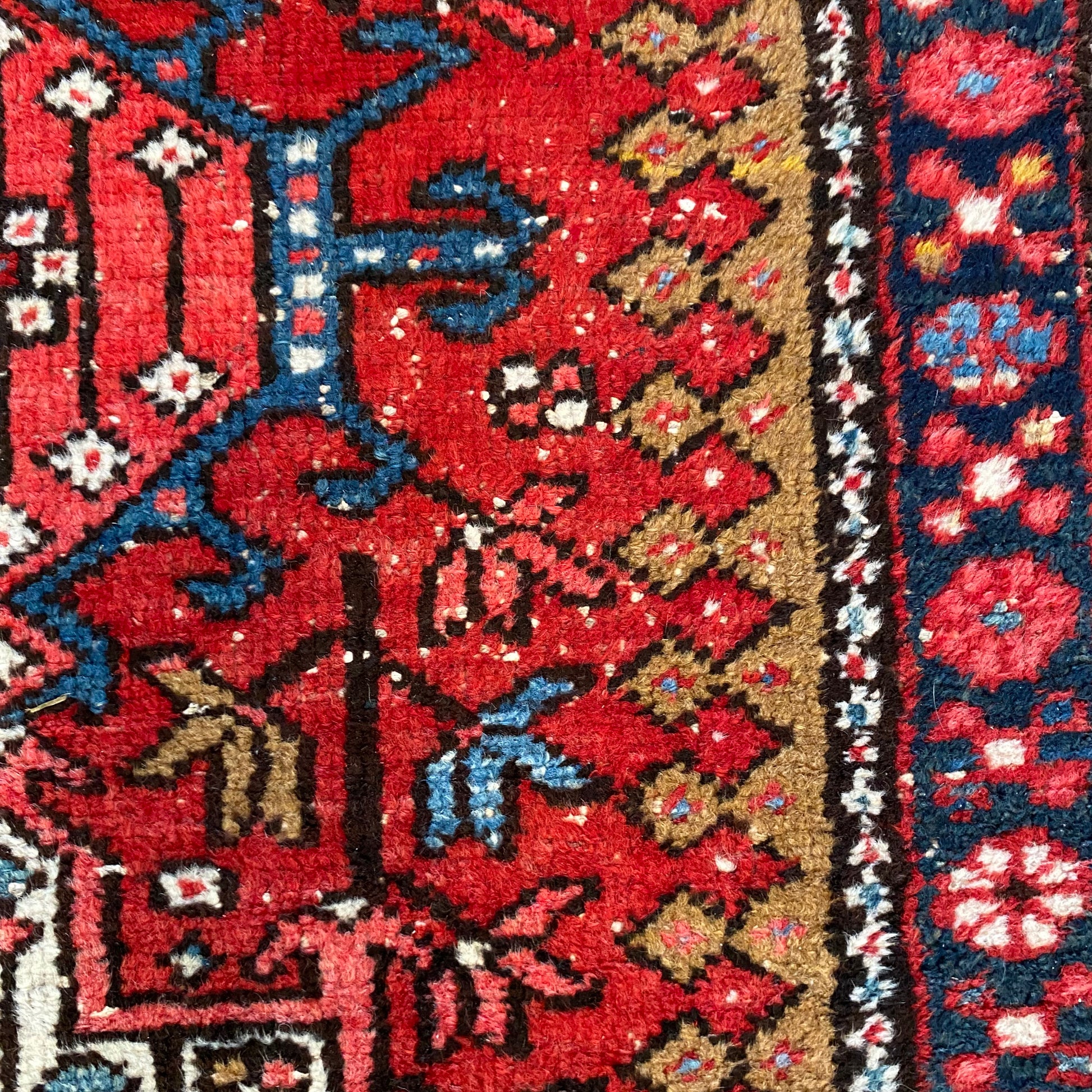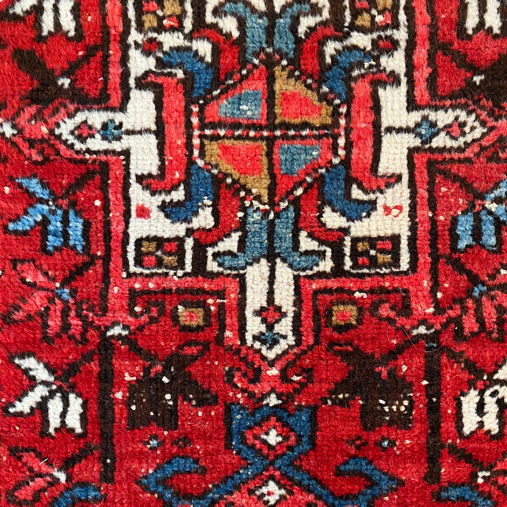 This vintage rug is in very good condition. The design features tribal medallions set in a red field with blue, brown and white highlights. There is even wear throughout.