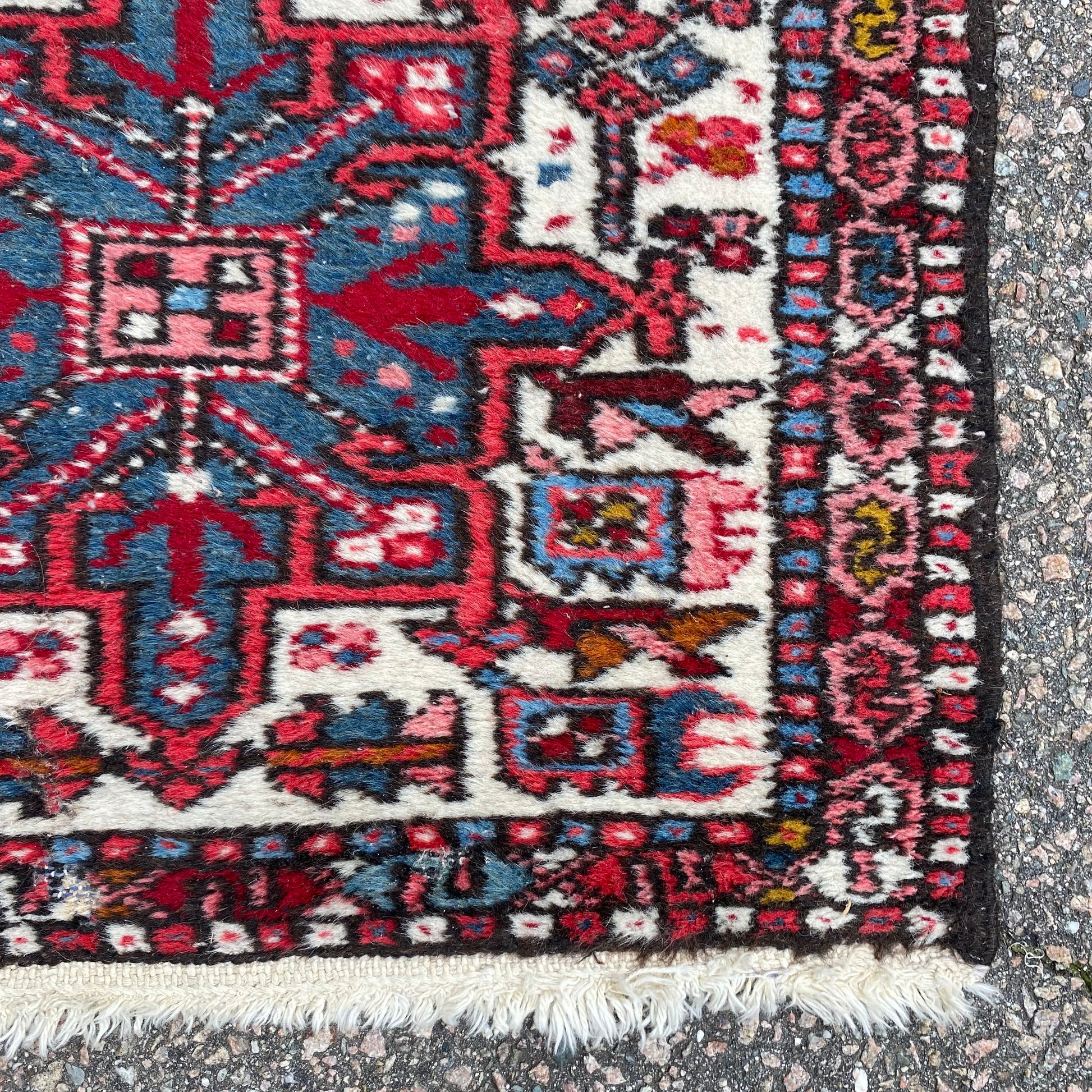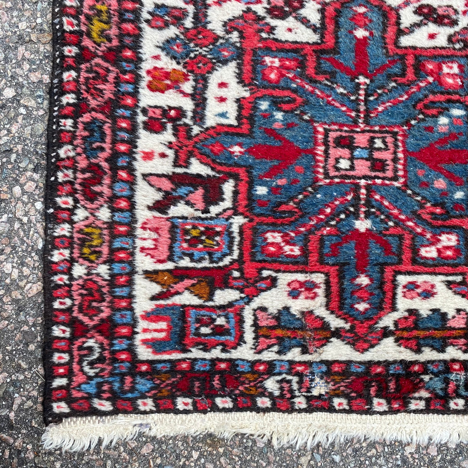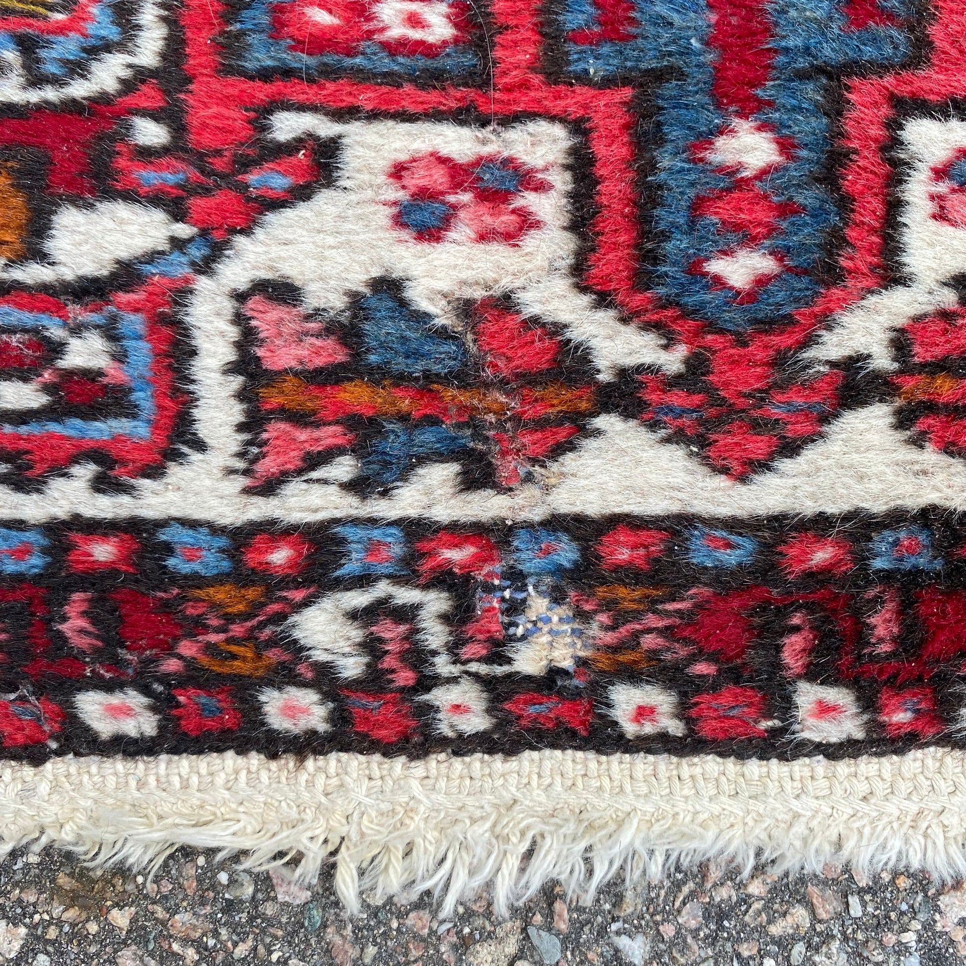 This vintage rug is in poor condition. The design features tribal medallions set in a white field with blue and red highlights. There is wear and pile missing throughout as seen in the photos.