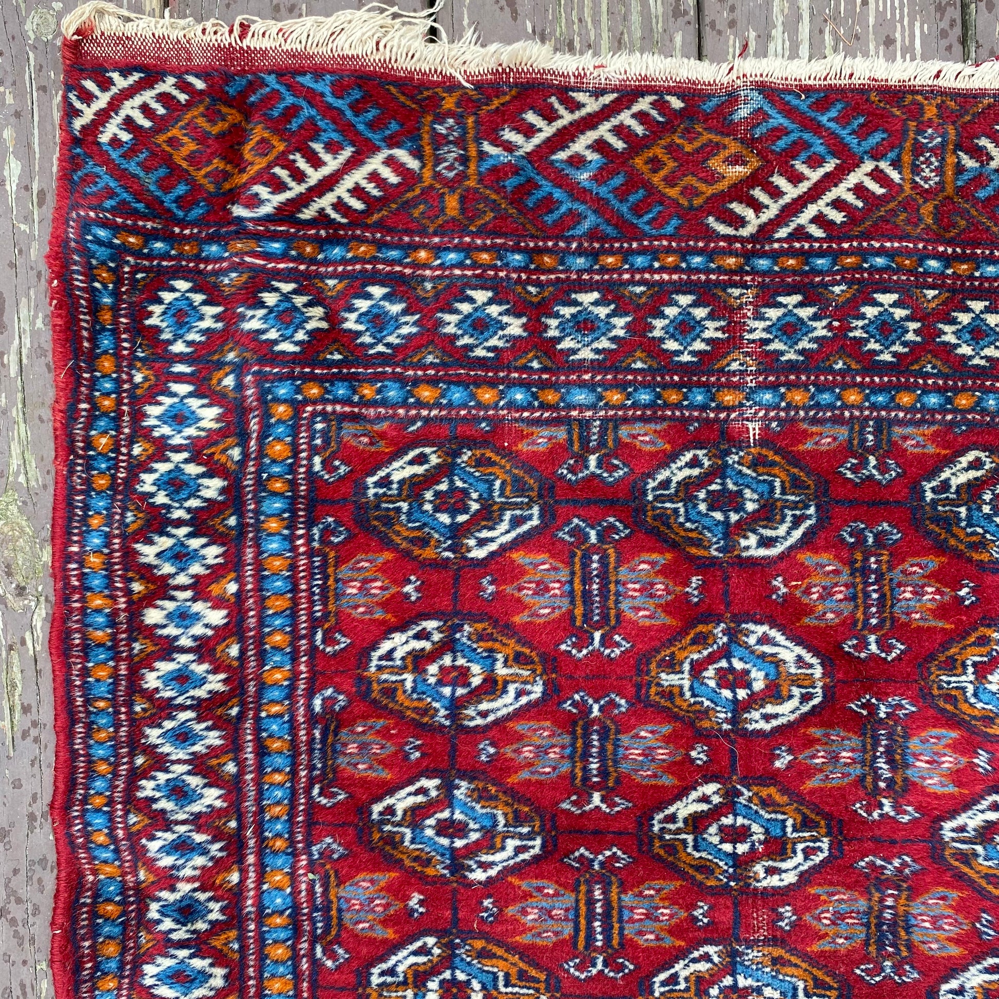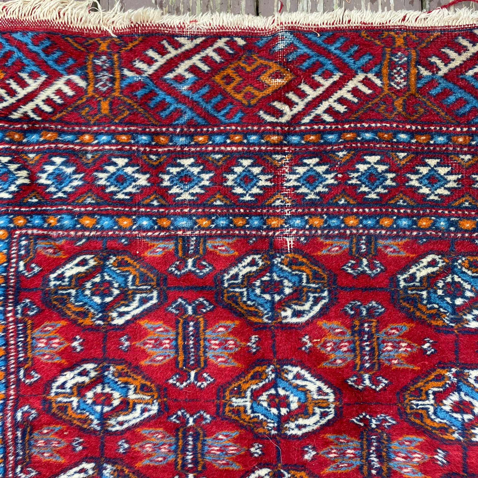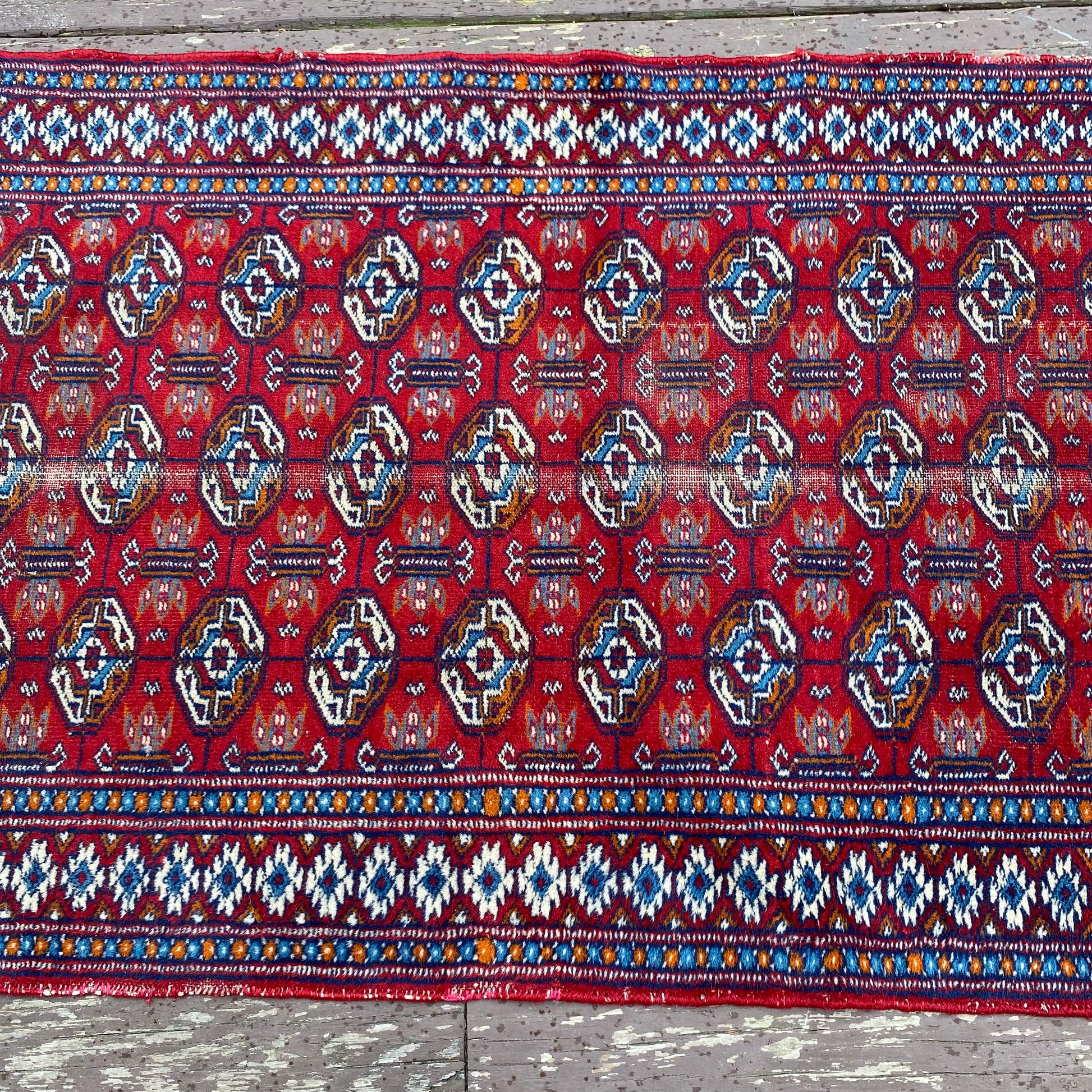 This vintage rug is in fair condition. The design features traditional medallion set in a red field with blue and white highlights. There is heavy wear throughout as seen in the photos.