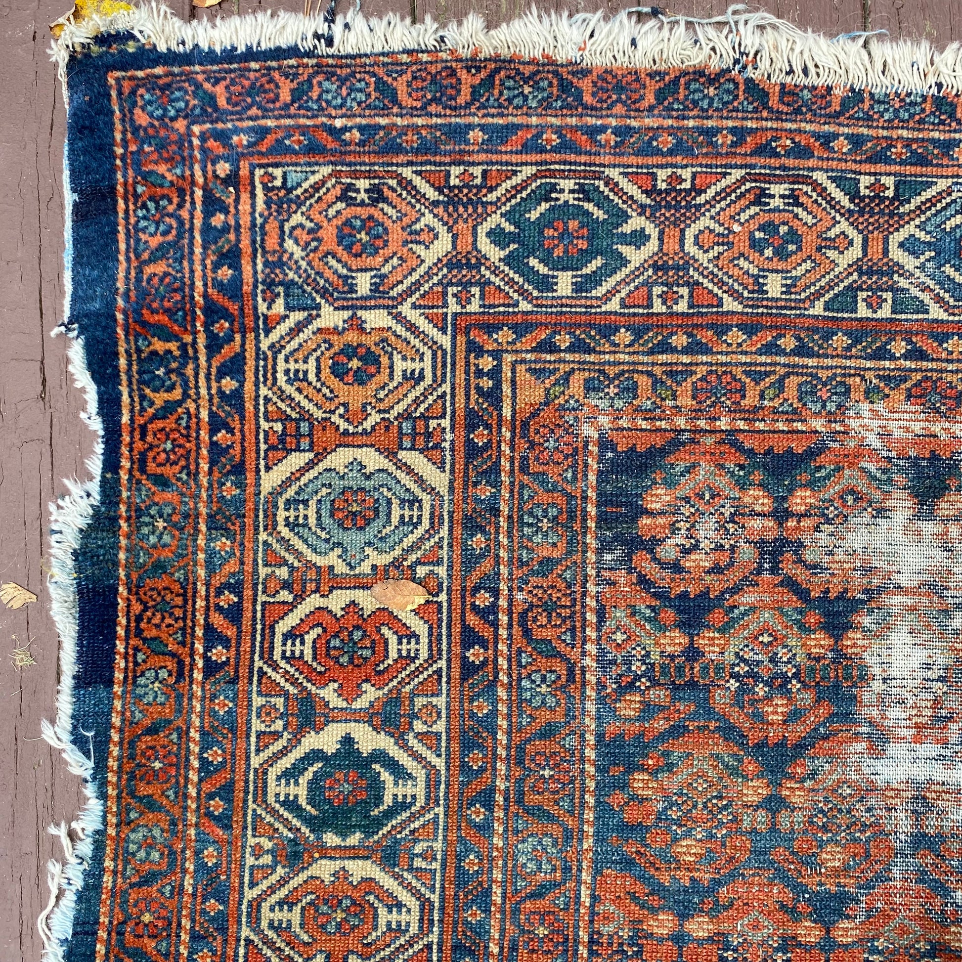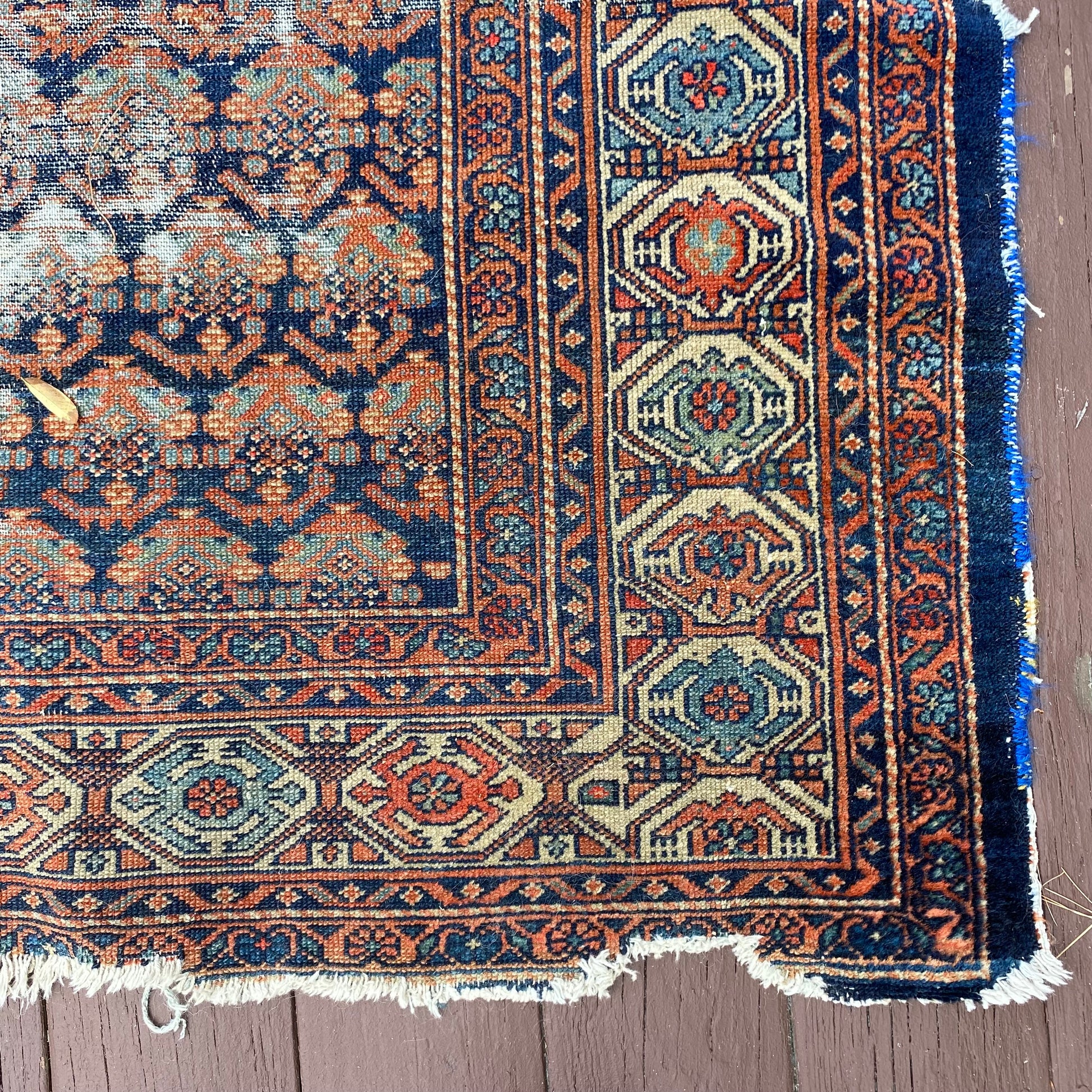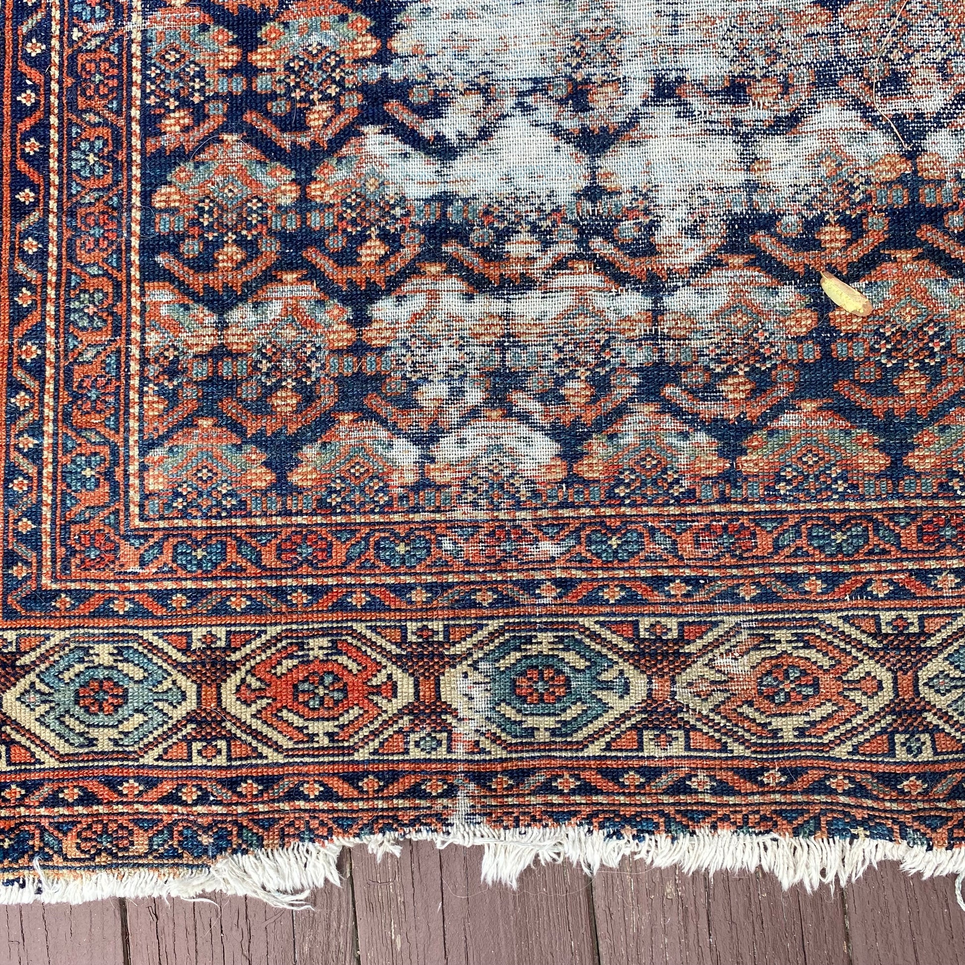 This vintage rug is in poor condition. The design features an all-over pattern set in a blue field with white and soft red highlights. There is heavy wear on the edges, fringe ends and throughout. There is some edge binding missing as seen in the photos.