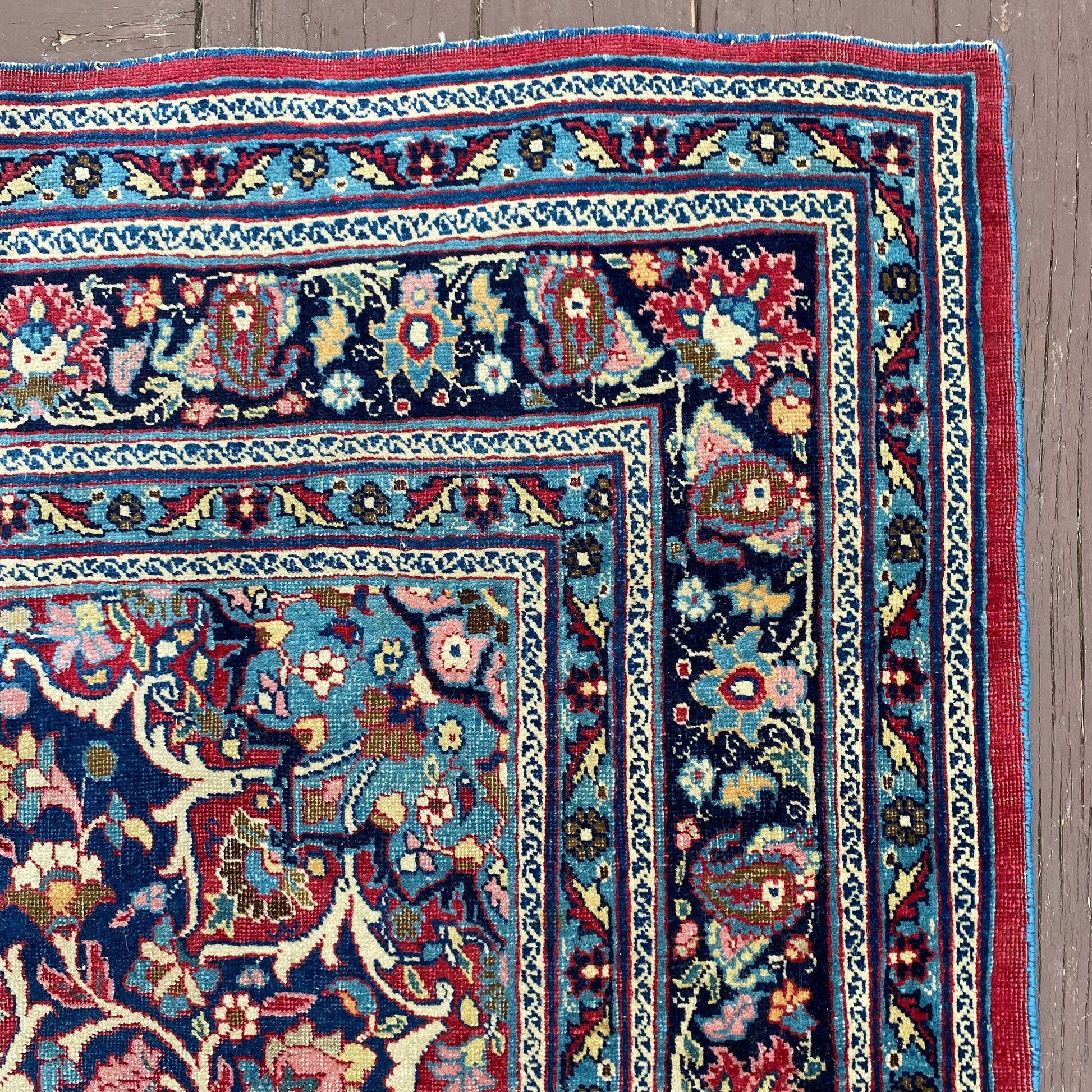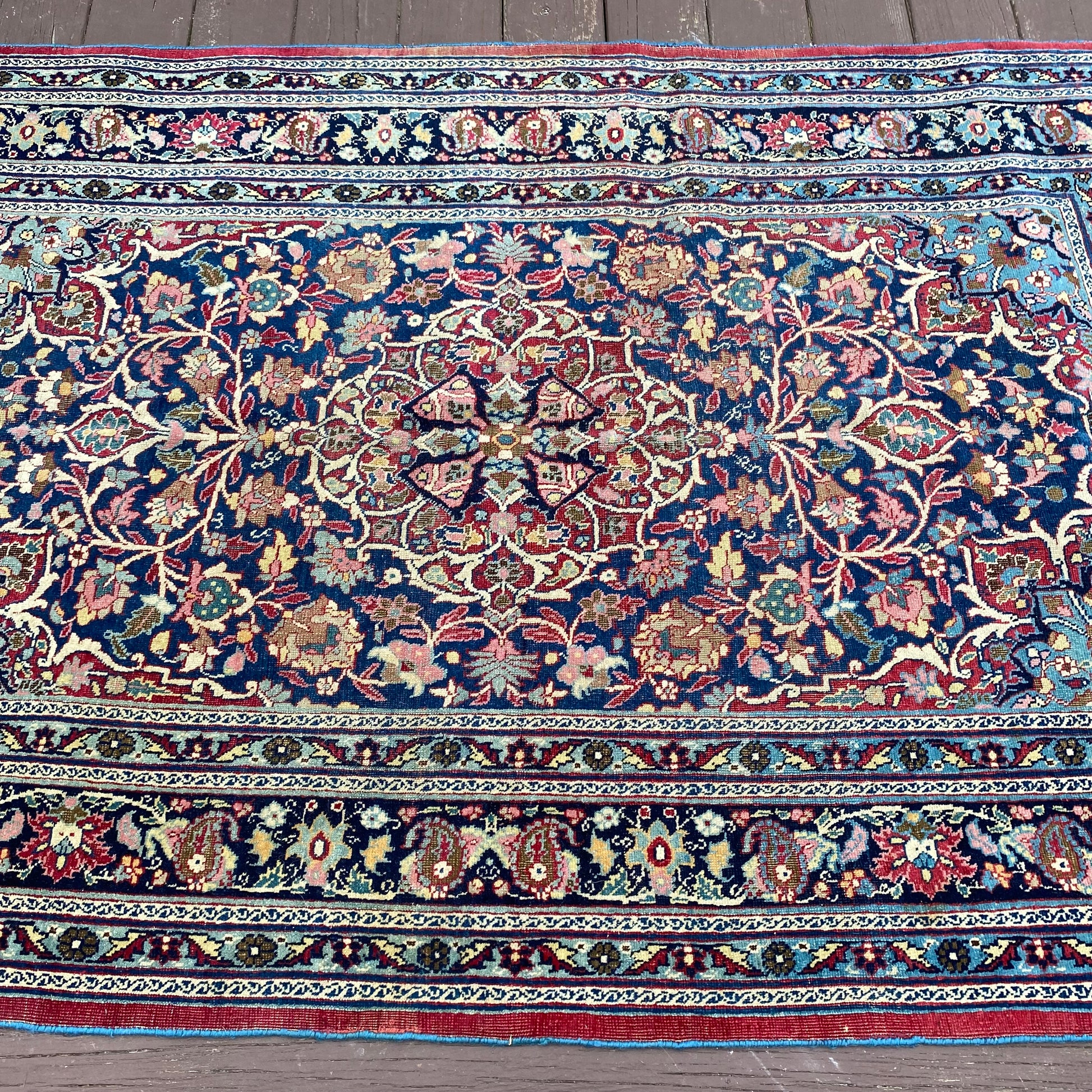 This vintage rug is in very good condition. The design features a central medallion set in a blue field surrounded by a curvilinear design. There is wear on the edges, fringe ends and throughout as seen in the photos.