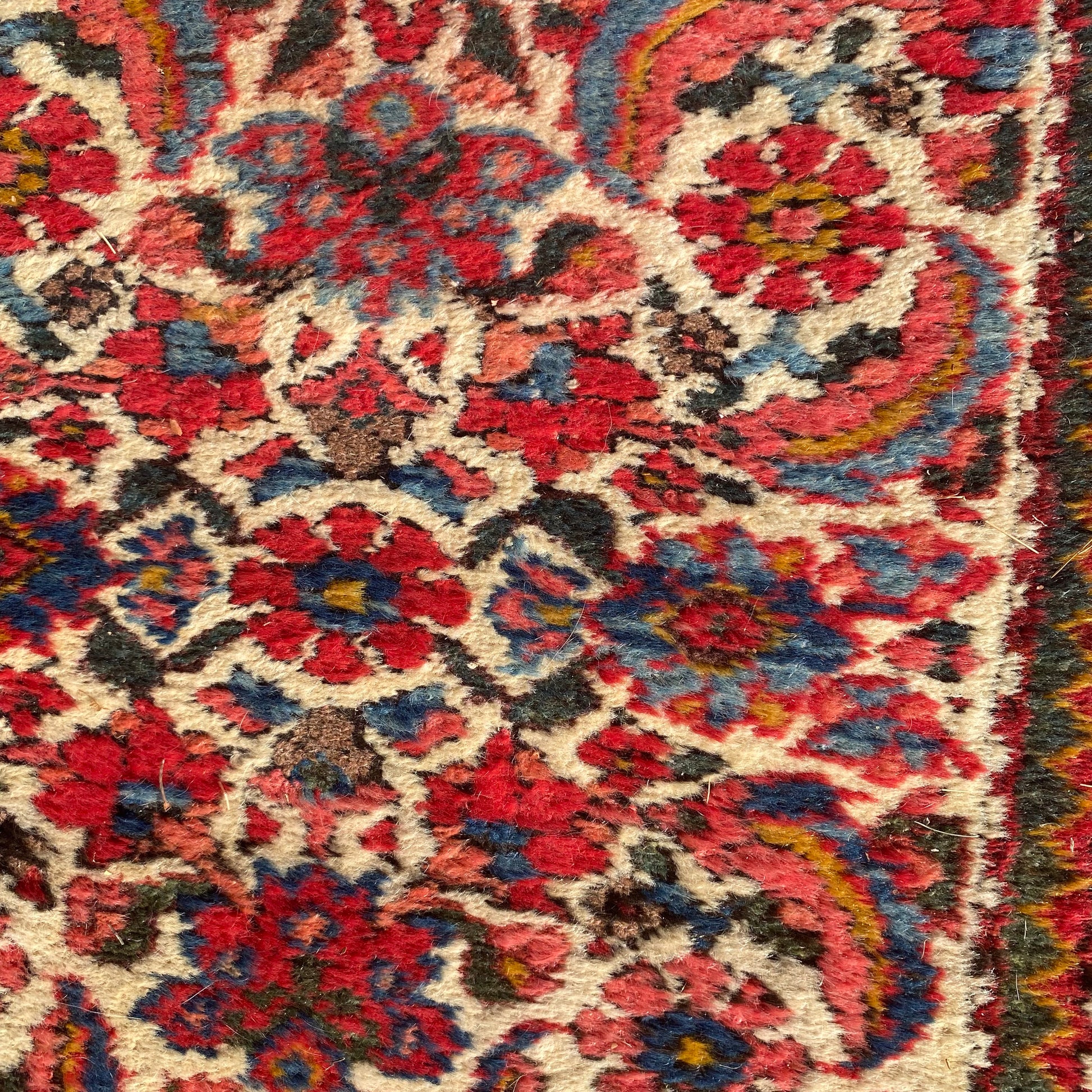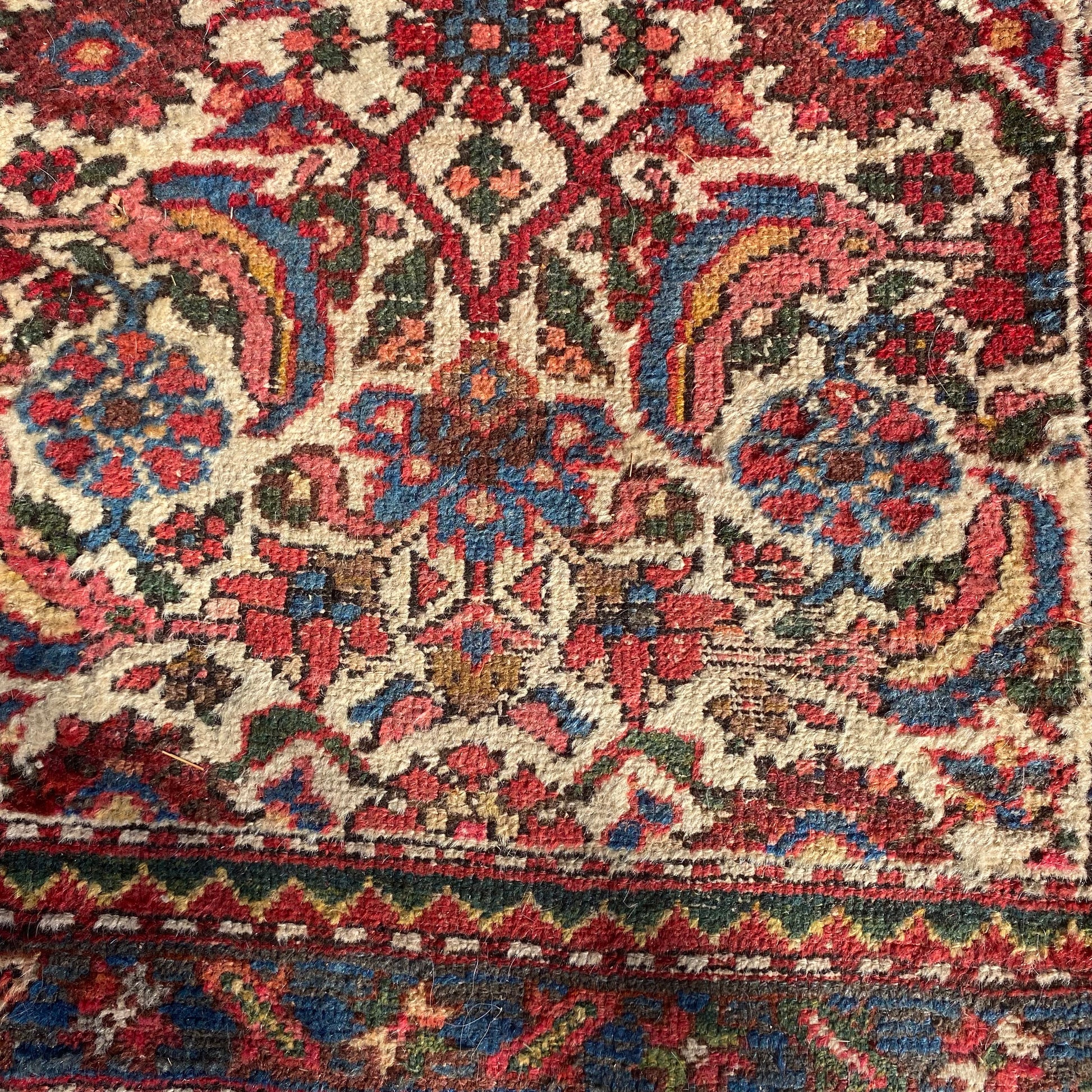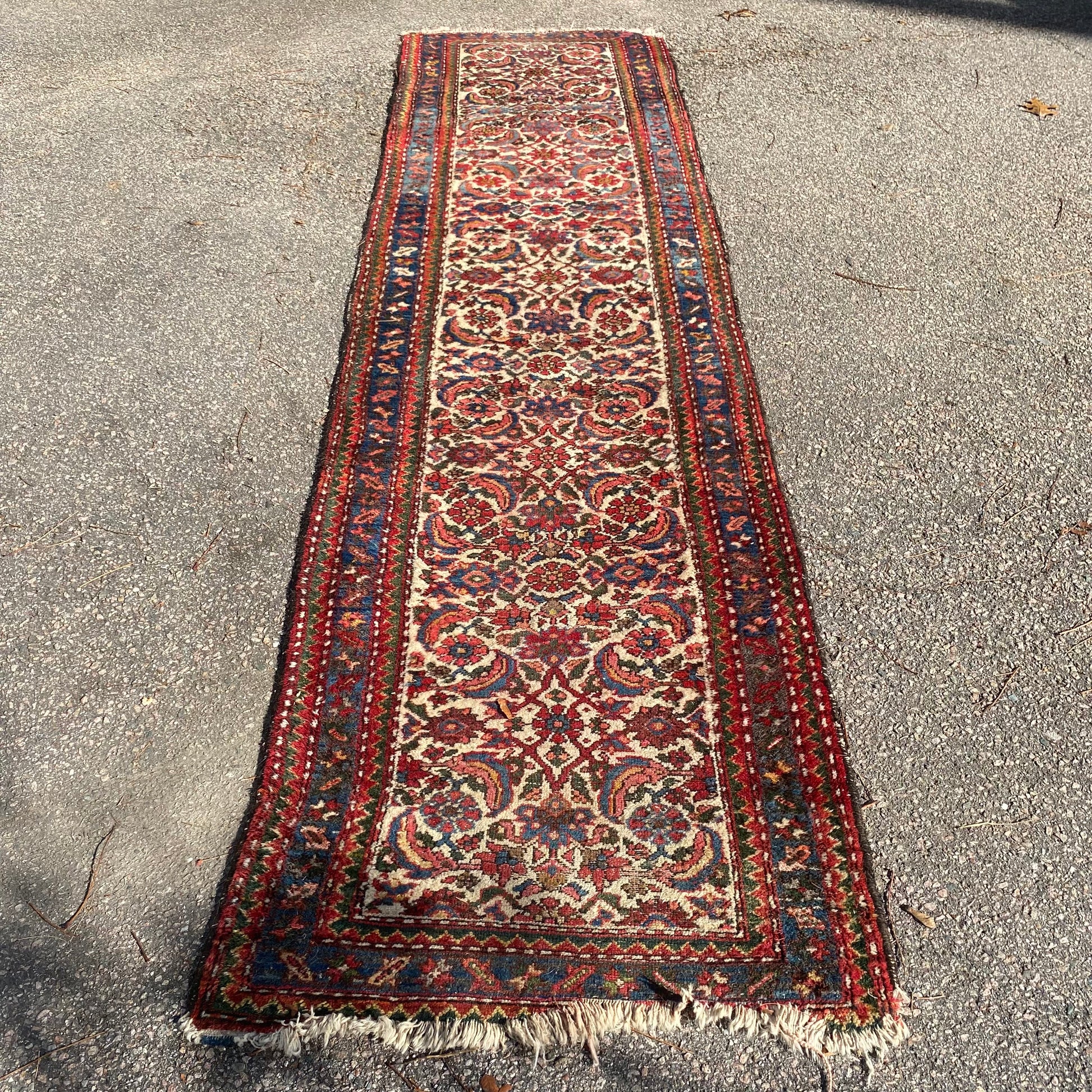 This vintage rug is in fair condition. The design features an all-over pattern set in a white field with blue and red highlights. There is heavy wear on the edges, fringe ends and throughout.
