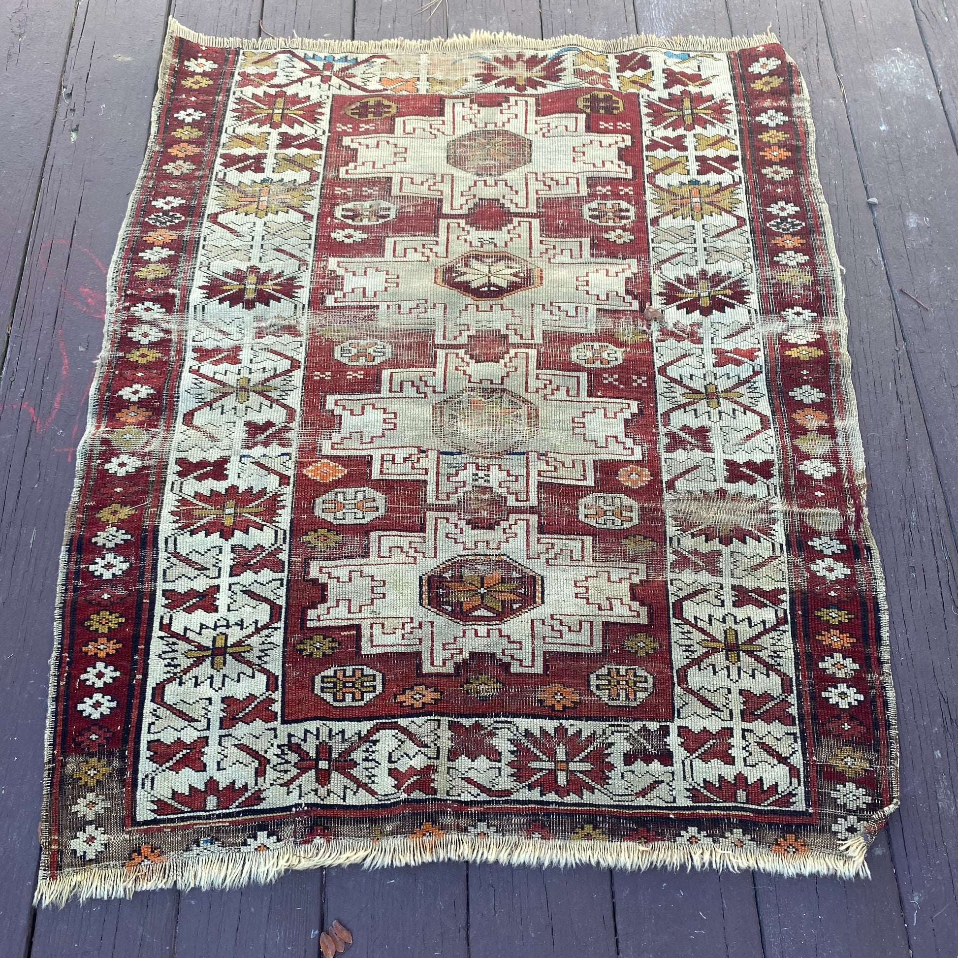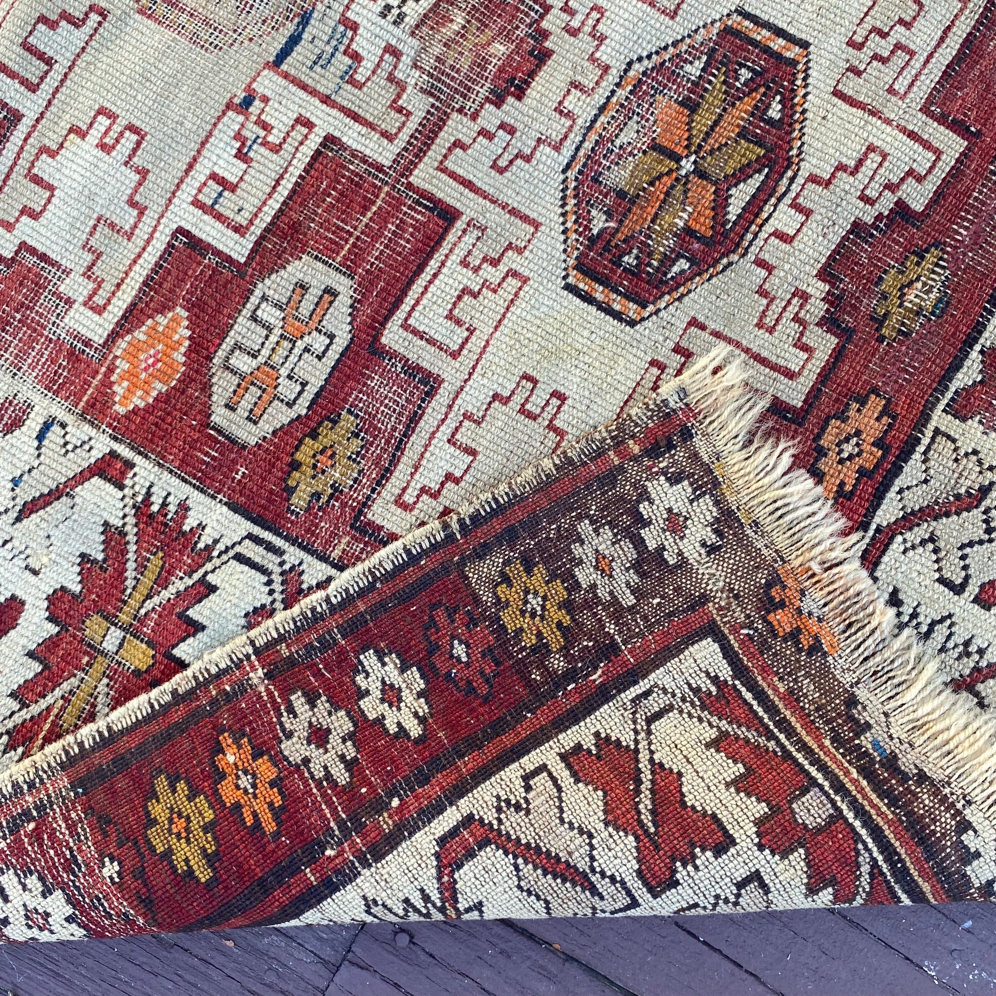 This antique rug is in fair condition. The design features tribal medallions set in a brown field with white and beige highlights. There is wear throughout as seen in the photos.
