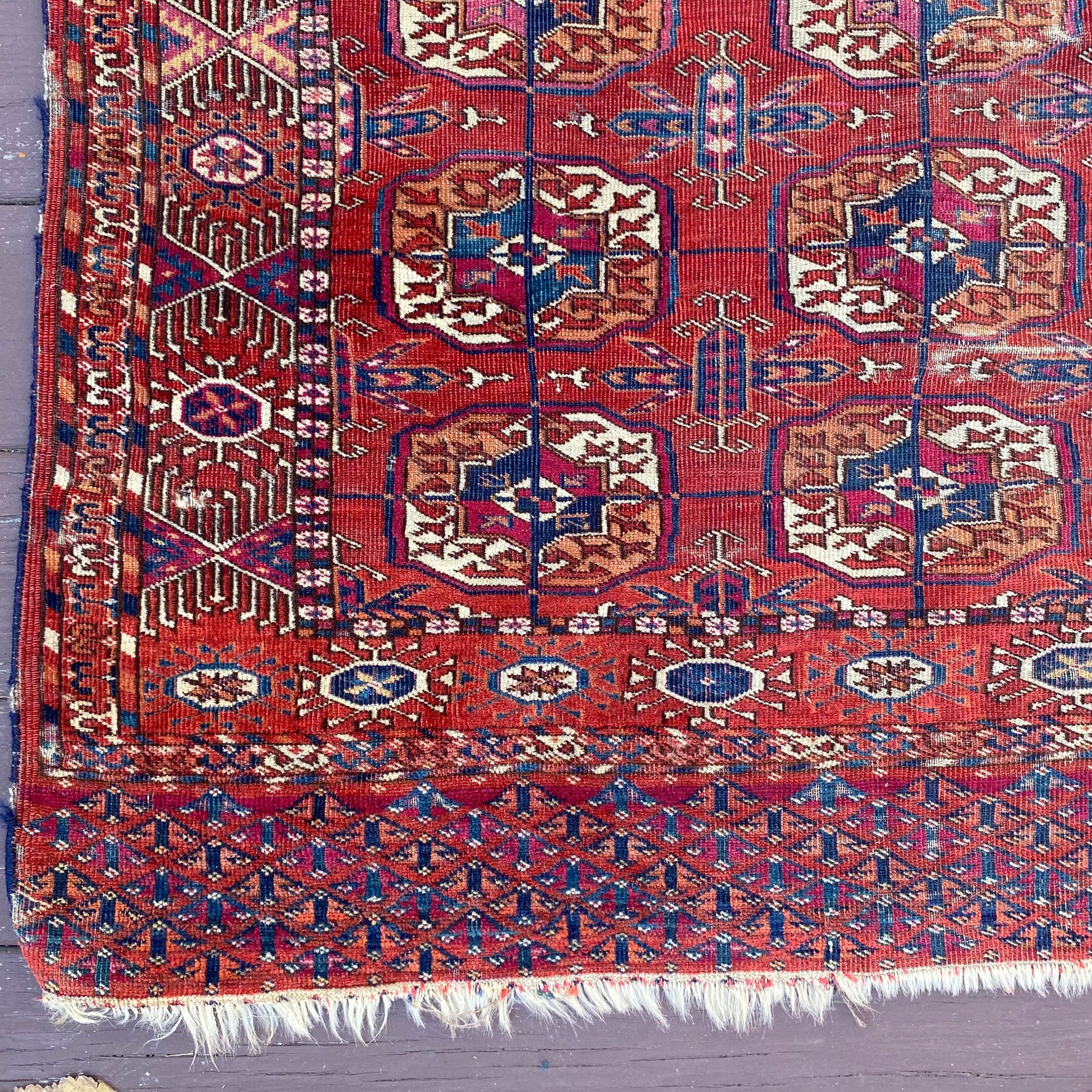 This antique rug is in fair condition. The design features traditional medallions set in a red-brown field with blue and white highlights. There is wear on the edges, fringe ends and throughout.