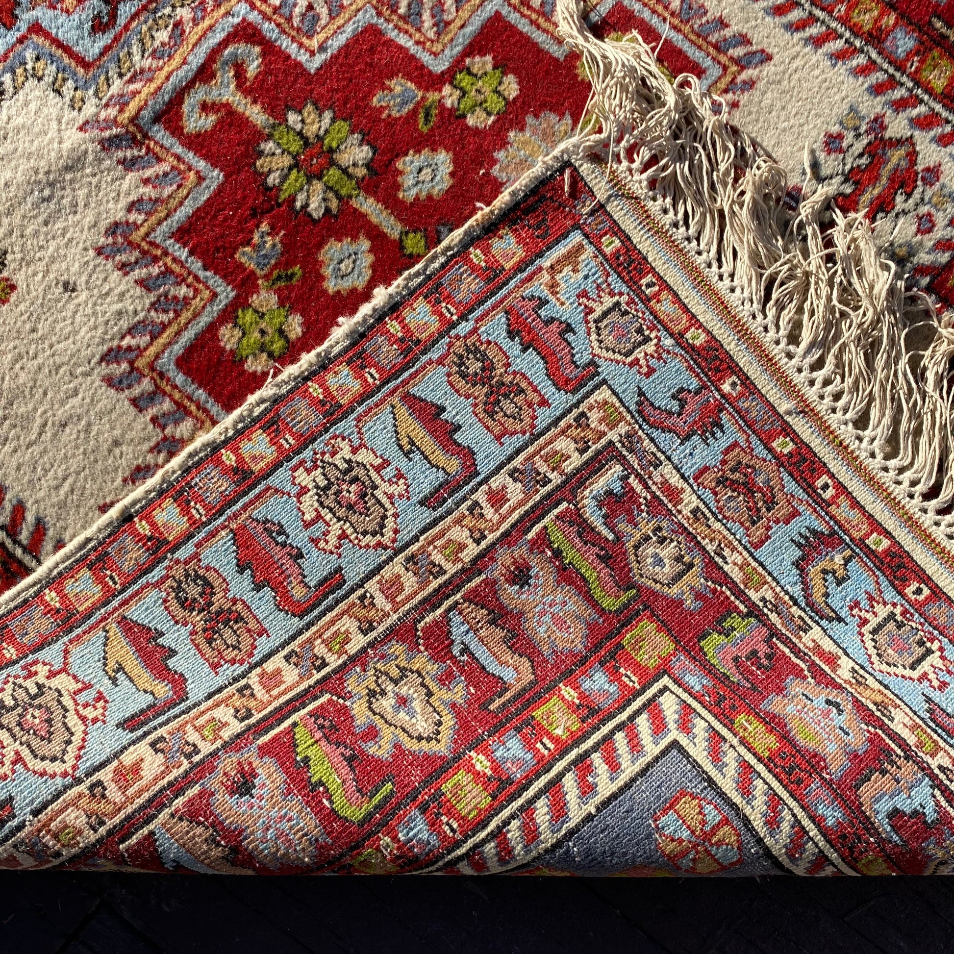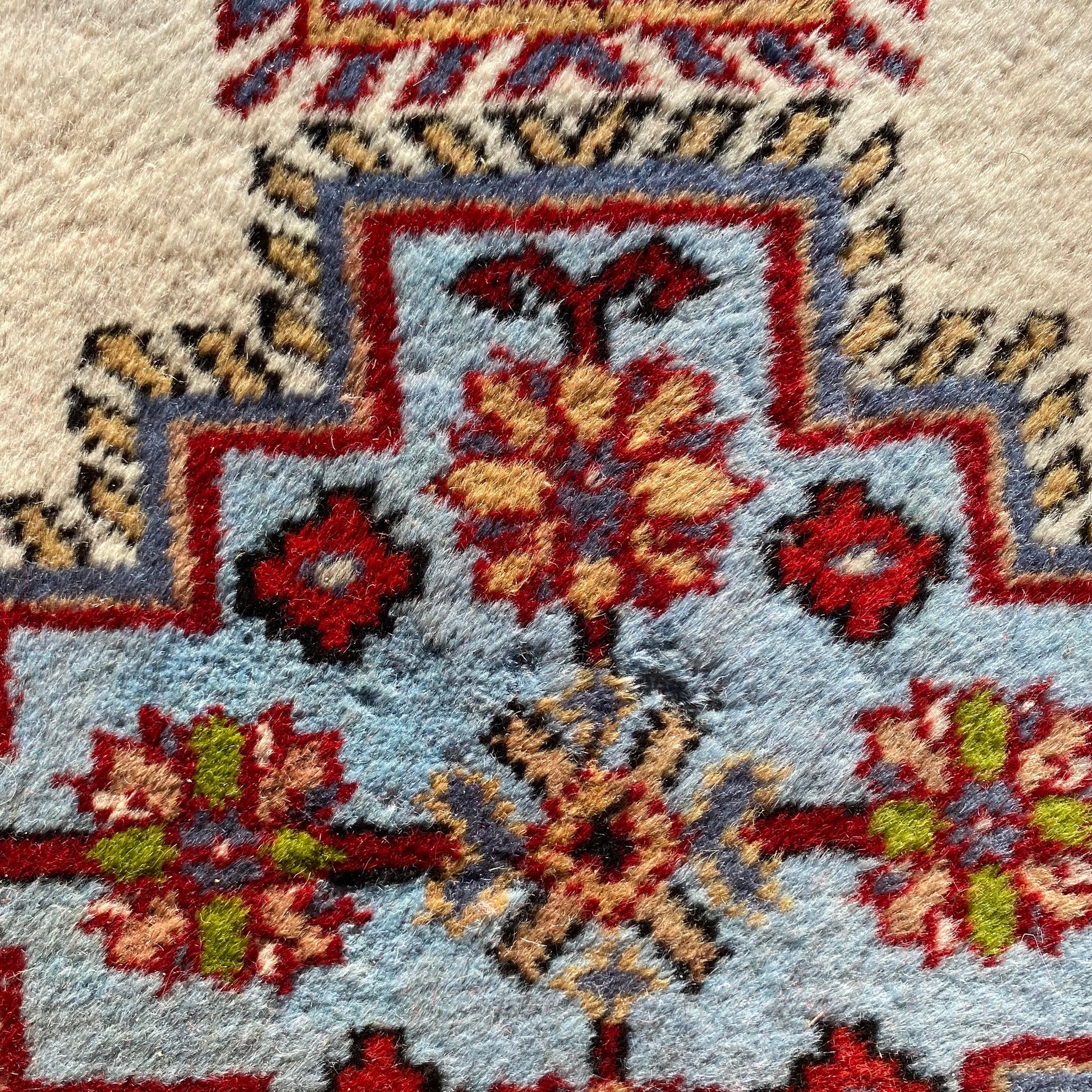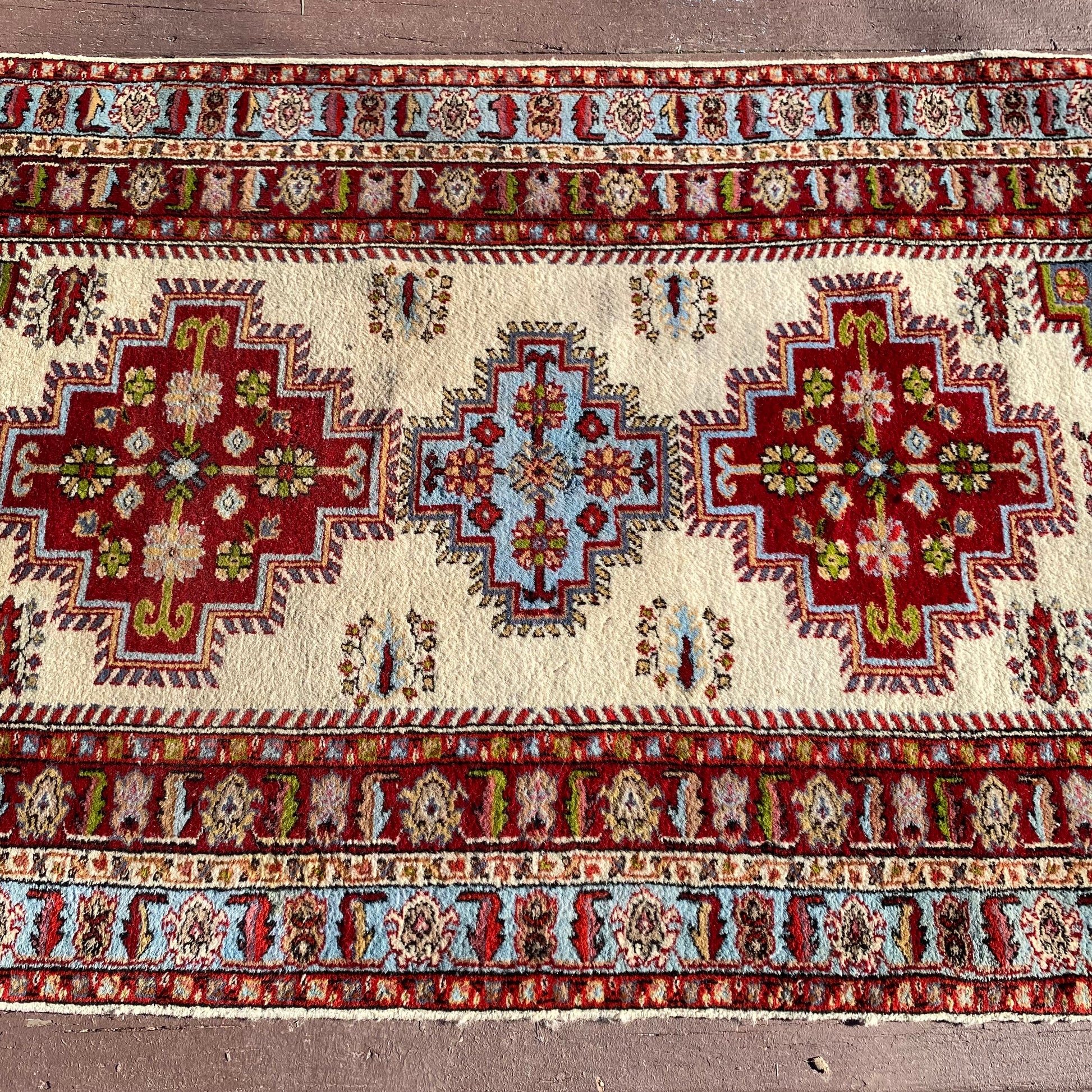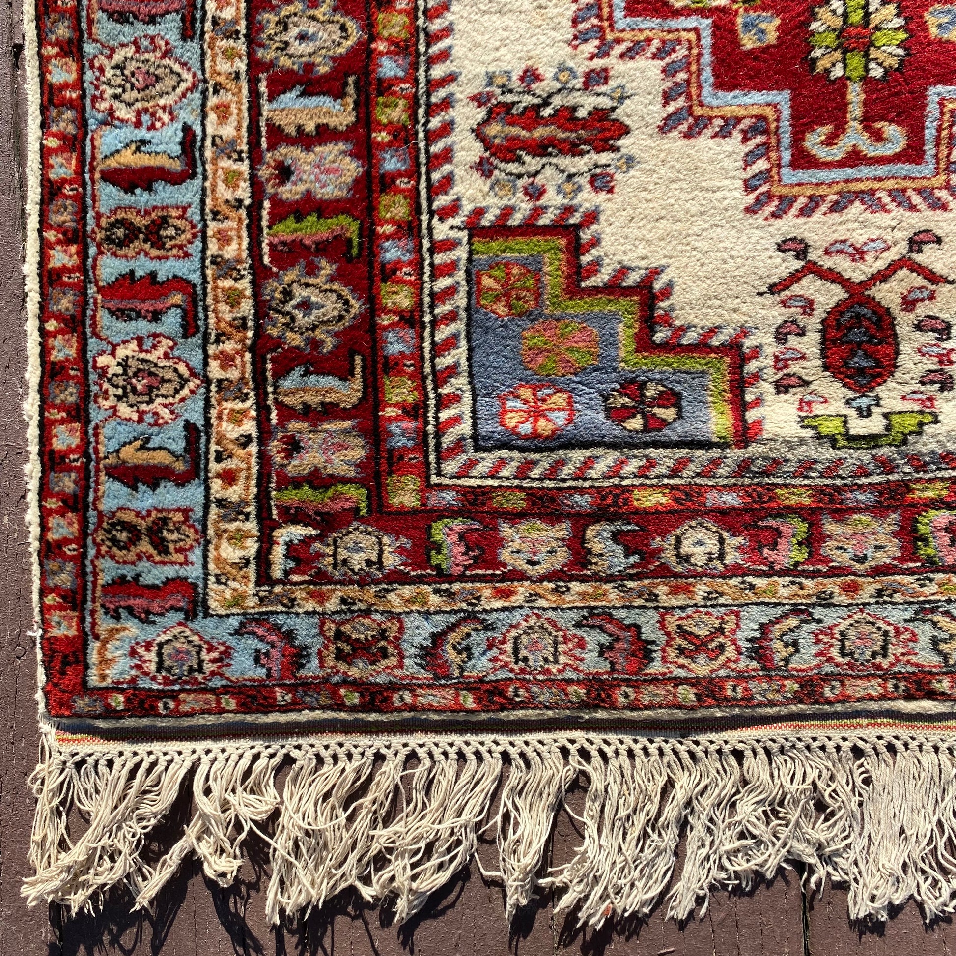 This vintage rug is in fair condition. The design features tribal medallions set in a white field with red and blue highlights. There is wear on the edges, fringe ends and throughout. There are some blemishes and nicks in the pile as seen in the photos.