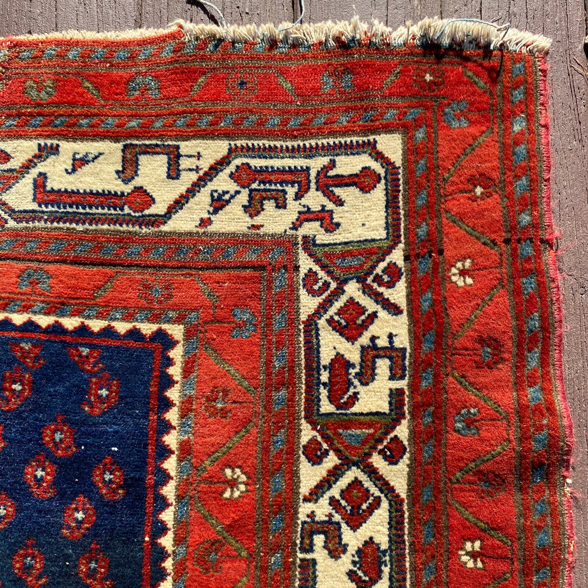 This vintage rug is in very good condition. The design features an all-over boteh pattern set in a red brown field with blue and white highlights. There is wear throughout and some variation in border color as seen in the photos.