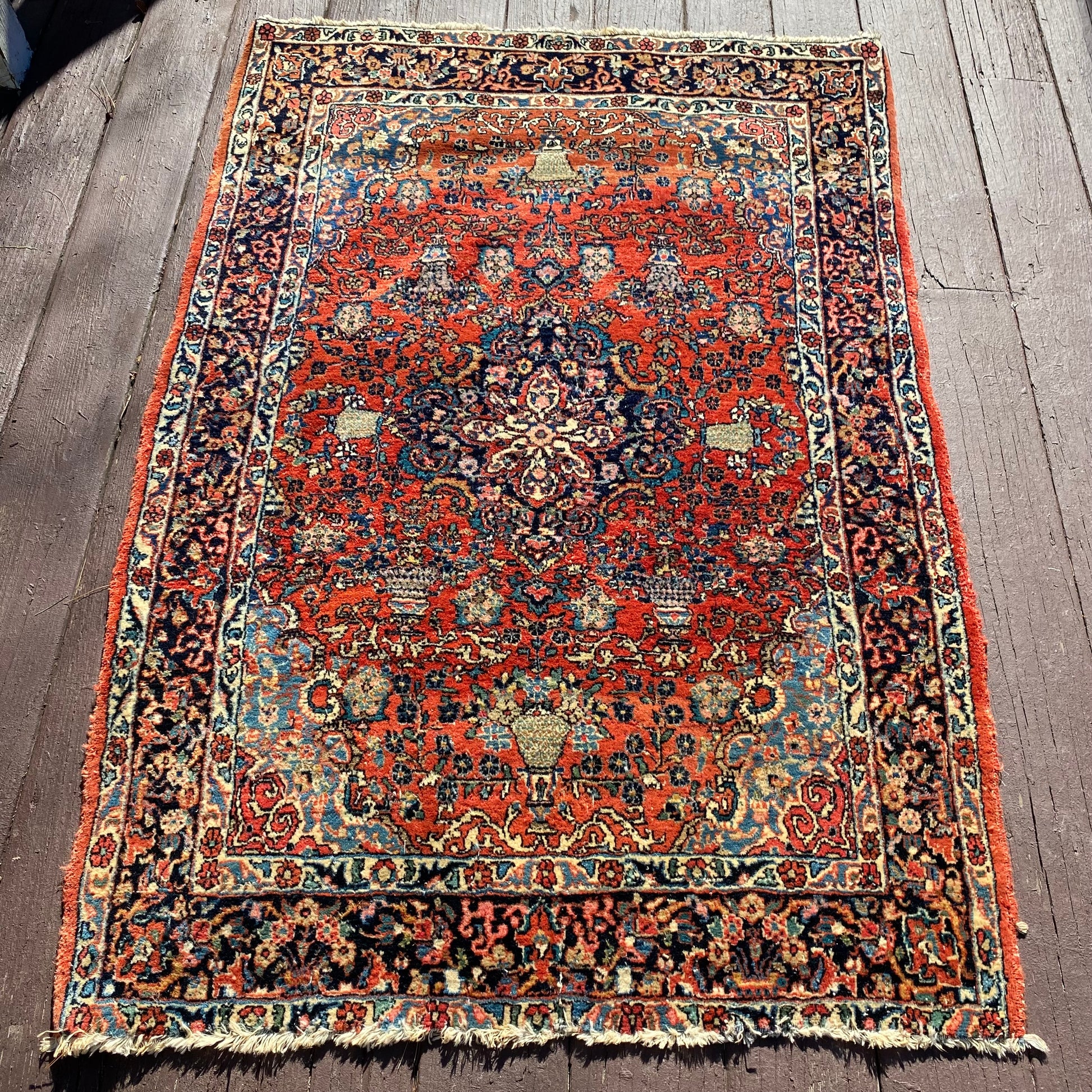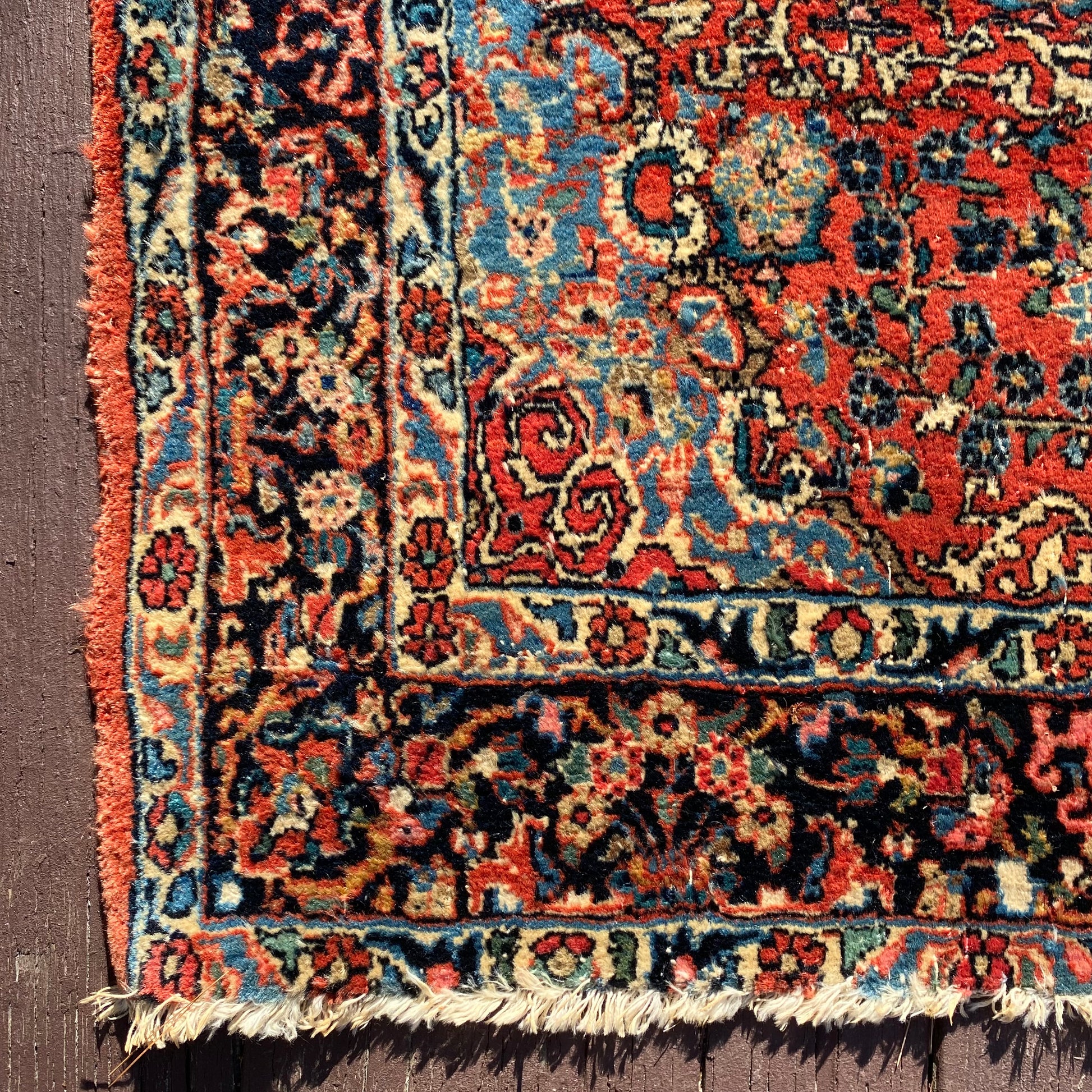 This vintage rug is in good condition. The design features a central medallion set in a red field surrounded by an intricate all-over pattern with blue and cream highlights. There is wear on the edges, fringe ends and throughout as well as some small nicks in the field as seen in the photos.