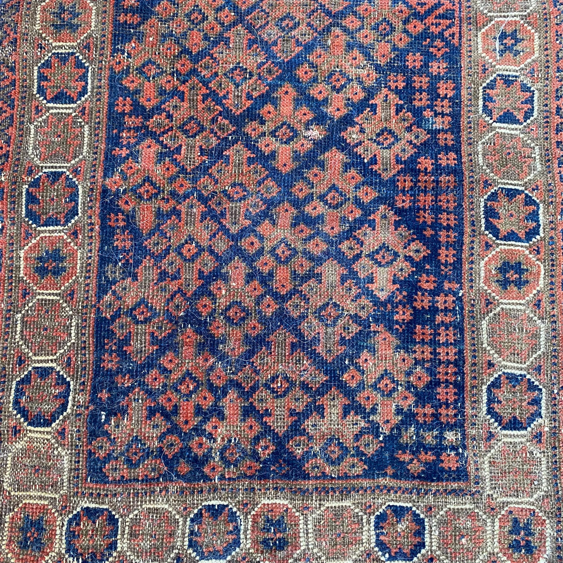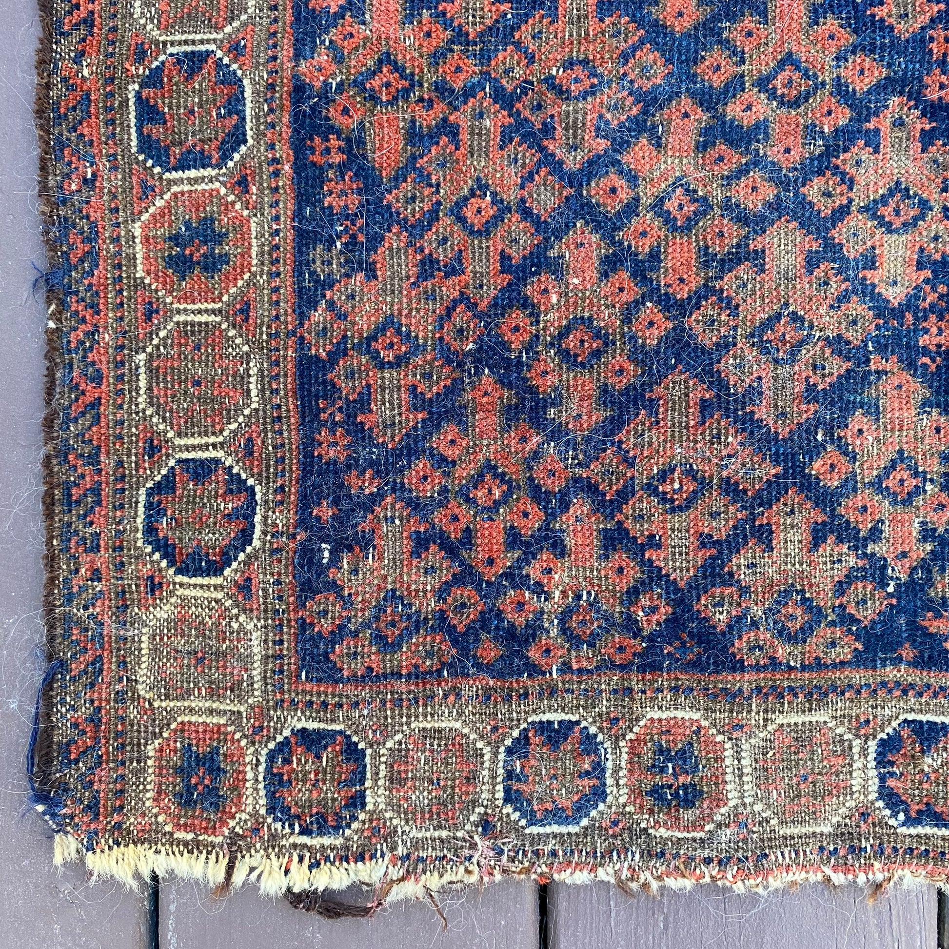 This antique rug is in fair condition. The design features an all-over tribal pattern set in a blue field with brown and white highlights. There is wear on the edges, fringe ends and throughout as seen in the photos.