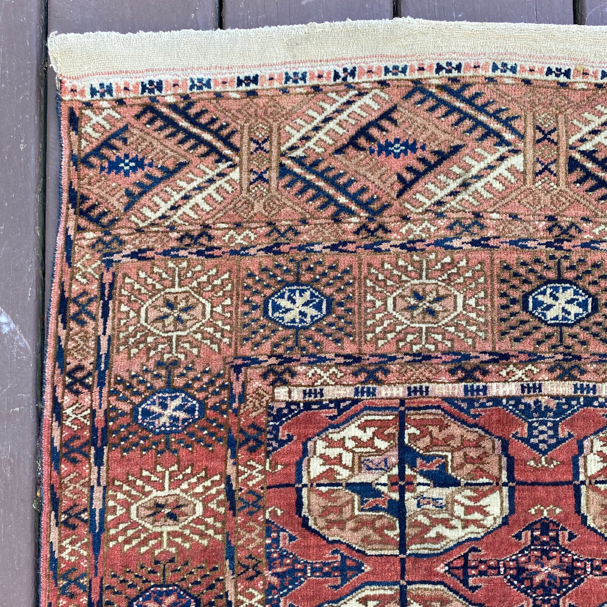 This vintage rug is in good condition. The design features traditional medallions set in a soft red brown field with blue and cream highlights. There is wear on the edges, fringe ends and throughout as well as some edge damage as seen in the photos.