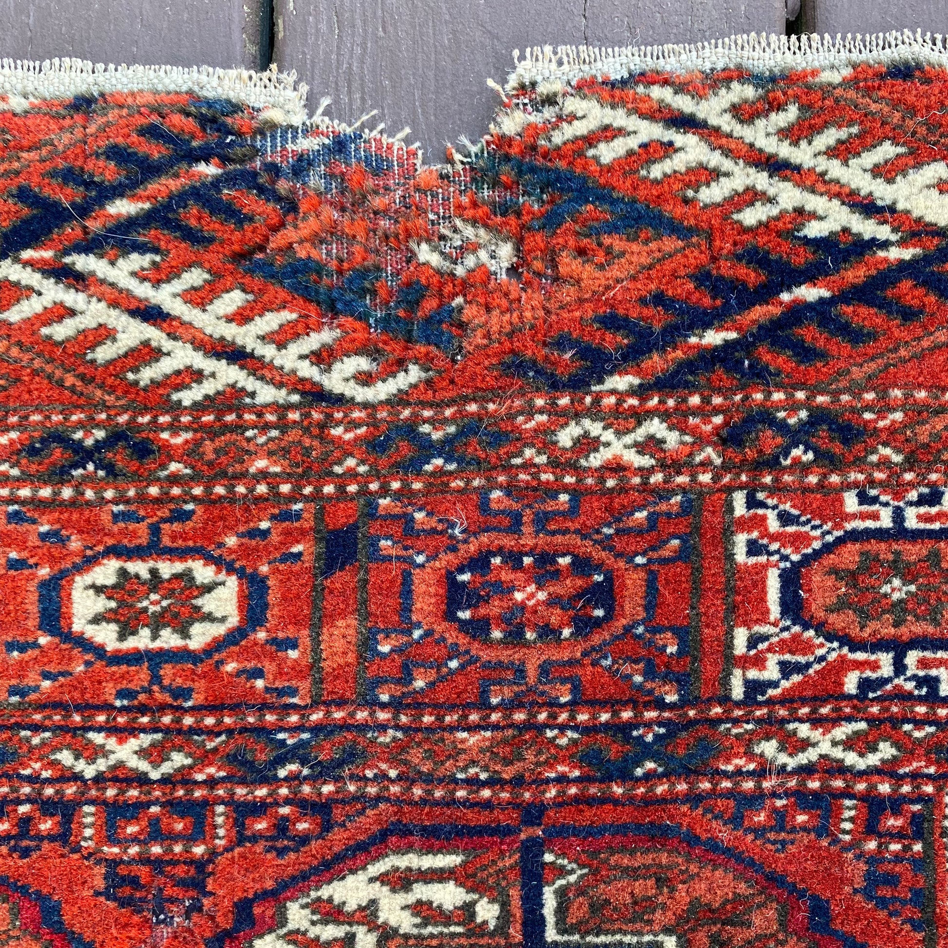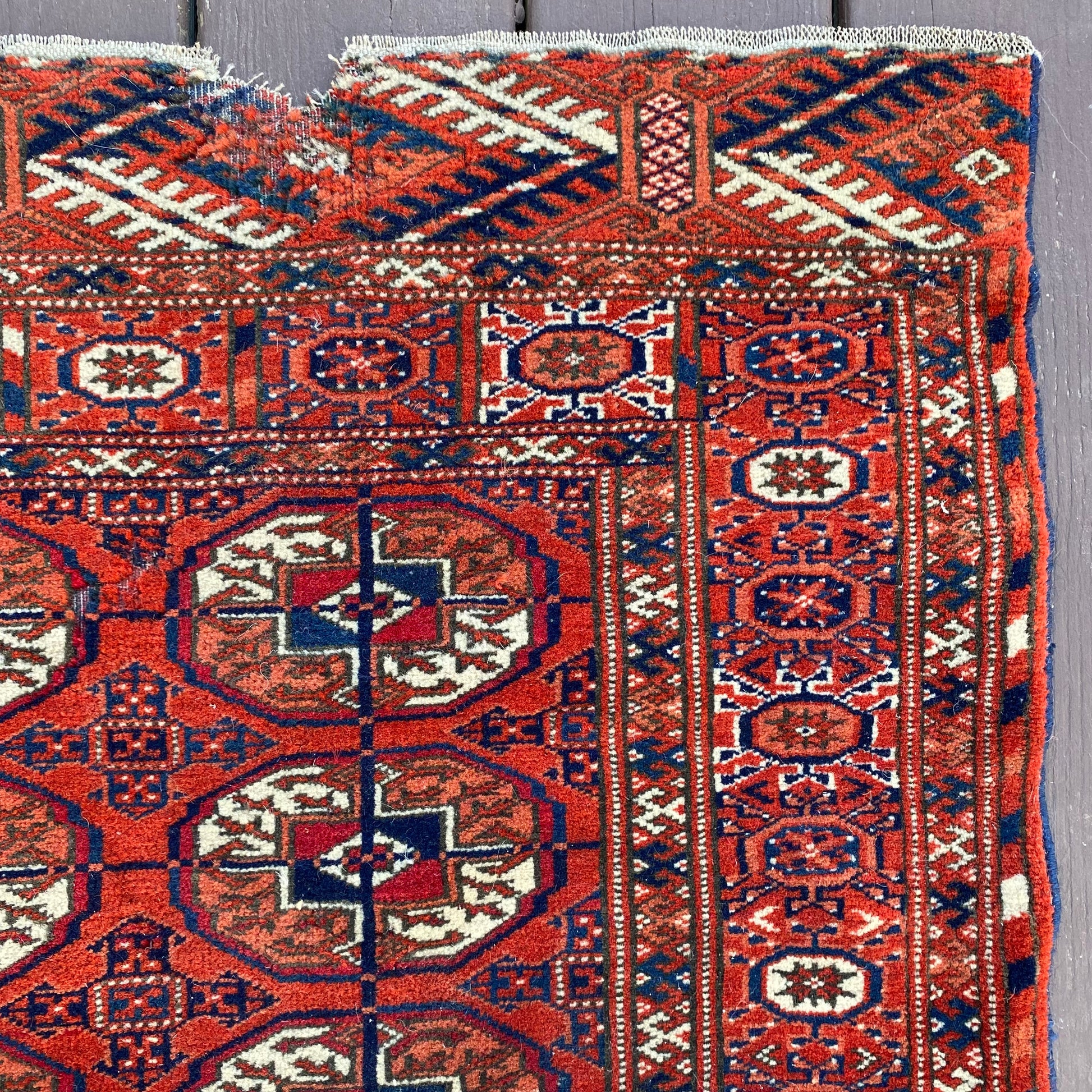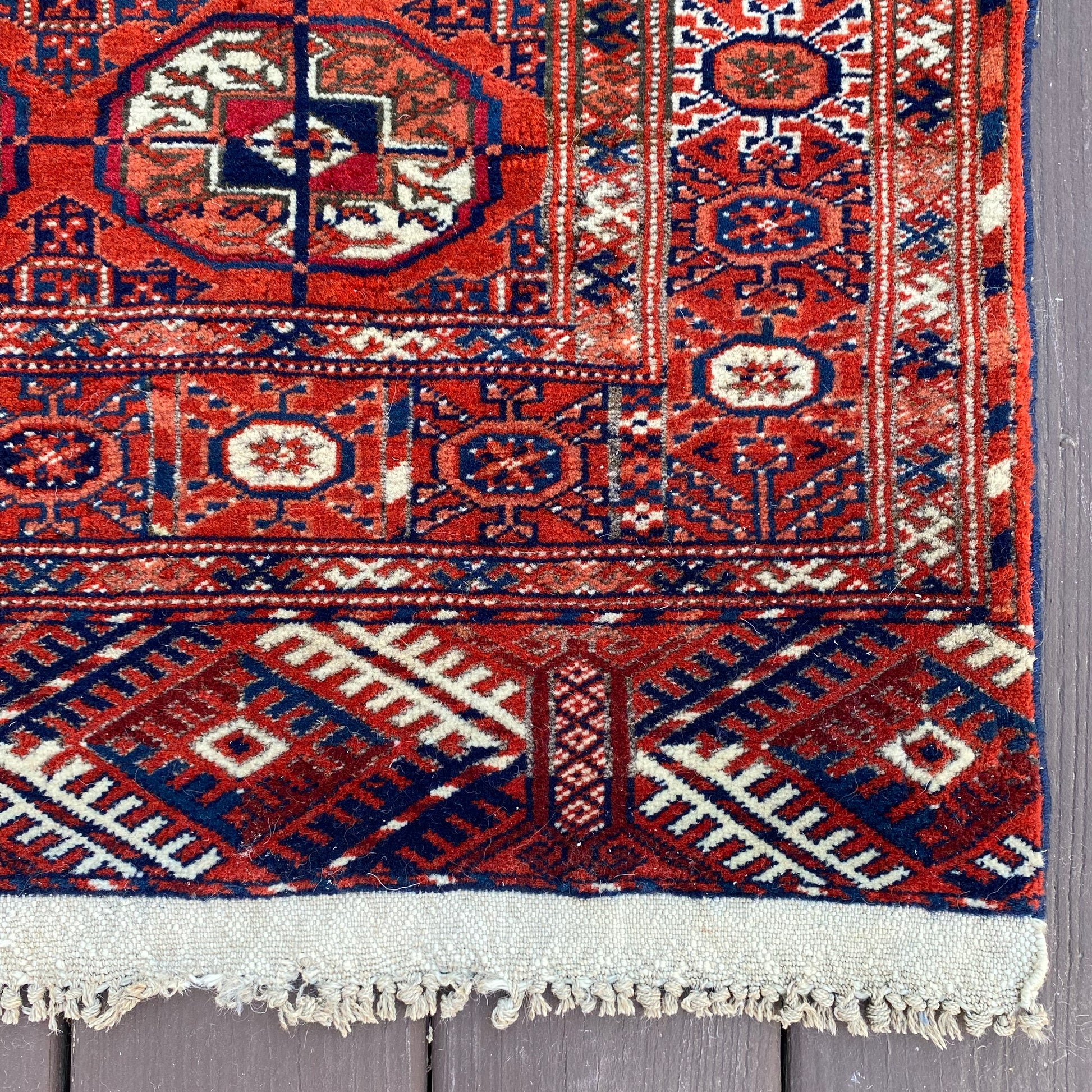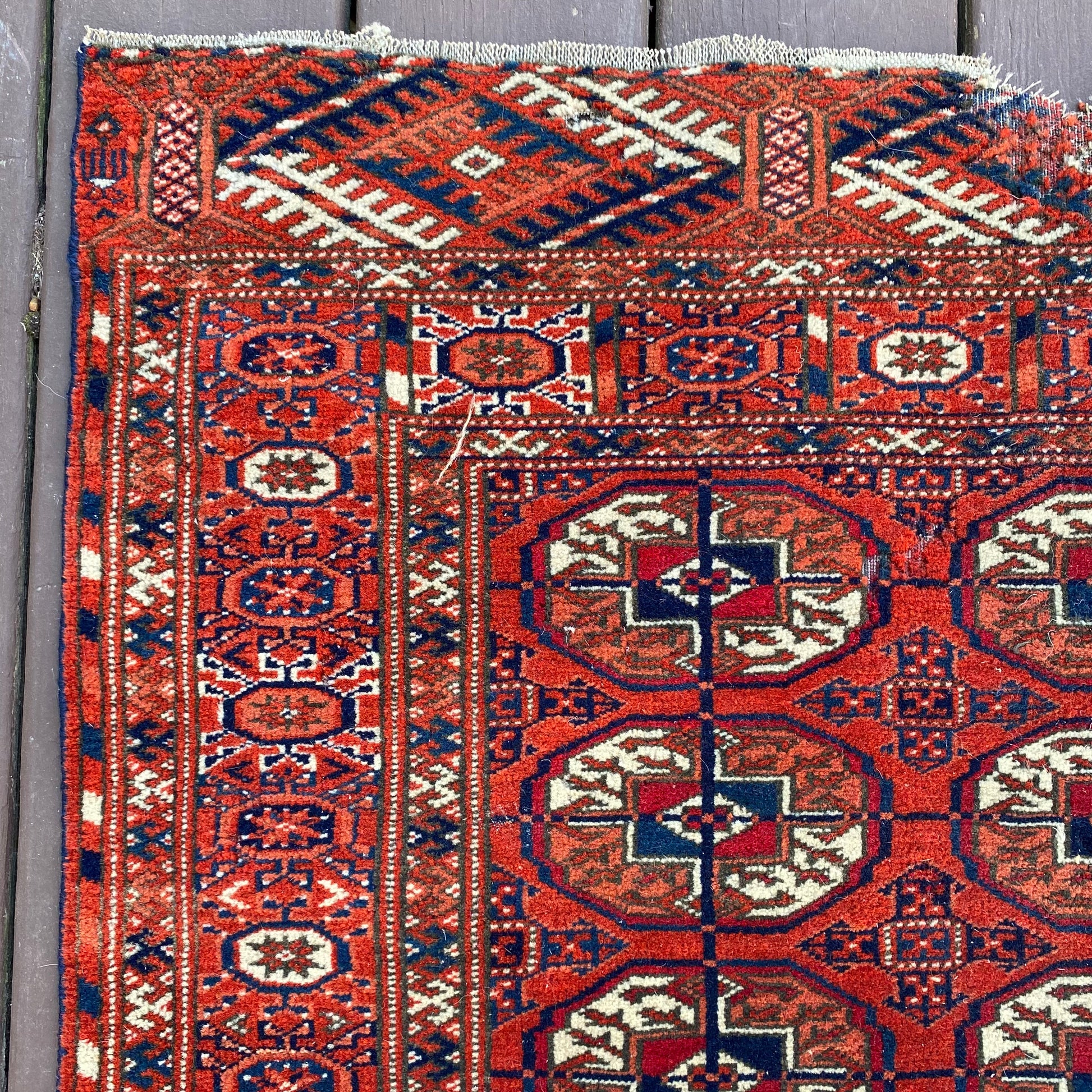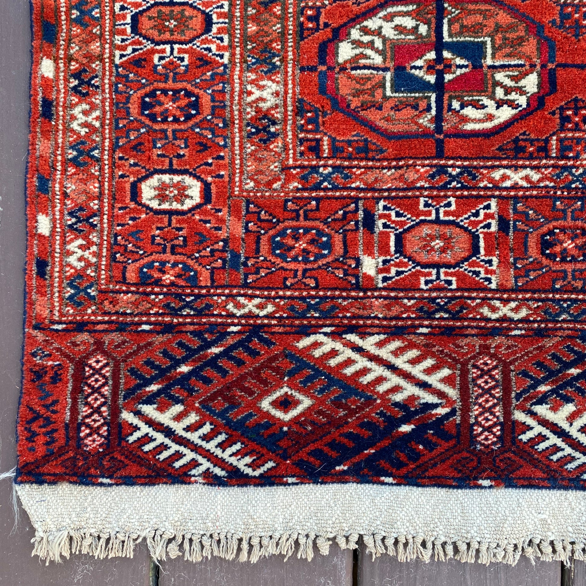 This vintage rug is in good condition. The design features traditional medallions set in a red brown field with blue and white highlights. There is wear on the edges, fringe ends and throughout as seen in the photos. One end is missing fringe as seen in the photos.